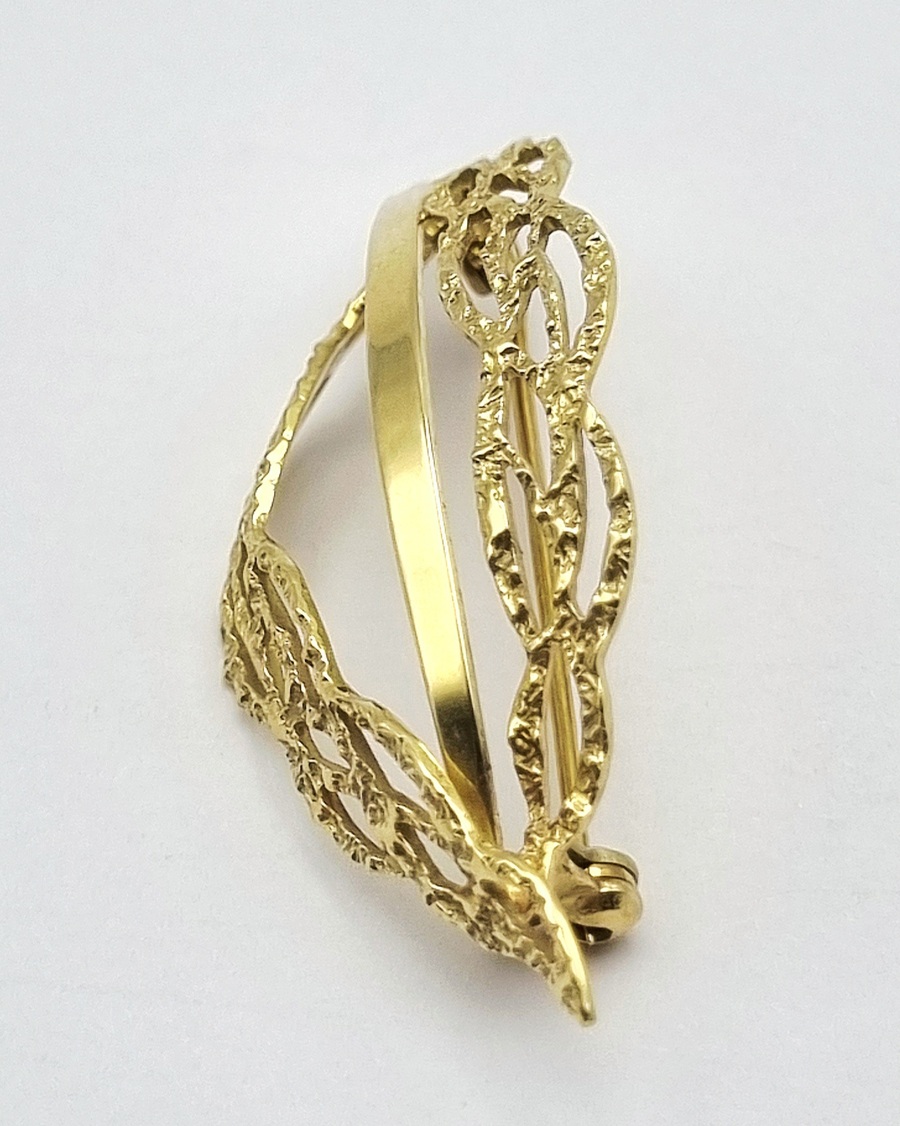 Gouden 14-karaats broche uitgevoerd in een modern stijl, daterend tweede helft 20e eeuw. Het sieraad toont een abstract ontwerp waarbij de opengewerkte zijden zijn voorzien van organische textuur. De centrale gepolijste baan vormt een contrast met de bewerkte randen. De geelgouden broche is aan de achterzijde voorzien van het 585 goudkeurmerk. Geïnteresseerd? Bezoek onze kijkdagen op 10, 11 en 12 april van 11:00 tot 17:00 uur! |
