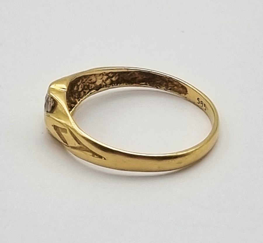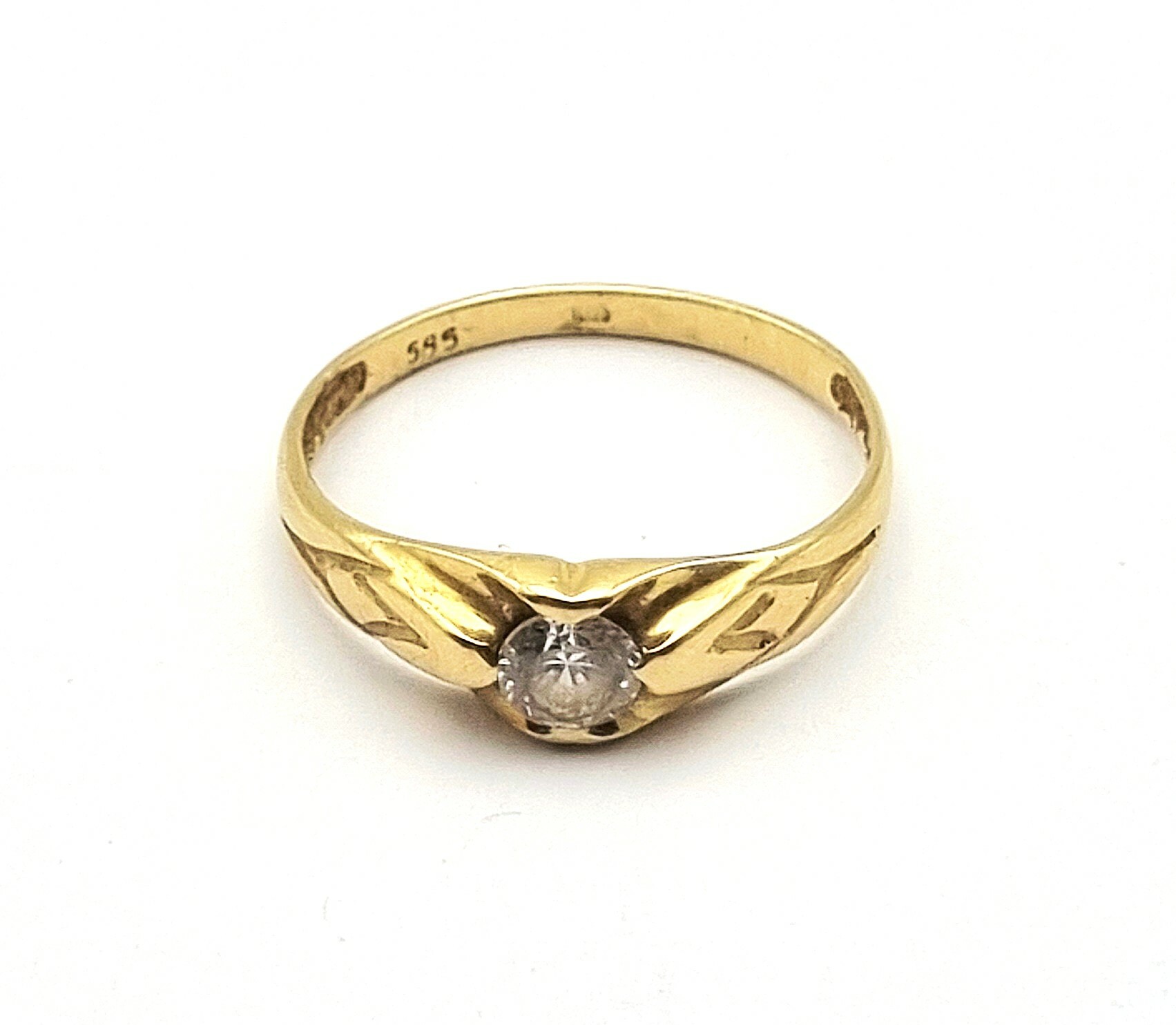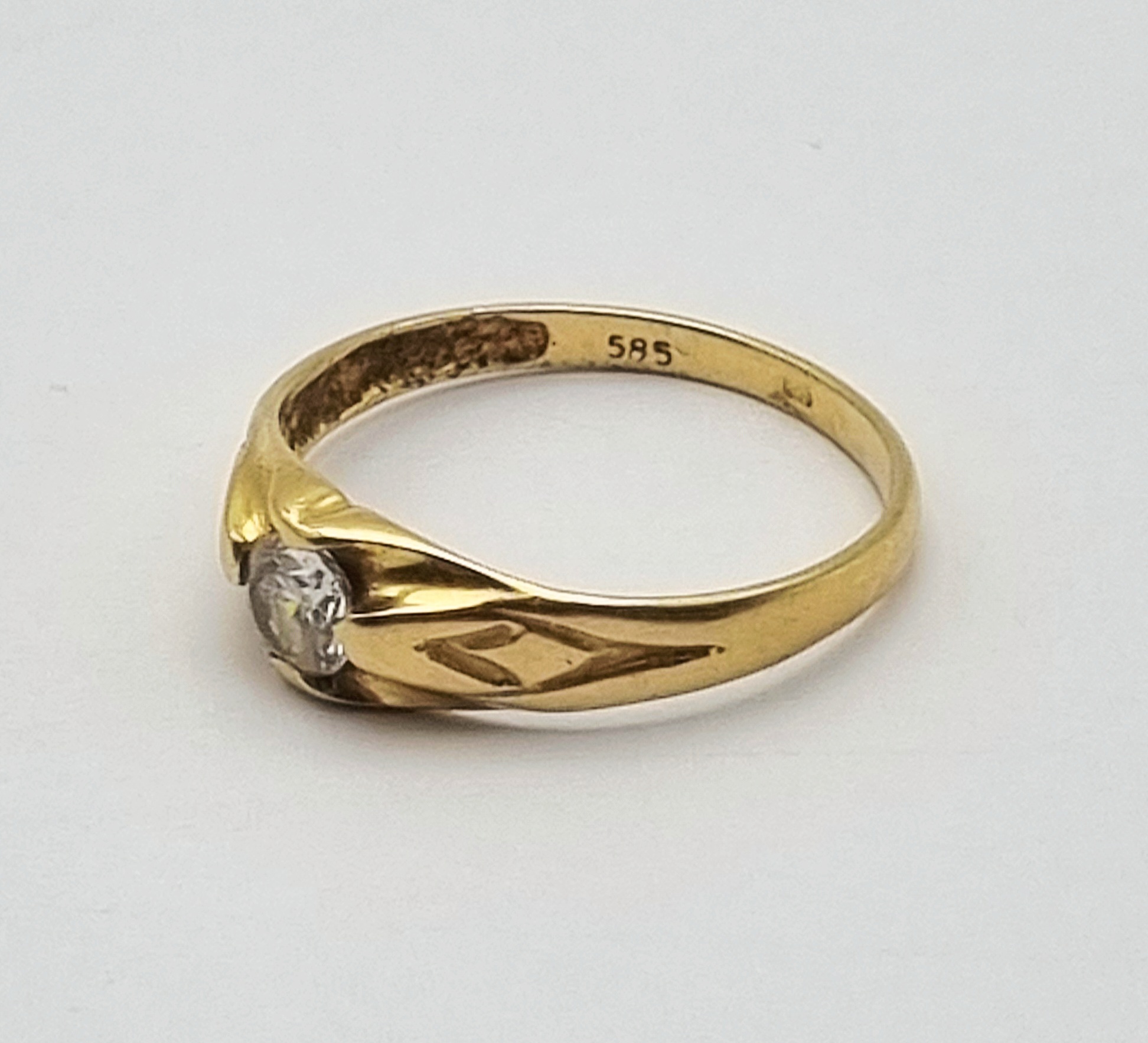 Gouden 14-karaats ring met een centrale steen in briljant slijpsel, gevat in een robuuste kastzetting. De geelgouden band loopt naar de bovenzijde breed uit en is gedecoreerd met gestileerde geometrische graveringen op de schouders. De ring is aan de binnenzijde voorzien van het 585 gehaltemerk, datering midden 20e eeuw. Geïnteresseerd? Bezoek onze kijkdagen op 10, 11 en 12 april van 11:00 tot 17:00 uur! |