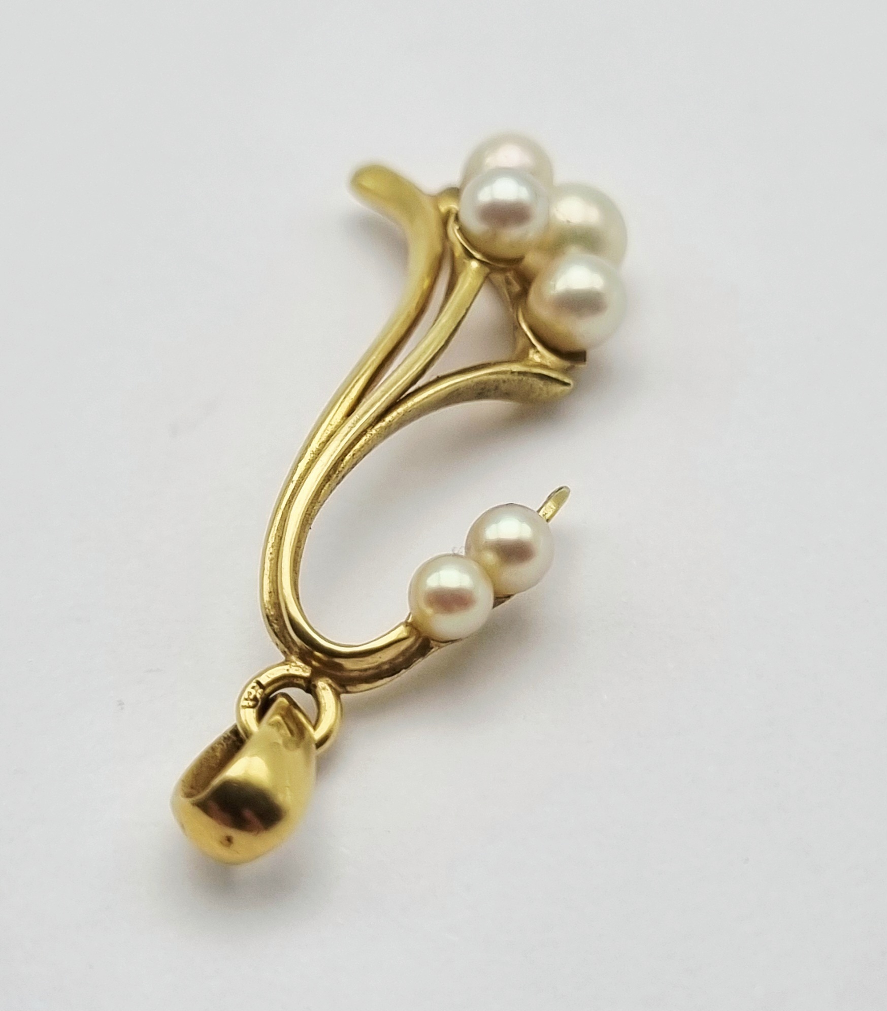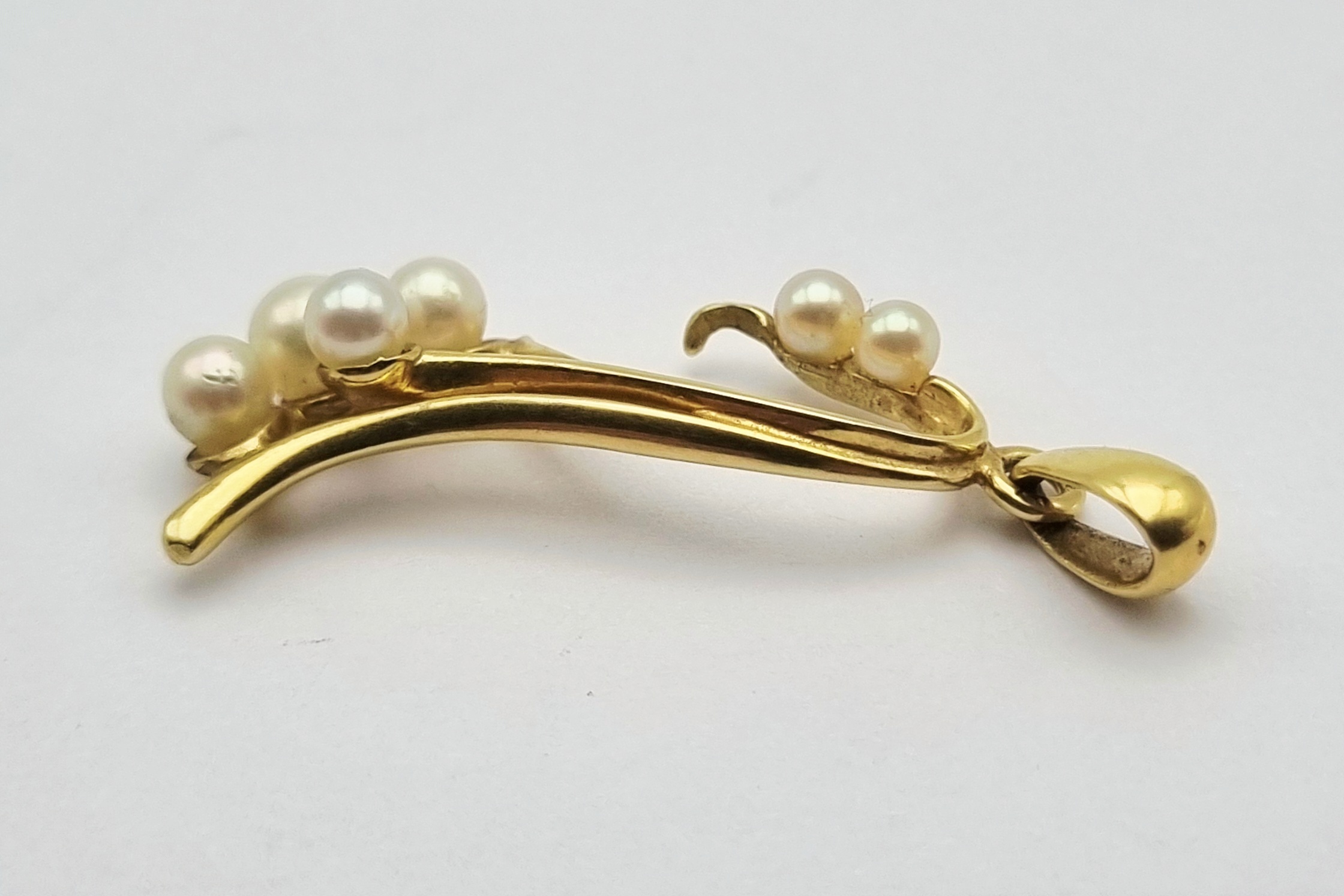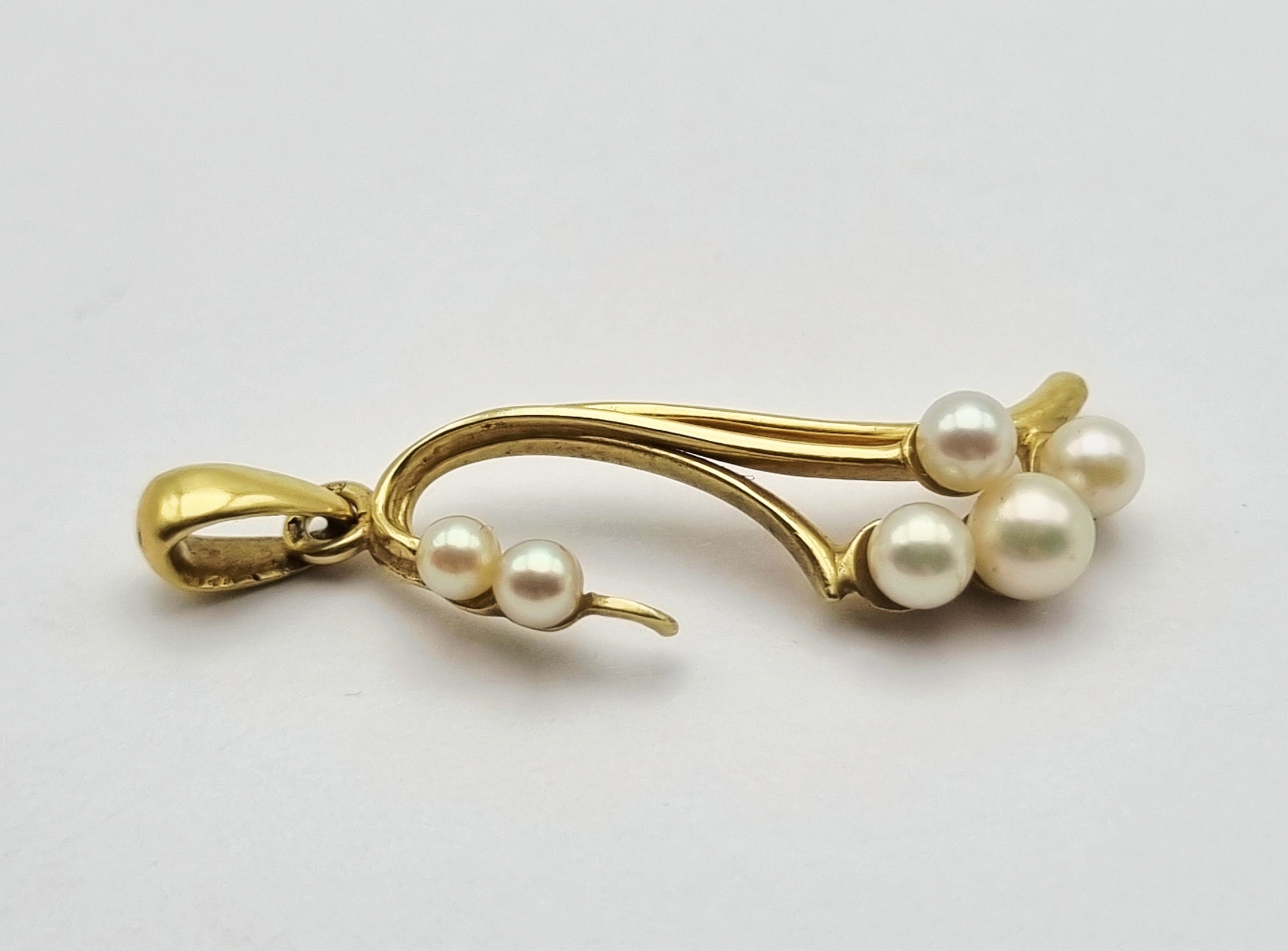 Gouden 14-karaats hanger uitgevoerd in een organische vormgeving, bezet met zes witte cultivé parels van uiteenlopende grootte. De vloeiende lijnen van het geelgouden montuur monden uit in gestileerde takken waaraan de parels zijn bevestigd. De hanger is gemerkt met eikenblad op het oog, datering omstreeks 1970. Wil je direct deelnemen? Plaats vanaf 3 april alvast een schriftelijk bod via onze website! |