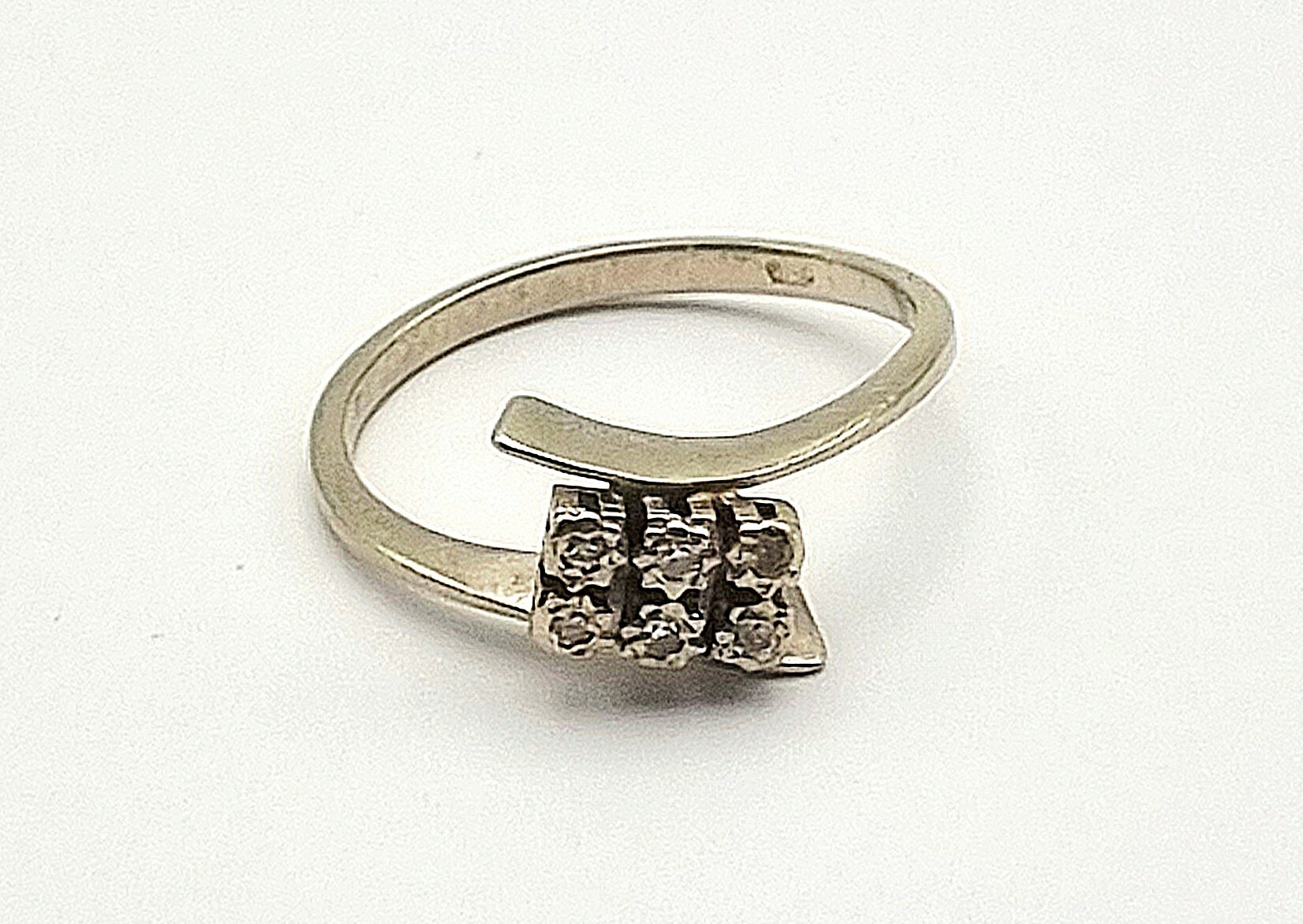Gouden 18-karaats ring met zes briljant geslepen diamanten uitgevoerd in witgoud, gemerkt 750. De ring toont een zetting waarbij de briljanten in twee parallelle rijen zijn geplaatst tussen de vloeiende uiteinden van de band. Datering midden 20e eeuw. Geïnteresseerd? Bezoek onze kijkdagen van 11:00 tot 17:00 uur! |