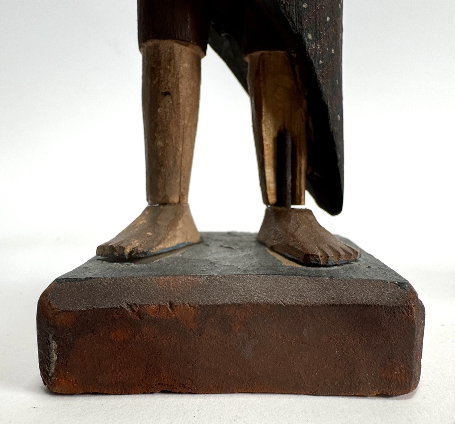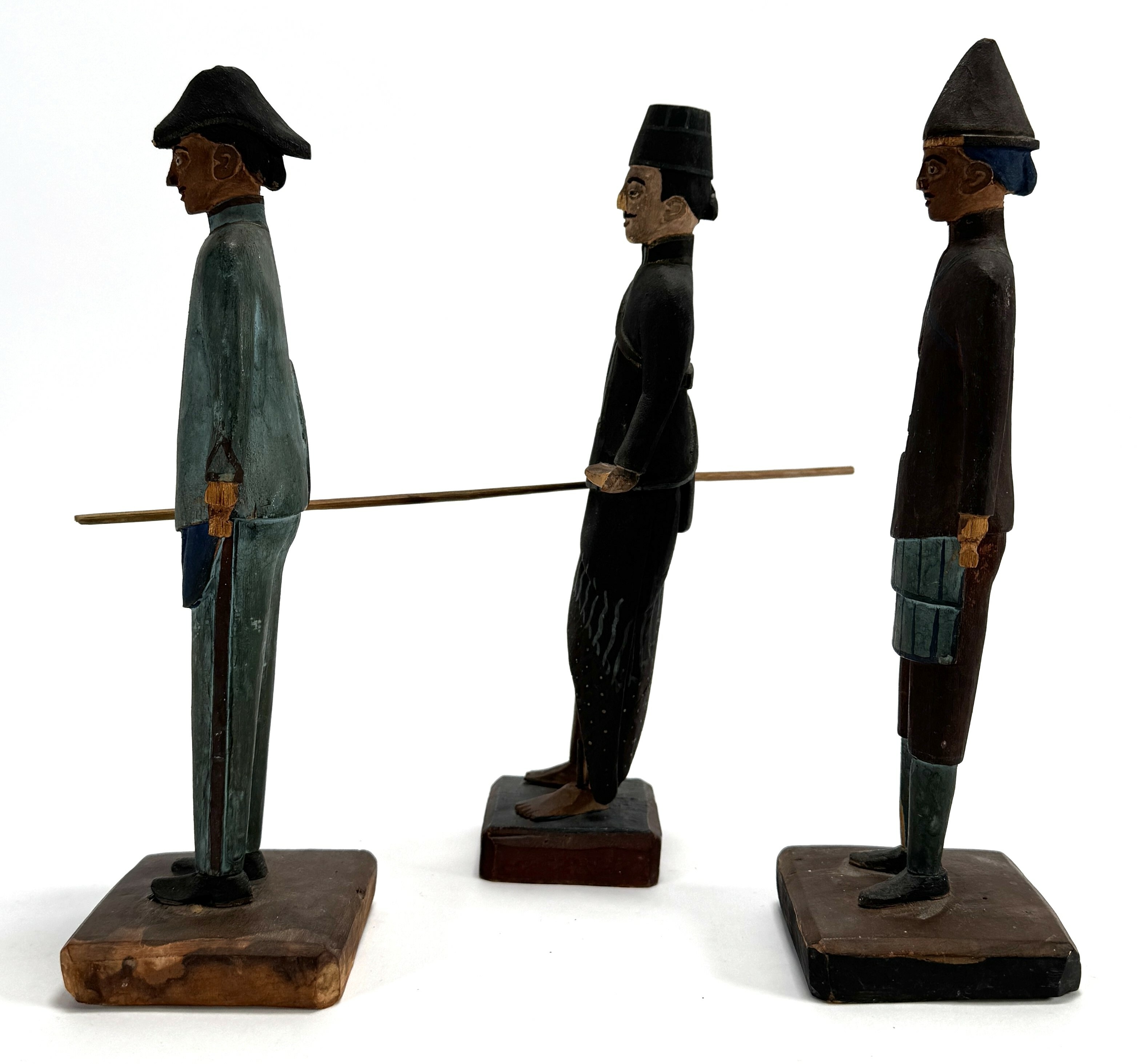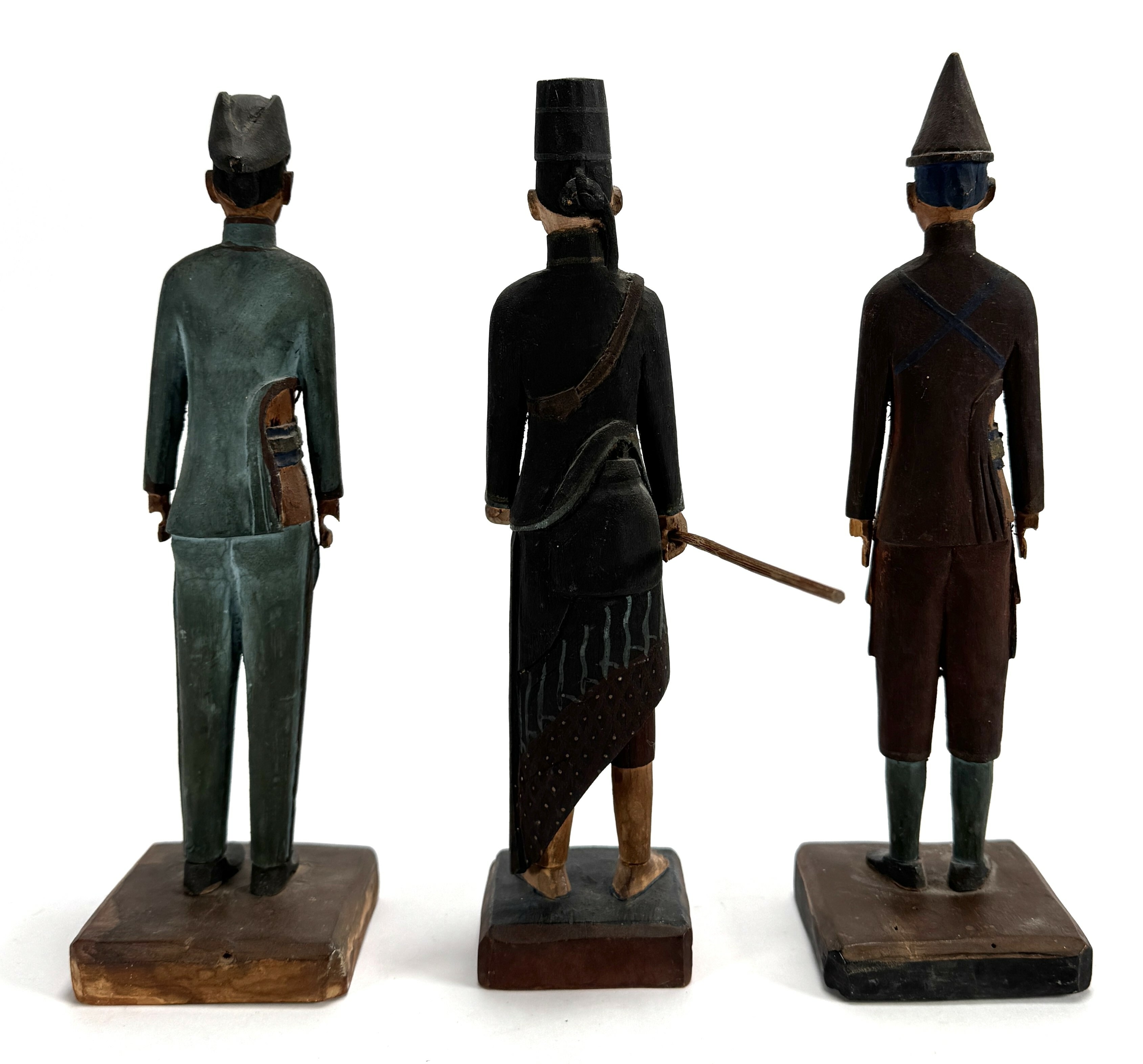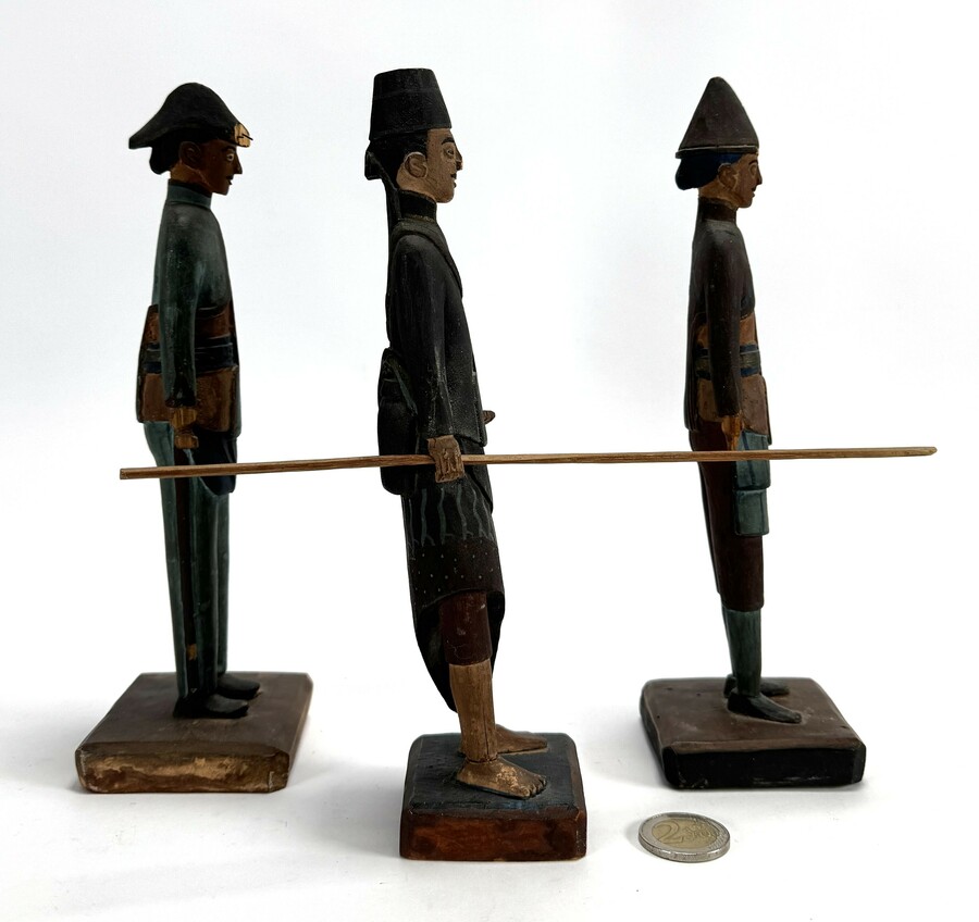 Houten beelden uit de koloniale periode, vervaardigd uit polychroom beschilderd hout met gedetailleerd snijwerk. De kavel bestaat uit een figuur in traditionele Javaanse dracht met batikpatroon en twee figuren in militair uniform. De beelden dateren van omstreeks 1930 en hebben een Indonesische herkomst. Registreer nu en bied eenvoudig online mee op deze houten beelden! |