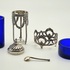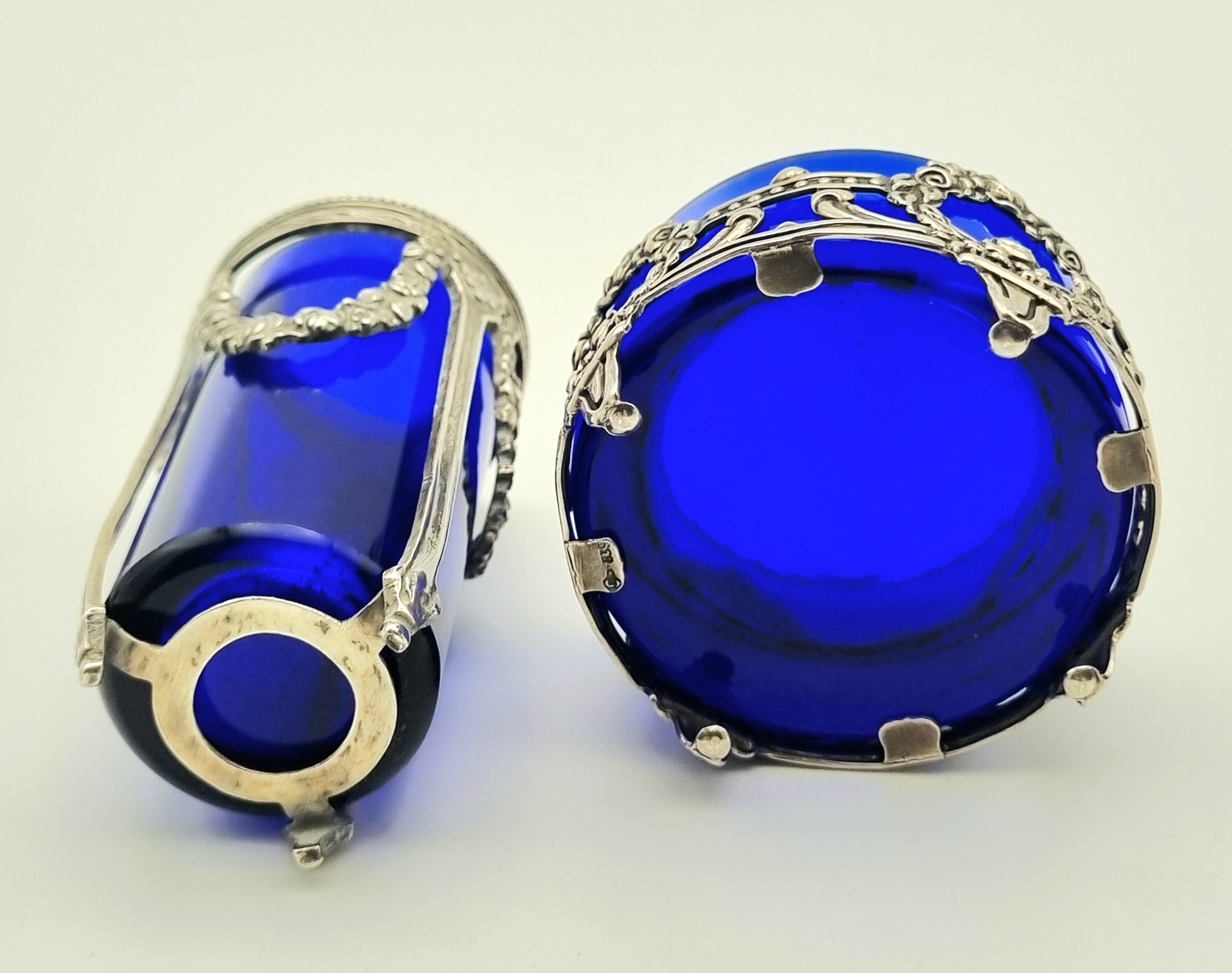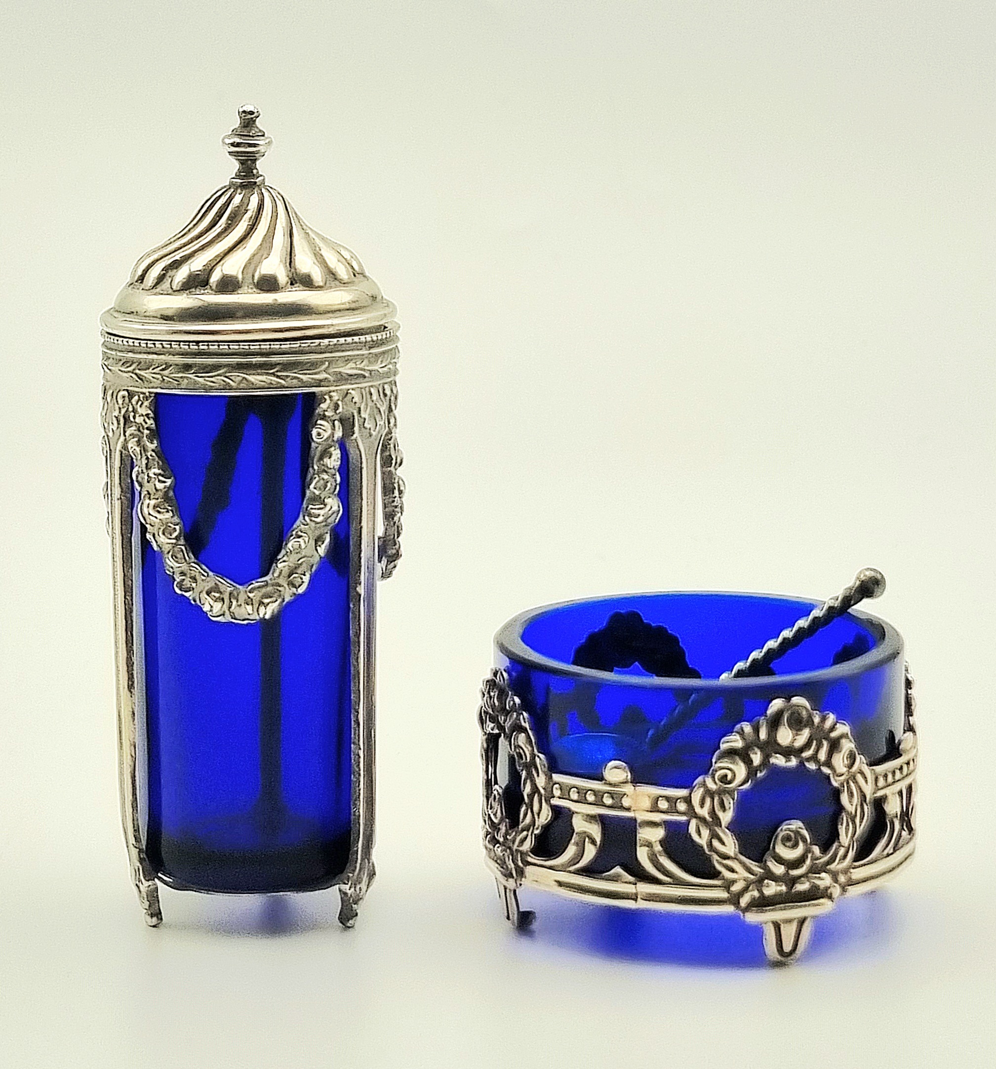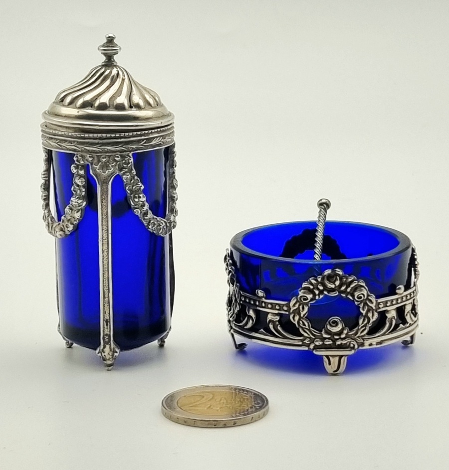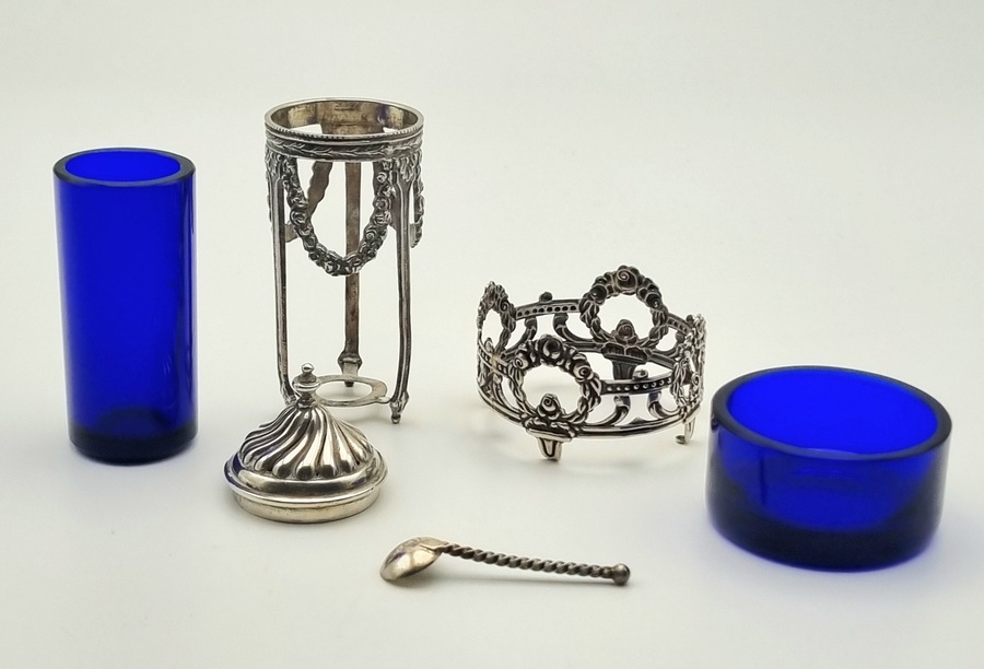 Zilveren 835/1000 zoutstel bestaande uit een strooier en vaatje voorzien van uitneembare kobaltblauwe glazen inzetten. De strooier toont gedreven guirlandes, terwijl het vaatje is gedecoreerd met gestileerde lauwerkransen. De strooier en bijbehorende lepel dragen het Nederlandse zwaardje, het vaatje is gemerkt met het 835 gehalte teken. Datering circa 1900 en een herkomst in Nederland. Wil je direct deelnemen? Plaats vanaf 3 april alvast een schriftelijk bod via onze website! |