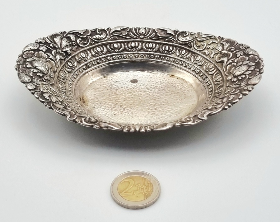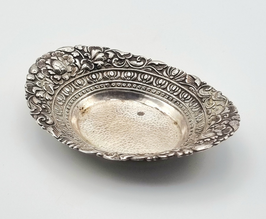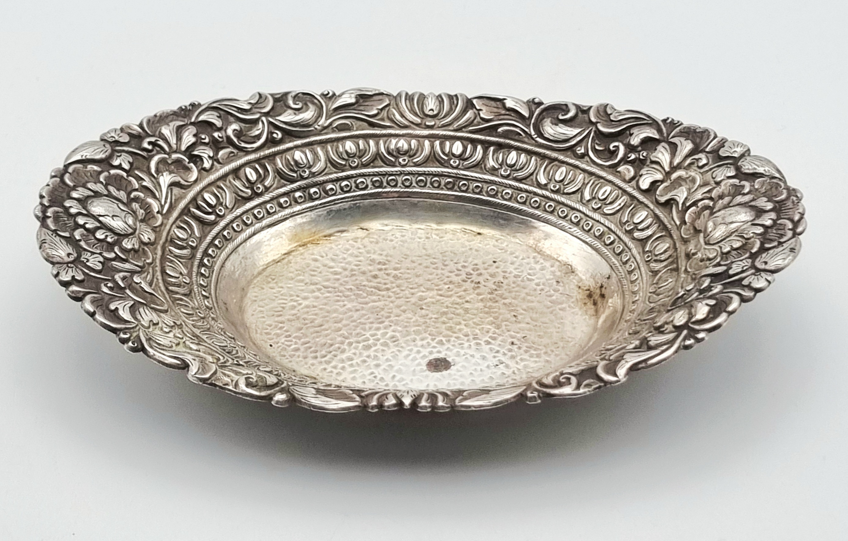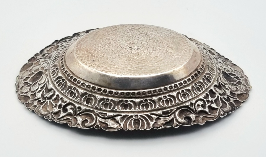 Djokja zilveren schaaltje met gedreven lotusbloem decoratie, vervaardigd uit 800/1000 zilver. De ovale schaal toont een centraal gehamerd midden en een rijk gedreven rand met florale motieven en lotusbloemen. De onderzijde is voorzien van het meesterteken AS en het gehalte-stempel 800. Daterend uit de vroege twintigste eeuw en een herkomst in Java, voormalig Nederlands-Indië. Kom langs tijdens de kijkdagen (10 t/m 12 april) en ontdek deze schaal zelf! |