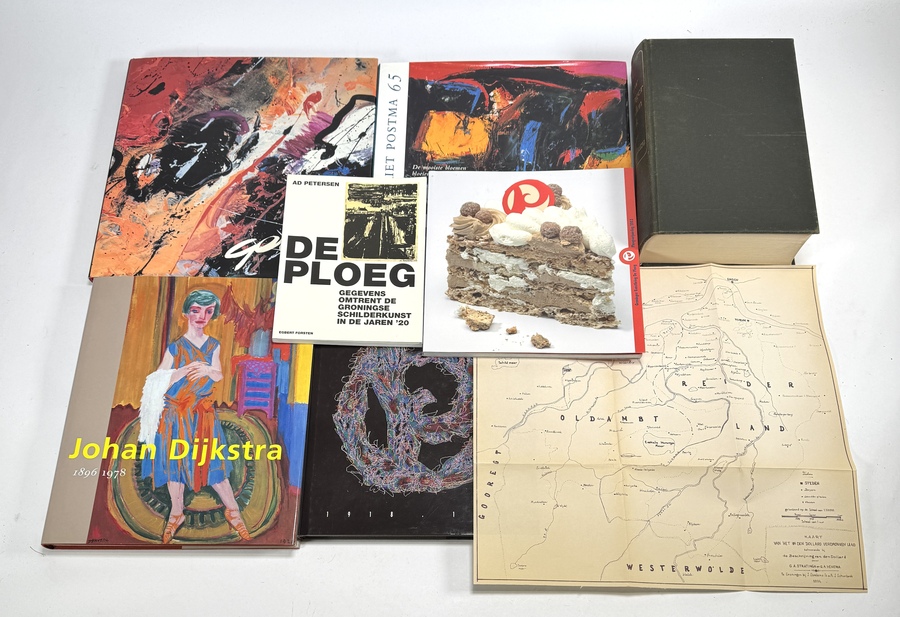 Boeken van diverse auteurs, vervaardigd uit papier en karton met gedrukte en kleurig geïllustreerde omslagen, waaronder titels over Gerriet Postma, Johan Dijkstra en kunstenaarskring De Ploeg, naast het Nieuw Groninger Woordenboek van K. ter Laan. Het lot omvat gebonden en ingenaaide banden, en een exemplaar met uitvouwkaart. Datering 20e/21e eeuw en een Nederlandse herkomst. Zeker zijn van deelname? Plaats vanaf 3 april een schriftelijk bod online! |