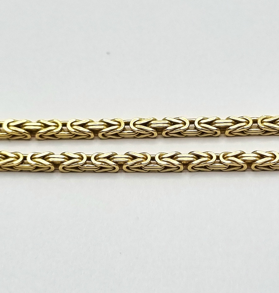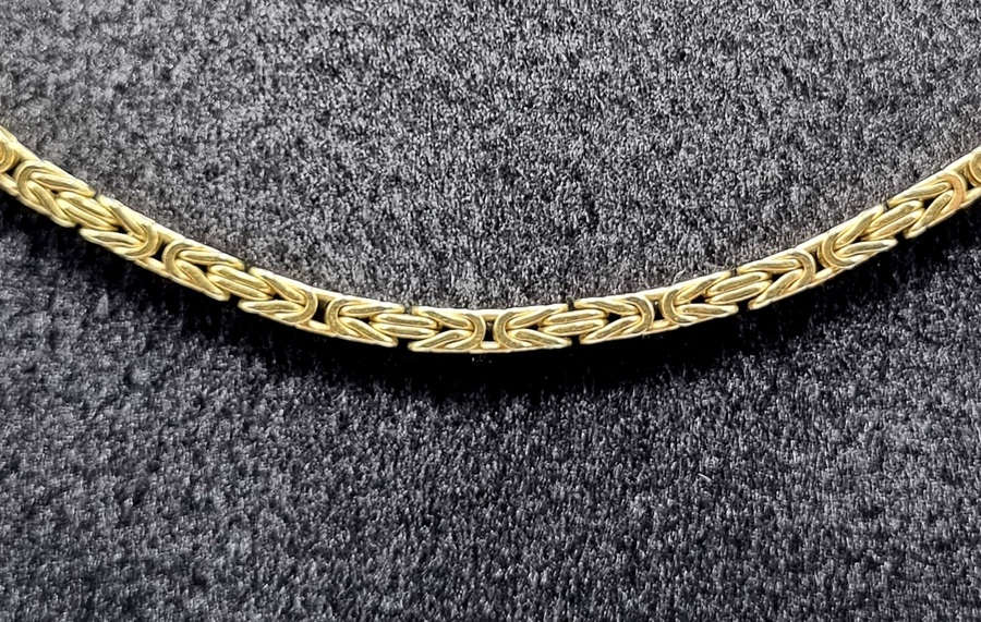 Gouden halsketting van 14-karaats goud, uitgevoerd als koningsschakel met dicht gevlochten, regelmatig opgebouwd schakelpatroon en karabijnsluiting. Gemerkt 585, datering eind 20e eeuw. Deze halsketting zelf beoordelen? Je bent welkom op onze kijkdagen op 10, 11 en 12 april! |