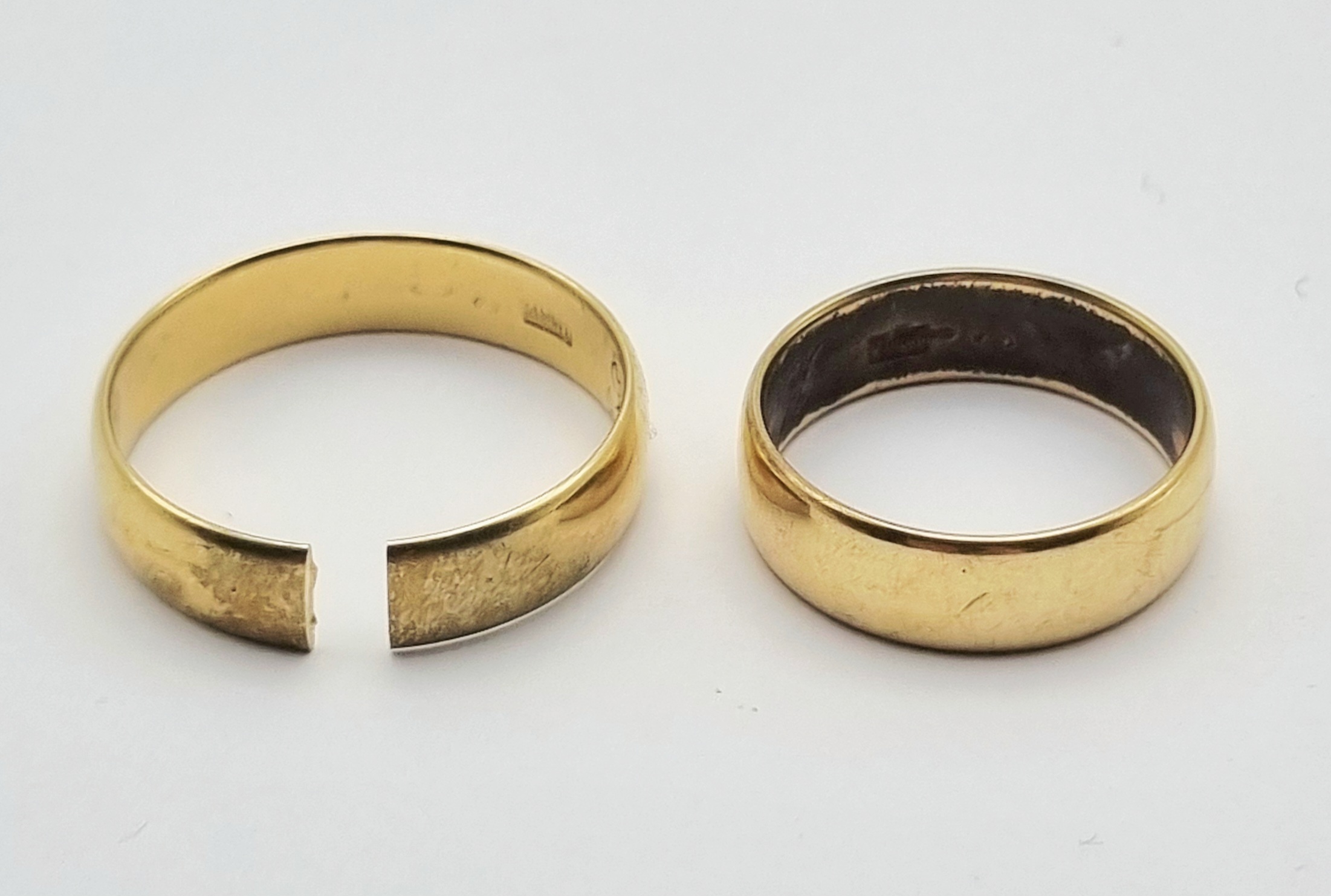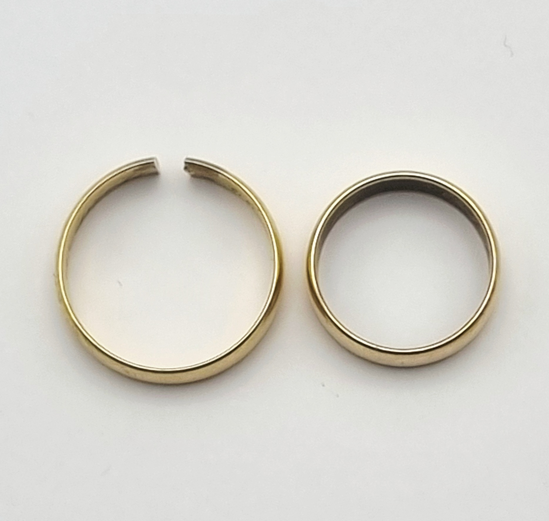 Gouden 14-karaats trouwringen met een gepolijste afwerking, de ringen zijn voorzien van het 585 keurmerk, datering tweede helft 20e eeuw |