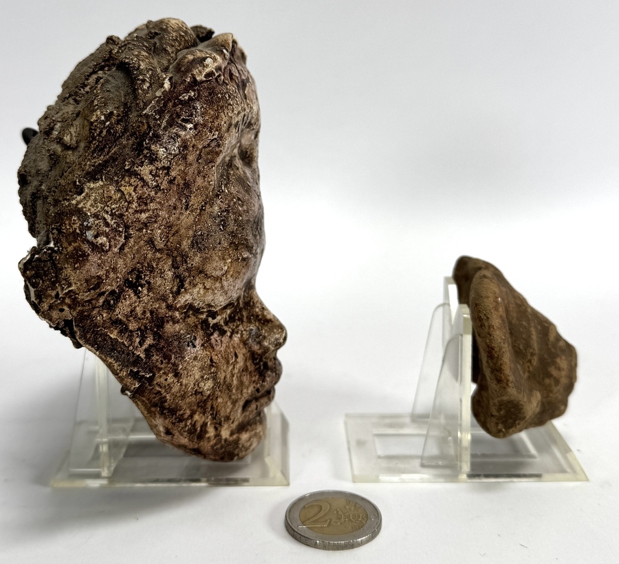 Beeldjes in archaïsche stijl, vervaardigd uit aardewerk met hand geboetseerde gelaatstrekken. De beelden tonen gefragmenteerde menselijke hoofden met een verweerd oppervlak en grove textuur. De sculpturale vormen hebben een etnografisch karakter. Datering circa 1900. Registreer nu en bied eenvoudig online mee op dit paar beeldjes! |
