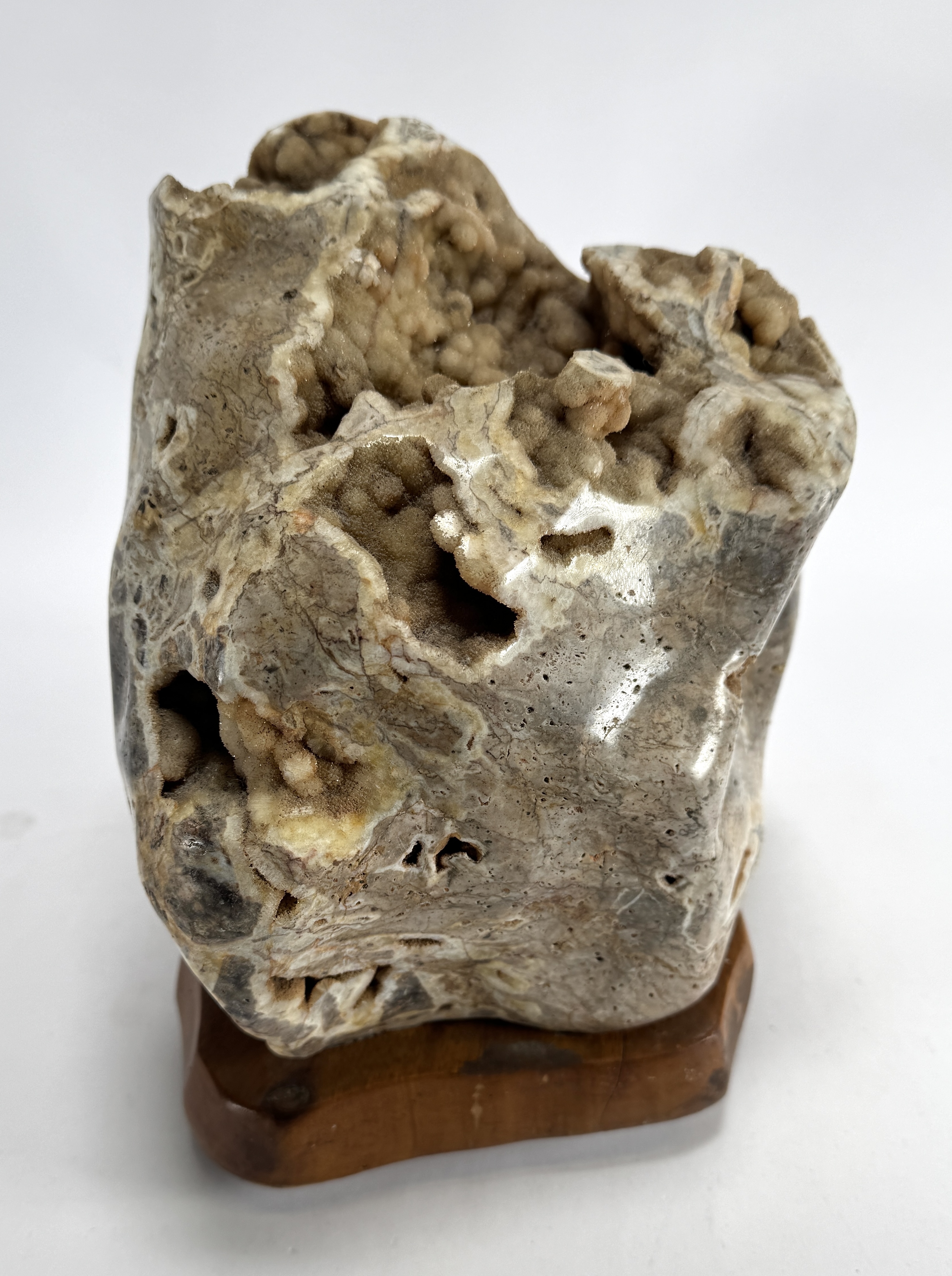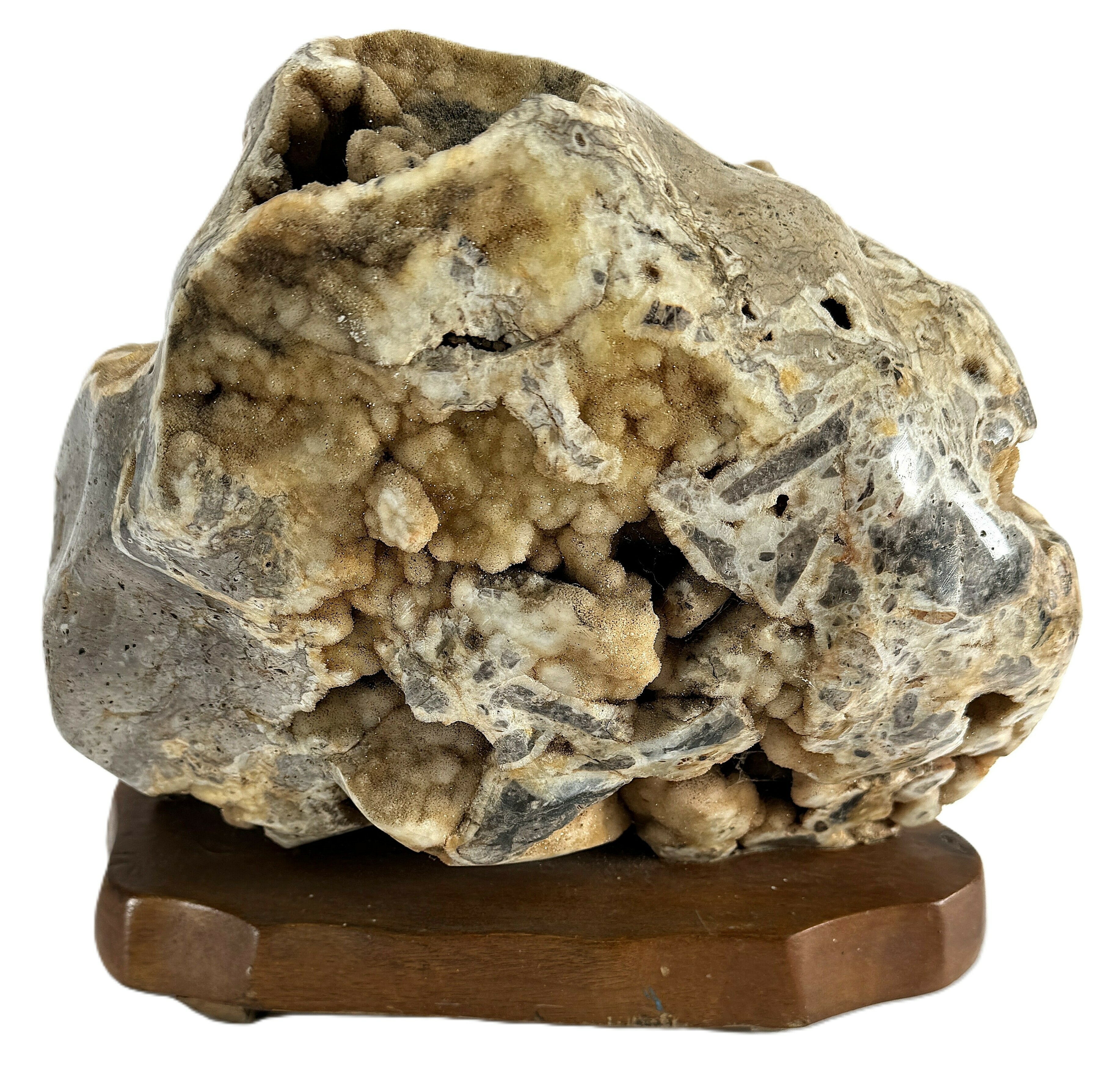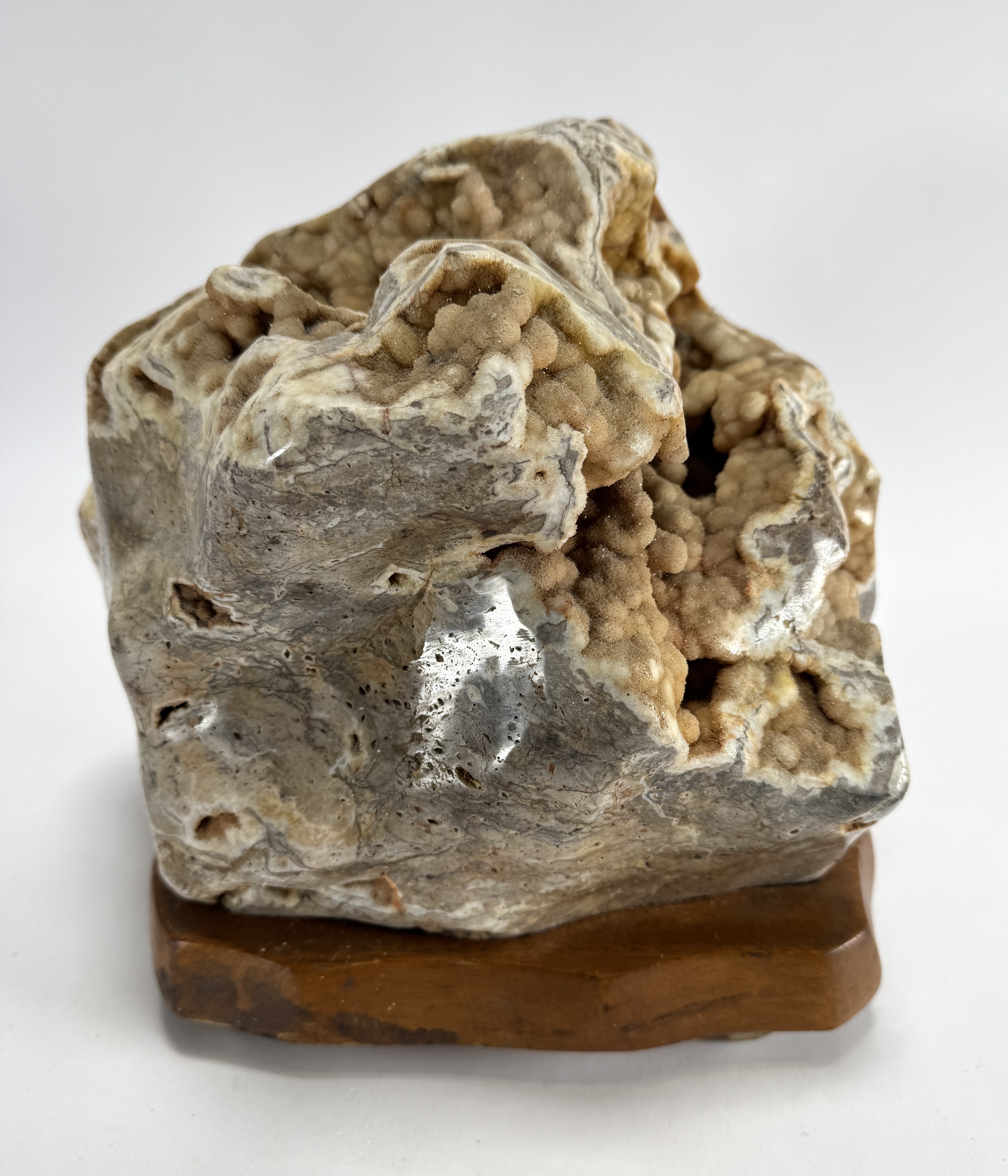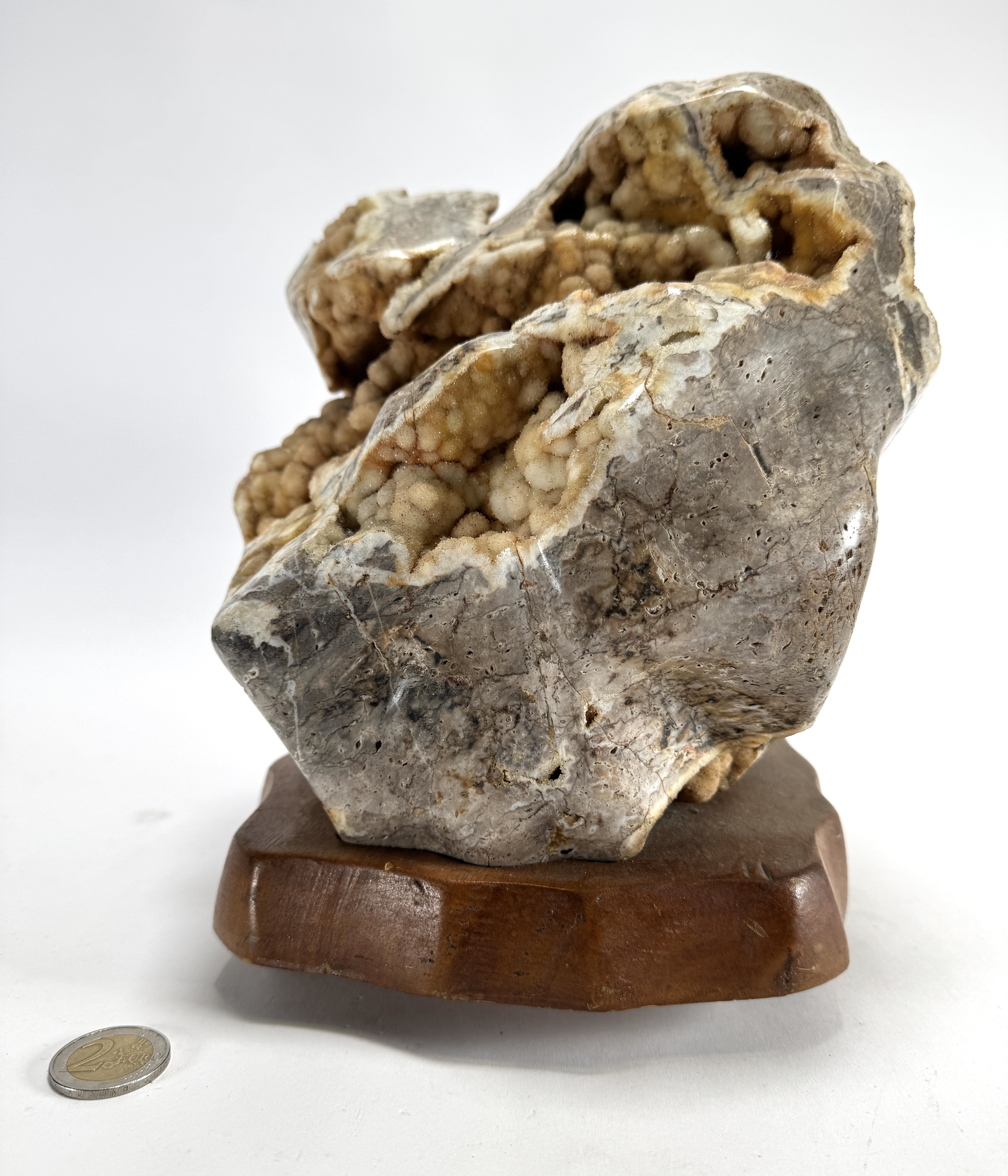 Calcietgeode in natuurlijke vorm met gepolijste buitenvlakken en opengewerkte kristalholten. Het mineraal toont botryoidale aangroei, druzy-kristallisatie en een asymmetrische massa met roomkleurige, honingbruine en grijze zones. De geode is geologisch miljoenen jaren oud en als siervoorwerp op houten sokkel geplaatst, Noord-Afrikaanse herkomst. Geïnteresseerd? Bezoek onze kijkdagen op 10, 11 en 12 april van 11:00 tot 17:00 uur! |