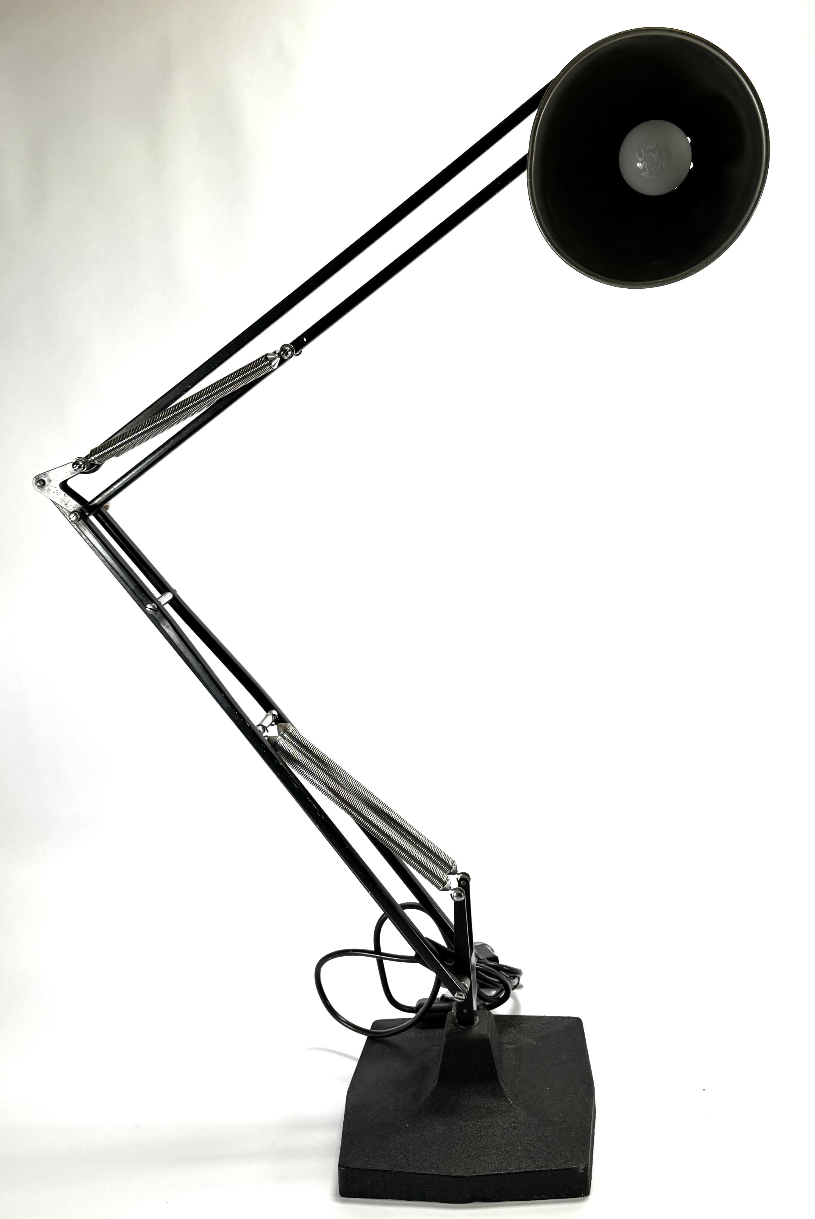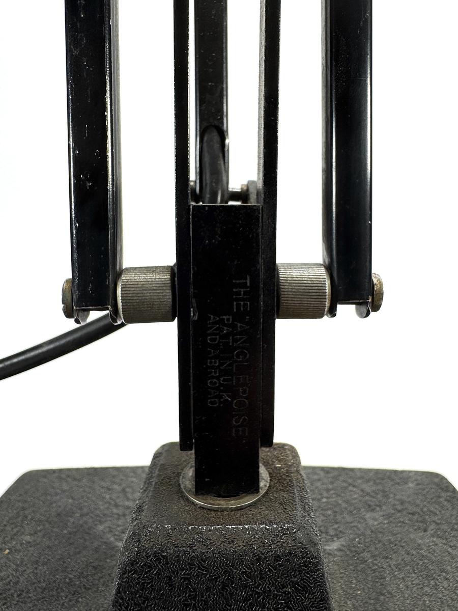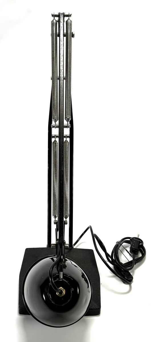 Lamp oorspronkelijk ontworpen in 1935 door George Carwardine. Geproduceerd door Herbert Terry & Sons. Model 1208/09, vervaardigd uit zwart gelakt metaal met stalen trekveren. De lamp toont een vierkante voet en een verstelbare knik arm die eindigt in een kap. Gemerkt met de inscriptie "The Anglepoise Pat. in U.K." op de staander. De lamp dateert uit midden 20e eeuw, herkomst Engeland. Klaar om te bieden? Registreer je nu en doe mee aan de veiling! |