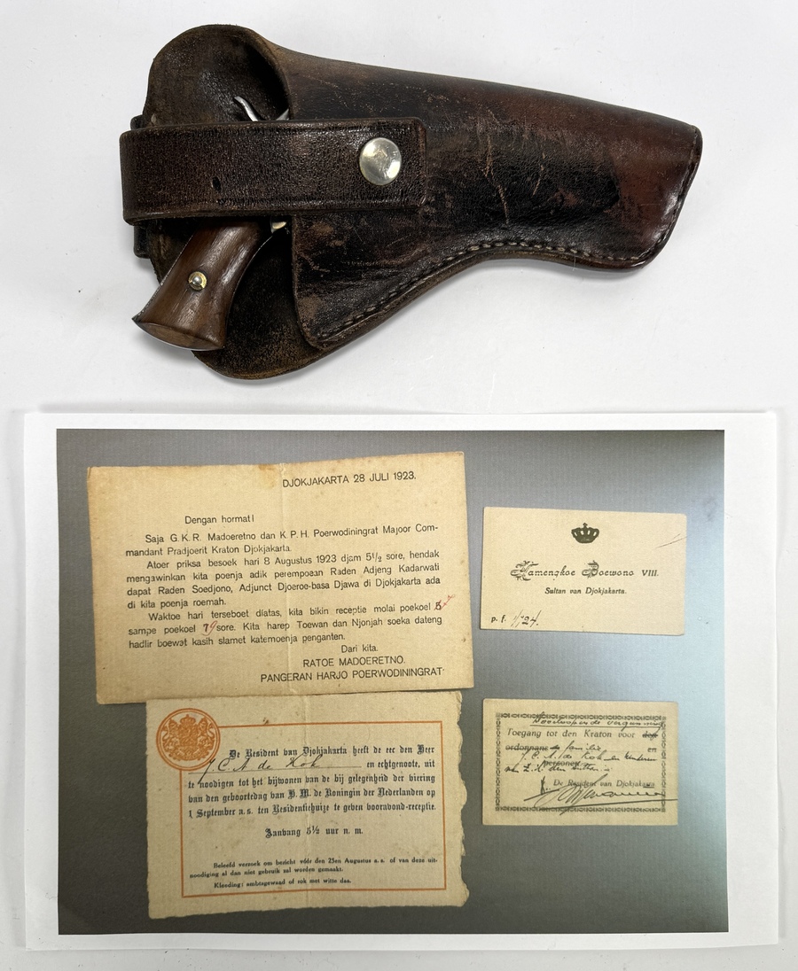 Javaanse zes schots penvuurrevolver met lederen holster uit Yogyakarta, gedocumenteerd in 1923. Het zakmodel toont een achthoekige loop en vouwtrekker. Bijgevoegd een huwelijksuitnodigingen van G.K.R. Madoeretno en de Commandant van de Kraton-garde, K.P.H. Poerwodiningrat, een visitekaartje van Sultan Hamengkoe Boewono VIII en een residentiële uitnodiging voor de koninklijke verjaardag receptie. Geïnteresseerd? Bezoek onze kijkdagen op 10, 11 en 12 april van 11:00 tot 17:00 uur! |