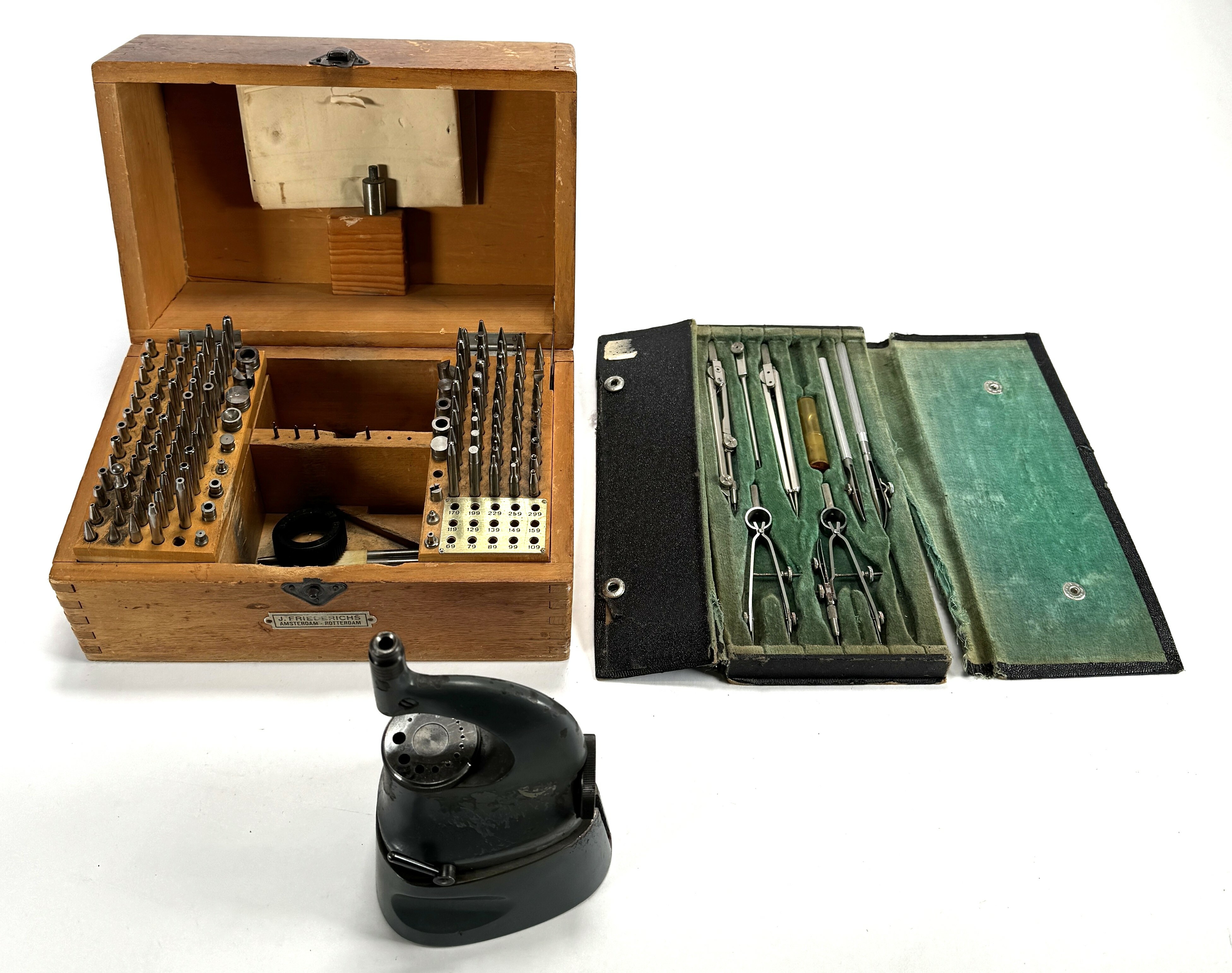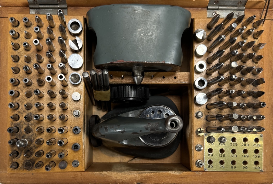 Triebniet Boley van J. Friederichs Amsterdam-Rotterdam uit de interbellum periode, vervaardigd uit staal en gietijzer in een eikenhouten kistje. De set voor horlogemakers omvat een staking-tool met bijbehorende ponsen en aambeelden voor fijnmechanische bewerkingen. Hierbij een passerset in een met fluweel gevoerd foedraal. Daterend eerste helft van de 20e eeuw en een Nederlandse herkomst. Geïnteresseerd? Bezoek onze kijkdagen op 10, 11 en 12 april van 11:00 tot 17:00 uur! |