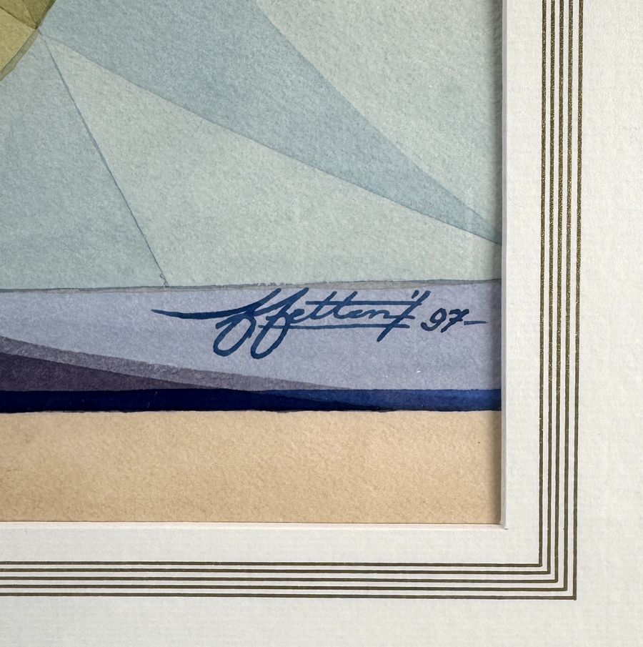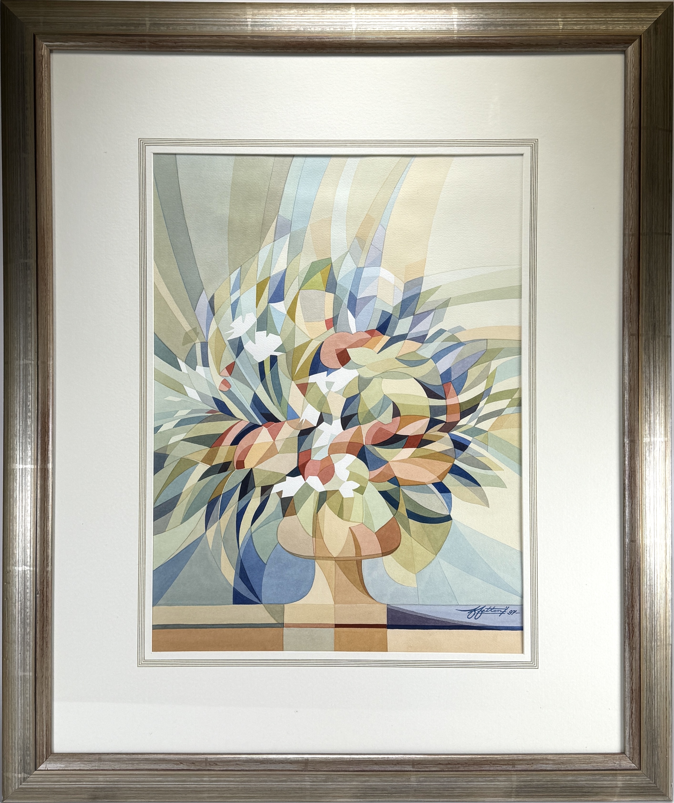 Aquarel met bloemstuk in modernistische stijl, het bloemstuk is opgebouwd uit transparante, overlappende kleurvlakken in lichtblauw, saliegroen, oker en koraal, met witte bloemaccenten en uitwaaierende bladvormen. Rechtsonder onduidelijk gesigneerd en gedateerd 97. Registreer nu en bied eenvoudig online mee op deze aquarel! |
