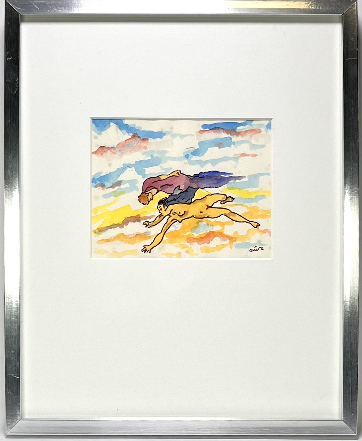 Aquarel door Arie Zuidersma (1925–2014) lid van de Ploeg, toont twee zwemmende figuren in expressionistische stijl, uitgevoerd in aquarel op papier. De aquarel kenmerkt zich door een levendig palet van blauw, geel en purper. Gesigneerd rechtsonder. Deze aquarel dateert uit het begin 2000 en heeft een Nederlandse herkomst. Geïnteresseerd? Bezoek onze kijkdagen op 10, 11 en 12 april van 11:00 tot 17:00 uur! |