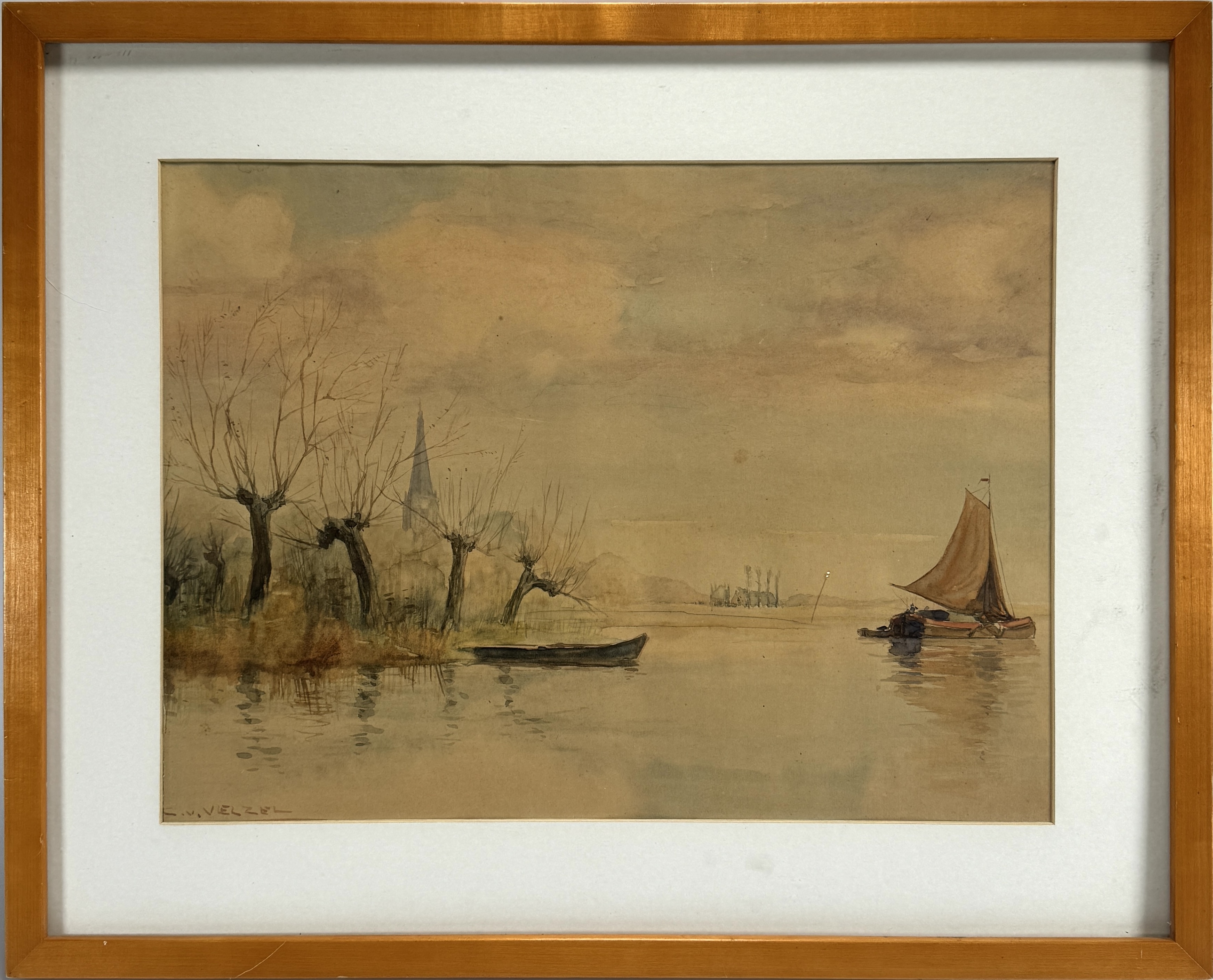 Aquarel door C. van Velzen toont een rivierlandschap uit de romantiek, uitgevoerd in aquarel op papier. Het tafereel omvat knotwilgen aan de waterkant en een zeilschip onder een bewolkte lucht. In de nevelige verte is een kerktoren zichtbaar in een weids verschiet. Gesigneerd linksonder, daterend uit het midden van de 19e eeuw en een Nederlandse herkomst. Eerst deze aquarel zien voordat je biedt? Bezoek onze kijkdagen op 10, 11 en 12 april! |
