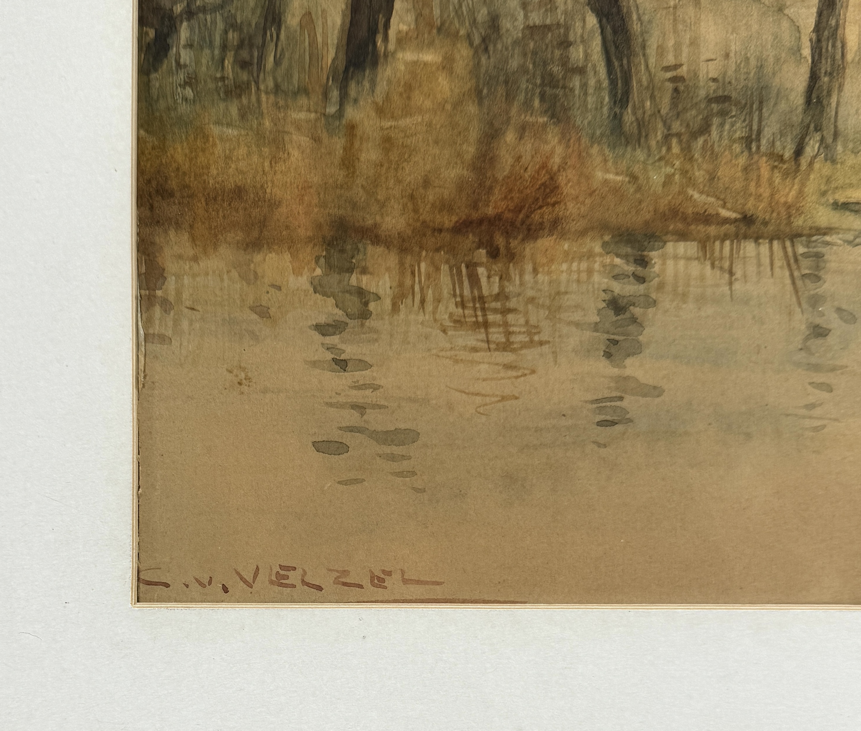 Aquarel, C. van Velzen - rivierlandschap, midden 19e eeuw