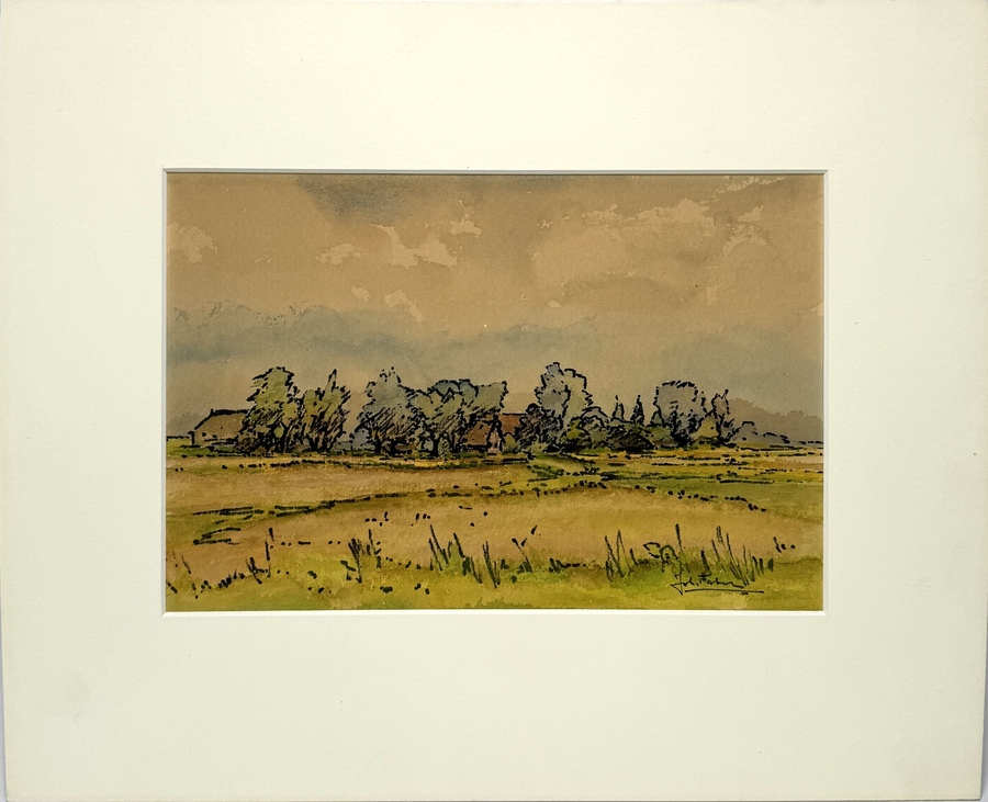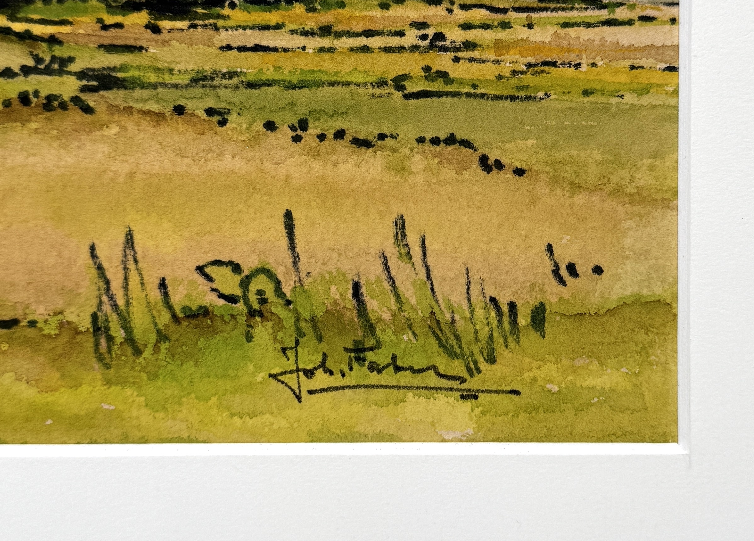 Aquarel, Johan Faber – weidelandschap met boerderijen, midden 20e eeuw
