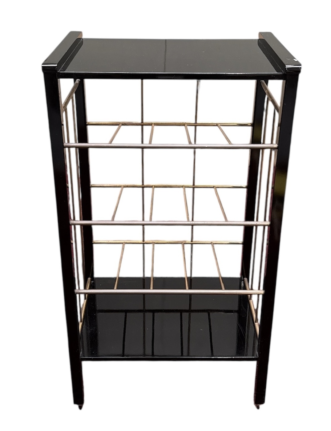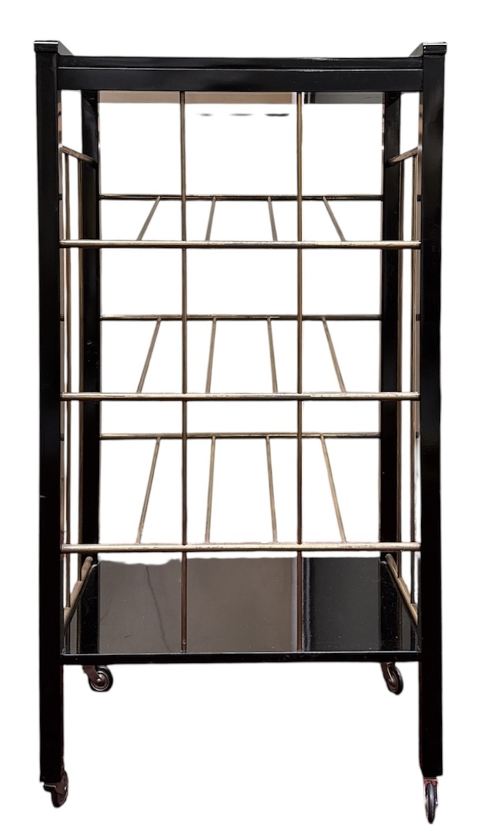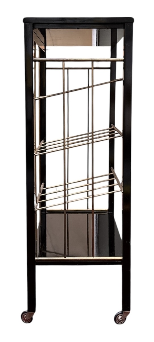 Tijdschrifthouder in Art Deco stijl, vervaardigd uit hout en messing met drie schuine compartimenten voor lectuur. De geometrische constructie is voorzien van een houten onderblad in zwart hoogglans en staat op vier zwenkwieltjes. De tijdschriftenhouder dateert uit de 21e eeuw en heeft een West-Europese herkomst. Dit tijdschriftenrek zelf beoordelen? Je bent welkom op onze kijkdagen op 10, 11 en 12 april! |