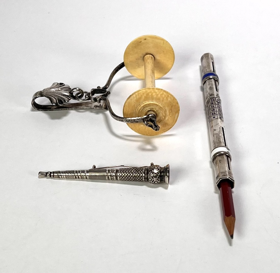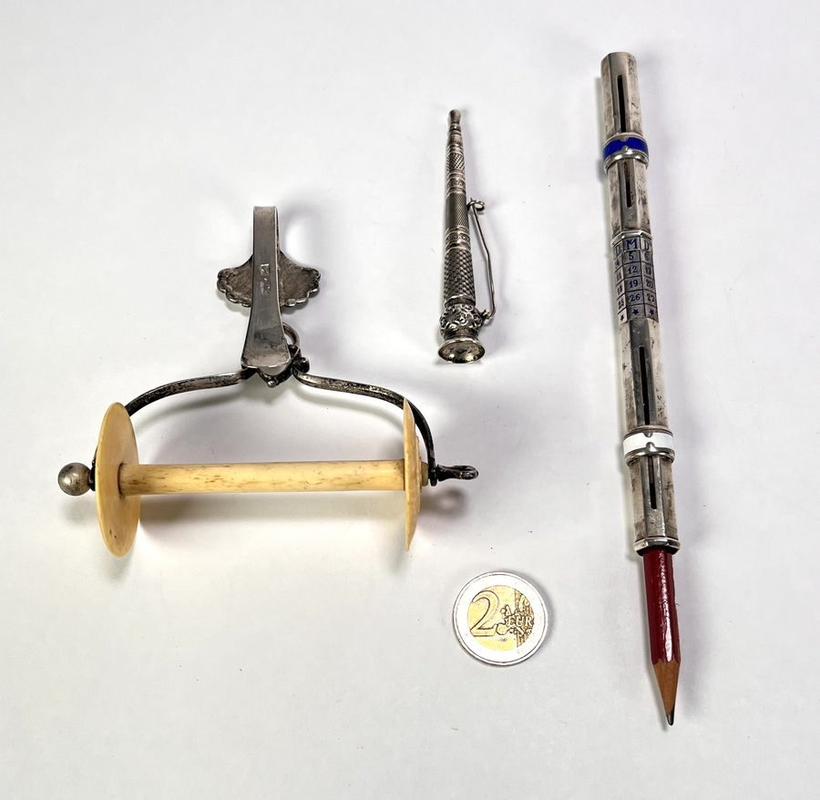 Zilveren kluwenhouder, zilveren broche en verzilverde kalenderpotlood, eind 19e eeuw