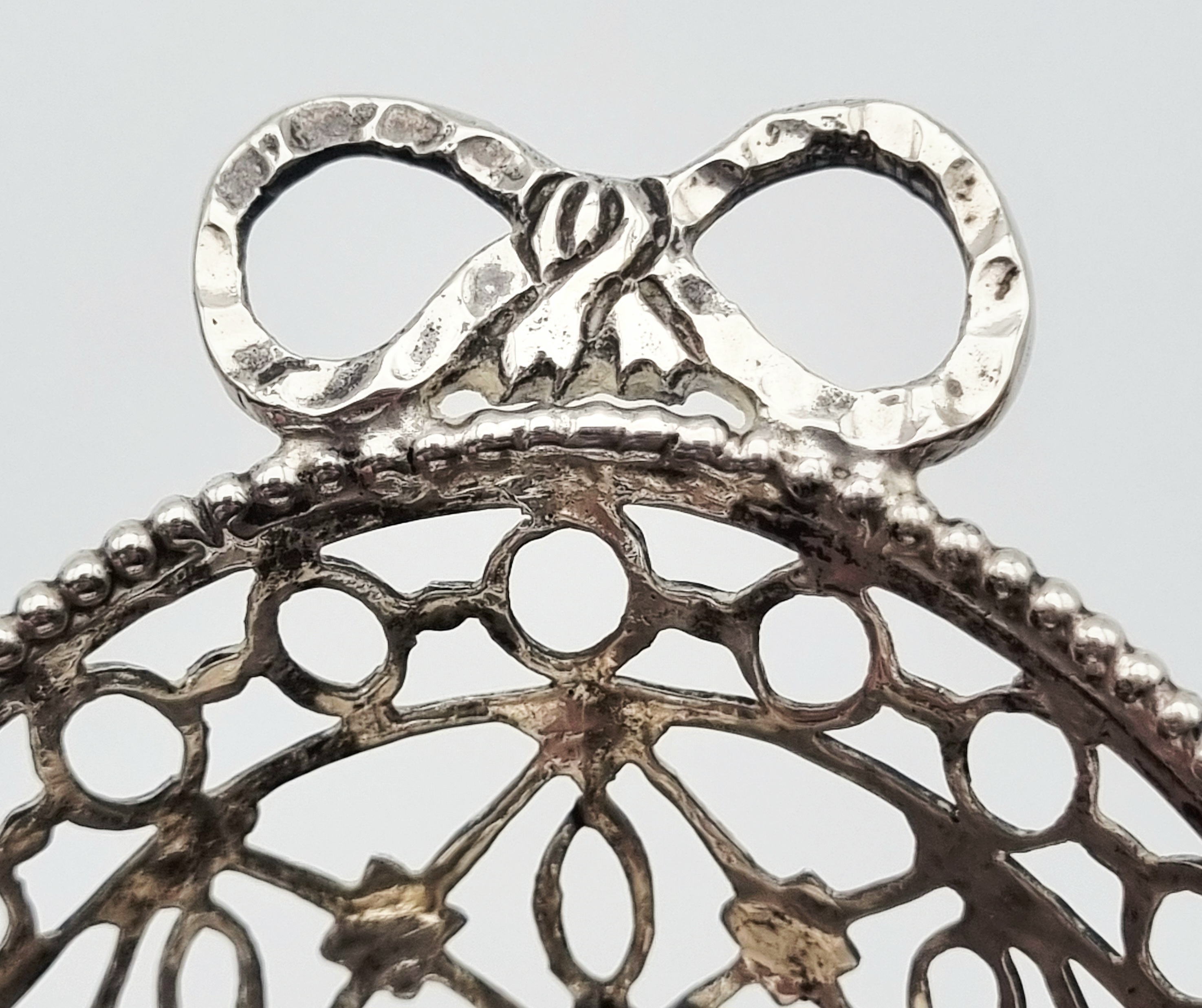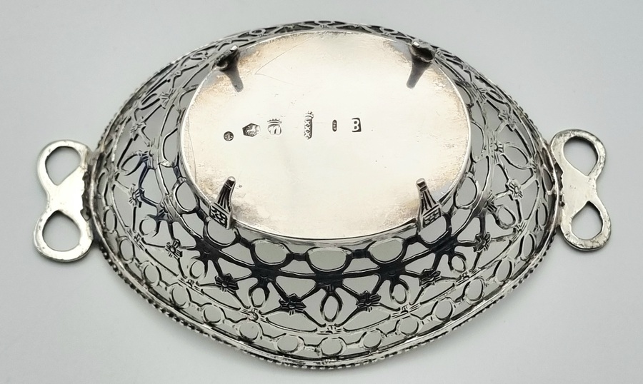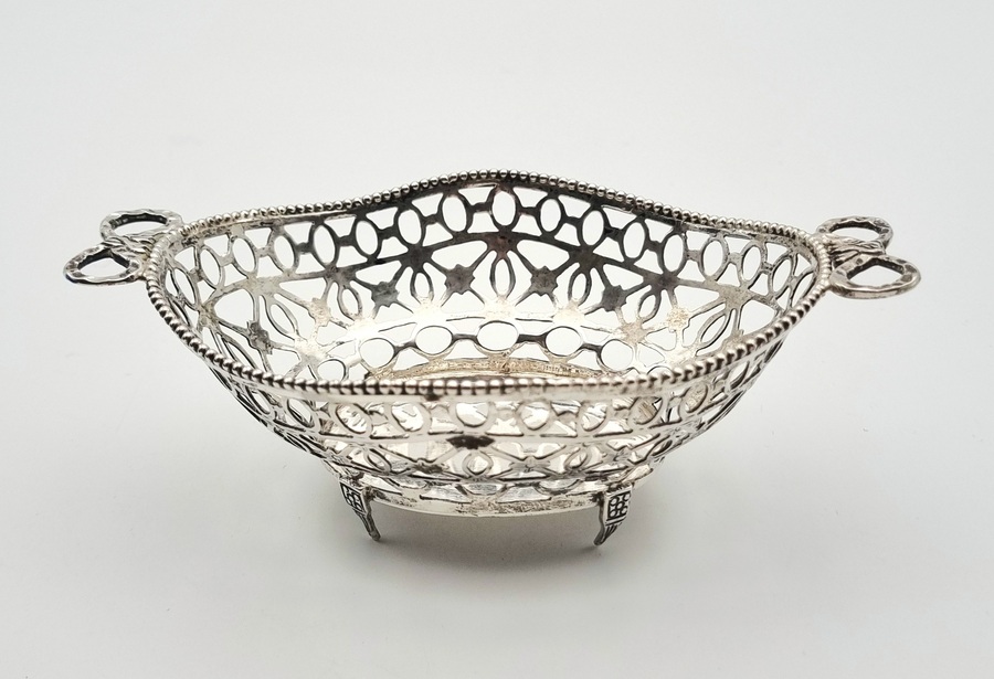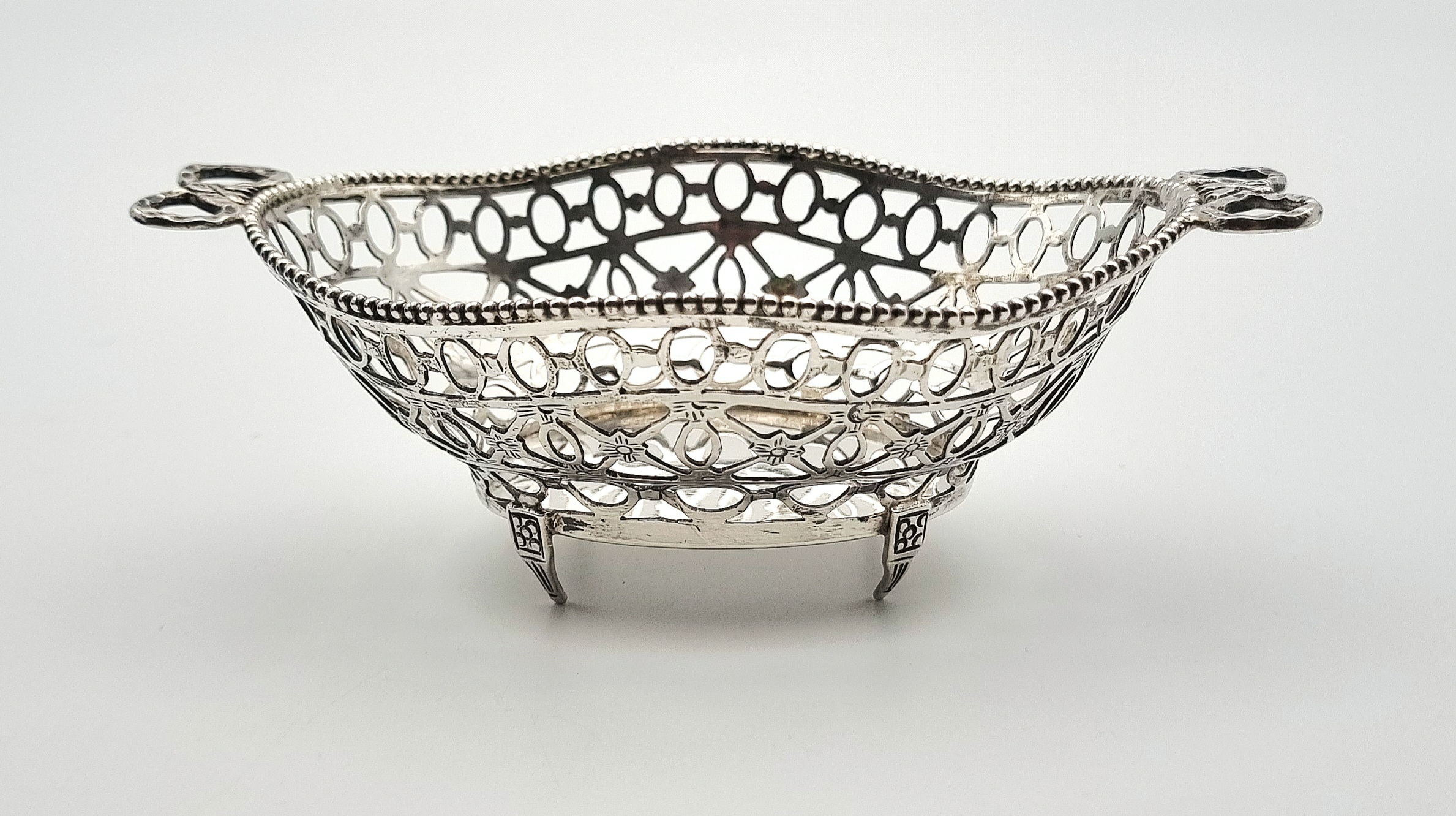 Zilveren tweede gehalte bonbonmandje vervaardigd te Amsterdam. Het ovale model toont fijn ajour zaagwerk met geometrische cirkelmotieven en gestileerde florale elementen. De bovenzijde is afgewerkt met een parelrand en strikvormige handgrepen, het geheel rust op vier bewerkte pootjes. Voorzien van Nederlandse keuren: meesterteken J2P, lopende leeuw 2, stadsteken en jaarletter Z (1909). Klaar om te bieden? Registreer je nu en doe mee aan de veiling! |