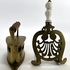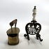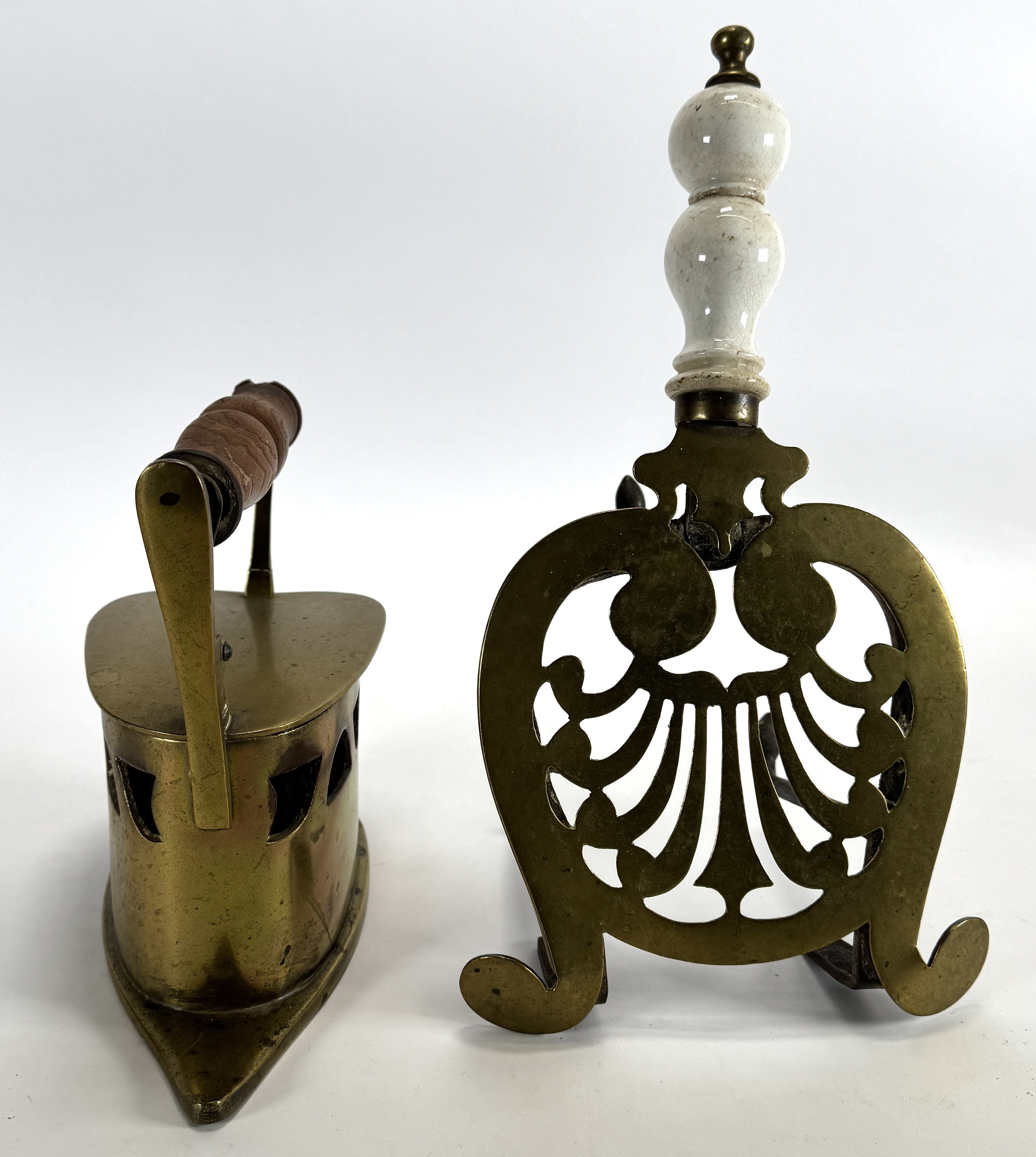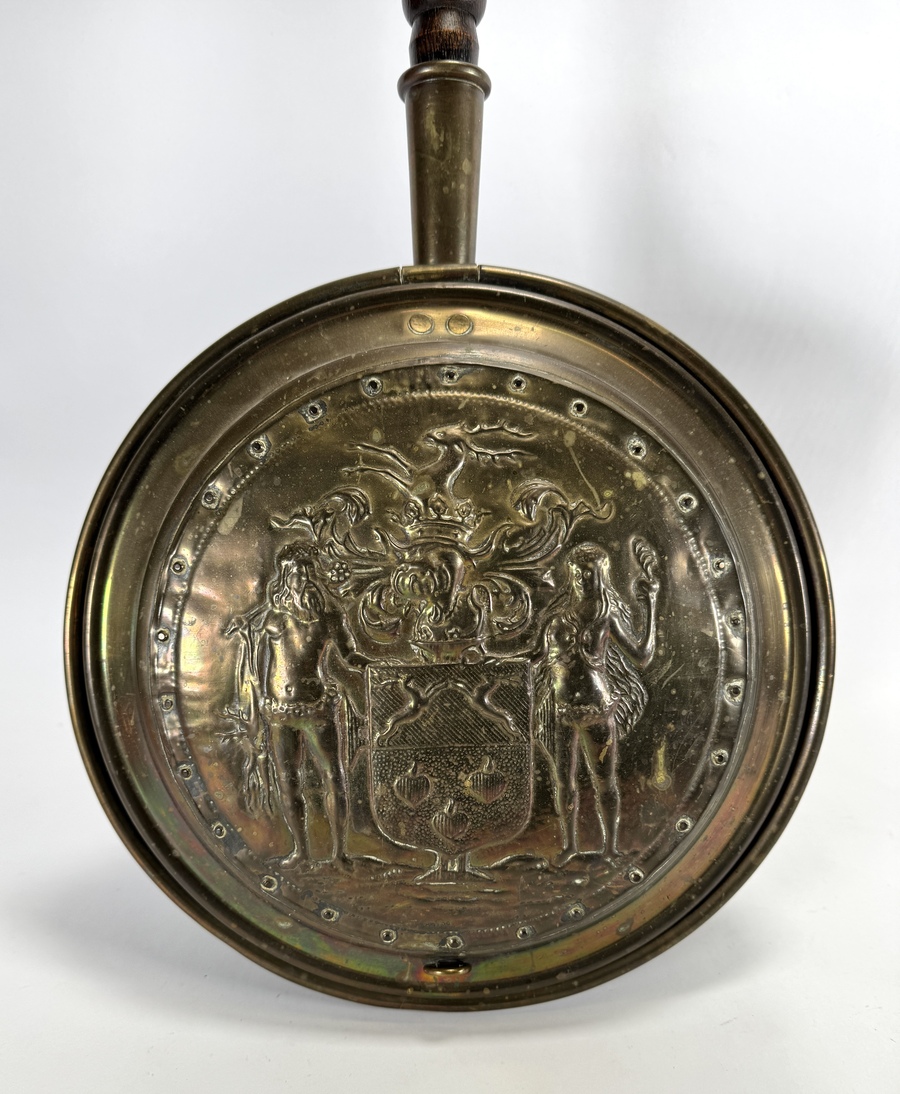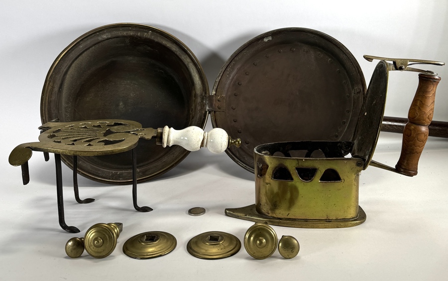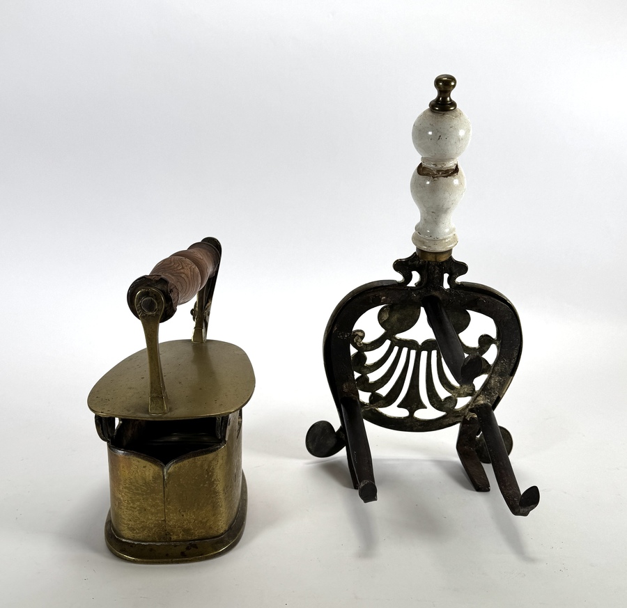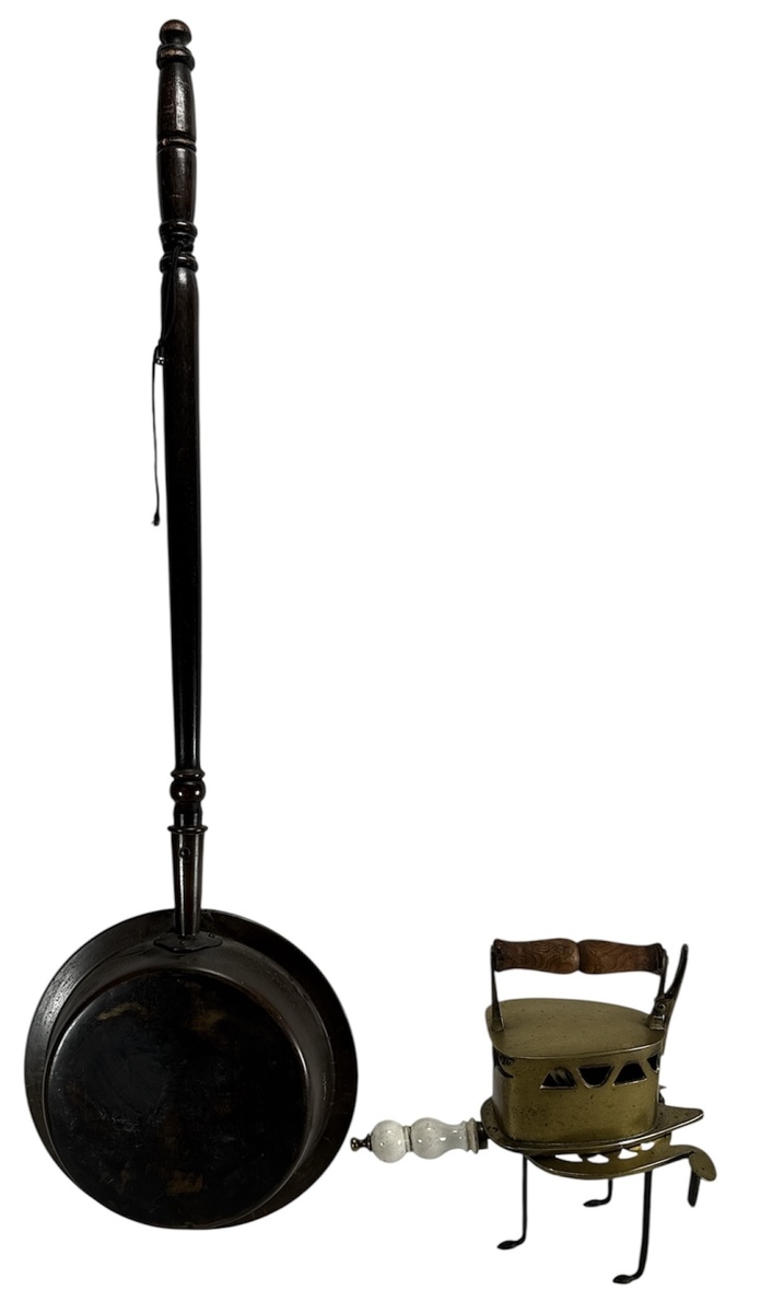 Een ronde beddenpan met lang gedraaid handvat en reliëfwapen en een messing kolenstrijkijzer met scharnierend deksel en een opengewerkte onderzetter of bladmotief. Vervaardigd uit koper, messing, ijzer, hout en keramiek met gedreven, geperforeerde en gegoten onderdelen. Datering 19e eeuw en heeft een Noordwest-Europese herkomst. Klaar om te bieden? Registreer je nu en doe mee aan de veiling! |