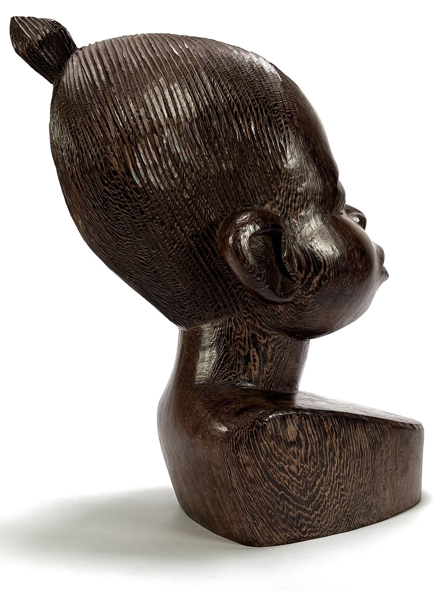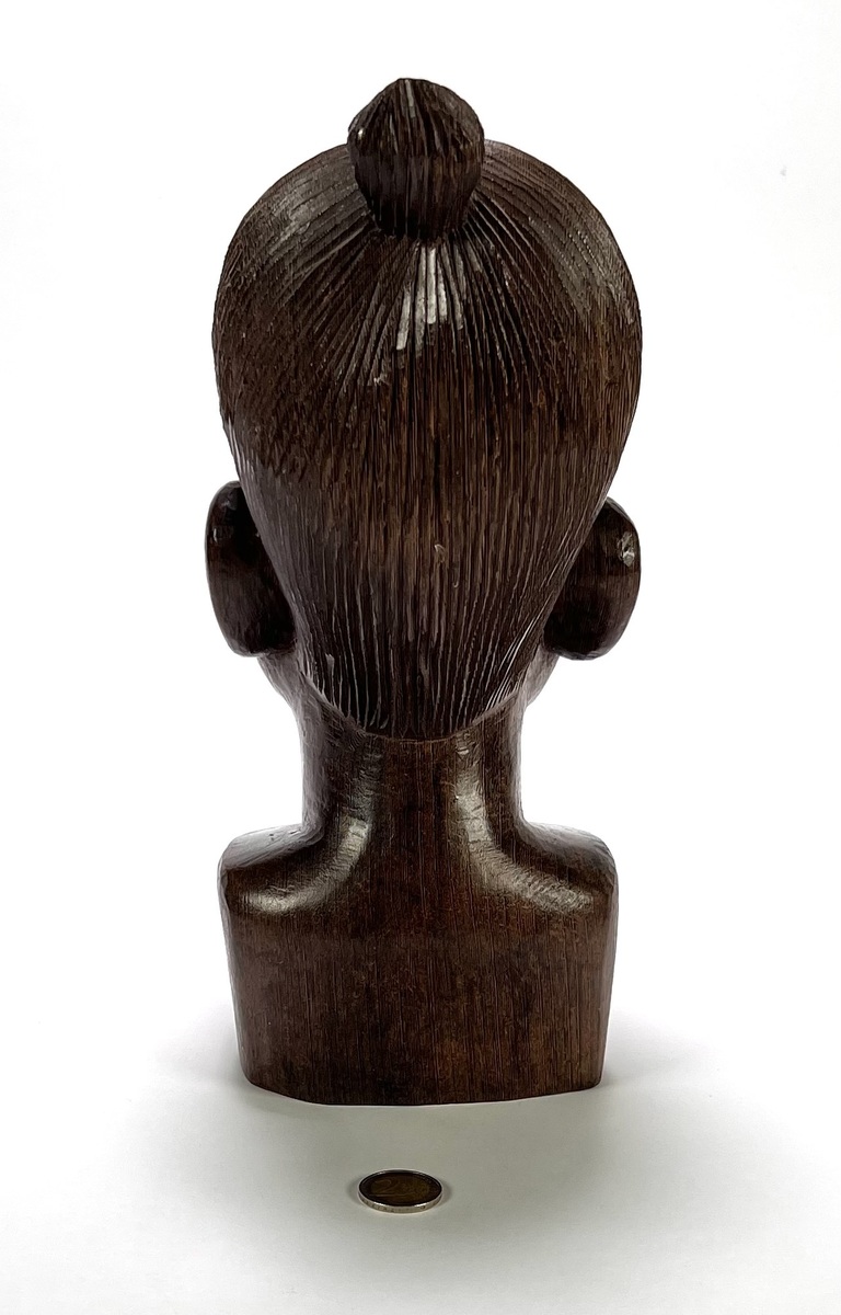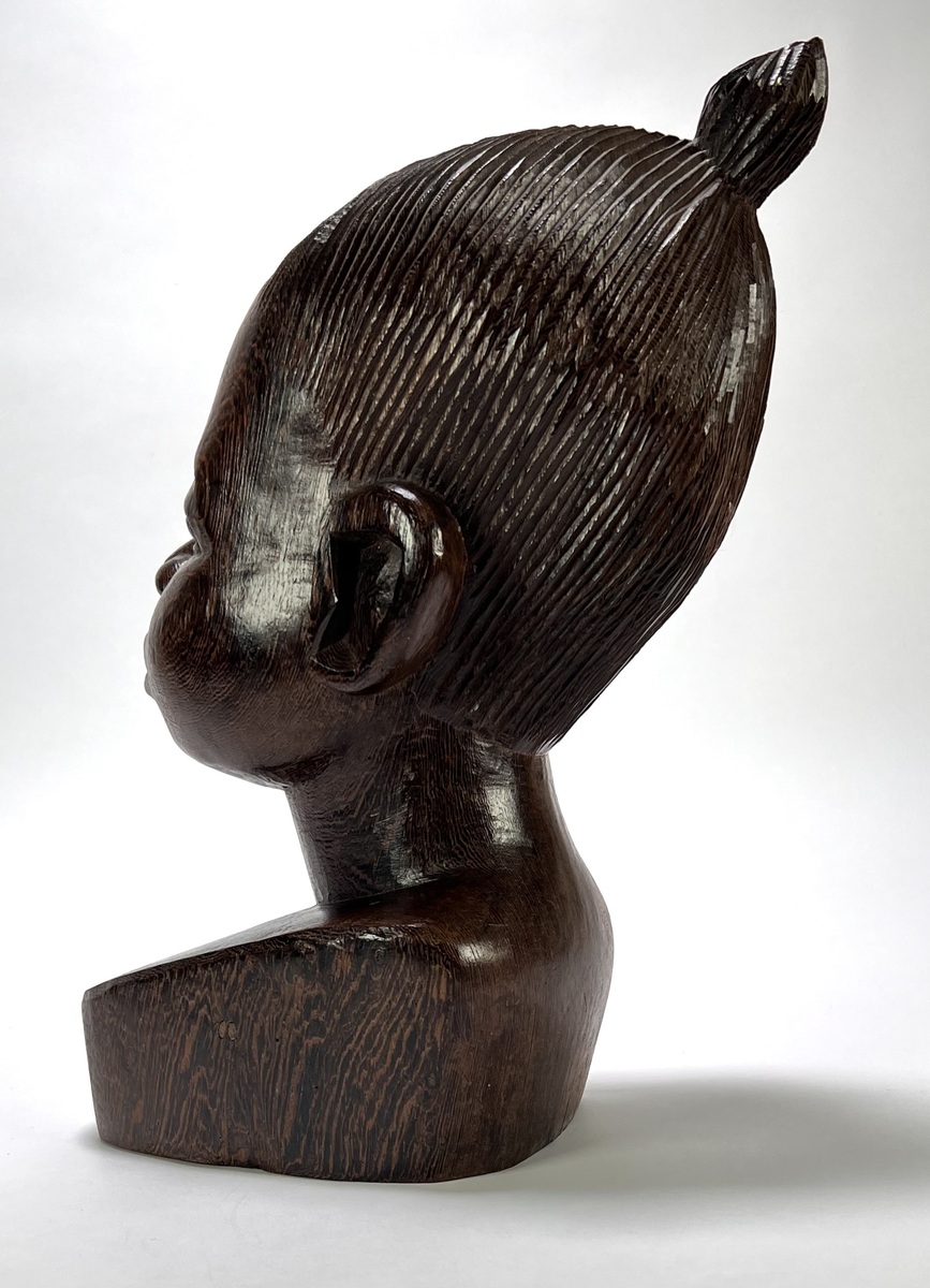 Makonde Mawingu beeld uit Tanzania, late 20e eeuw, handgesneden uit donker gepolijst hardhout. Het borstbeeld van een vrouwelijke figuur toont naturalistische gelaatstrekken met opgestoken haar. Klaar om te bieden? Registreer je nu en doe mee aan de veiling! |