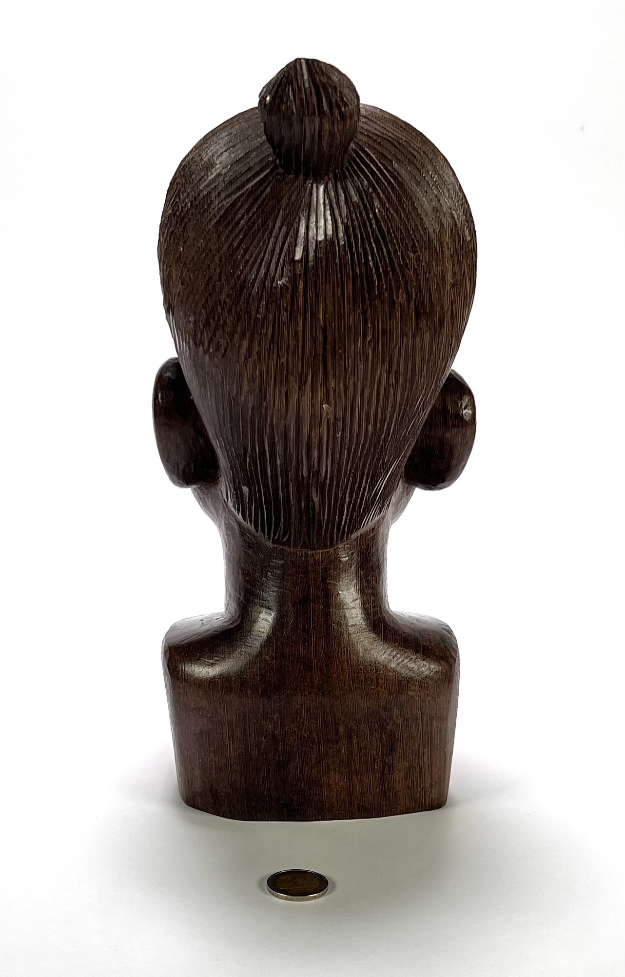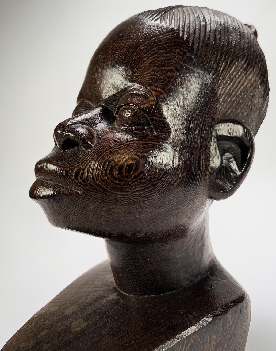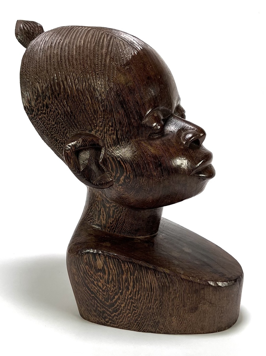 Makonde Mawingu beeld uit Tanzania, late 20e eeuw, handgesneden uit donker gepolijst hardhout. Het borstbeeld van een vrouwelijke figuur toont naturalistische gelaatstrekken met opgestoken haar. Klaar om te bieden? Registreer je nu en doe mee aan de veiling! |
