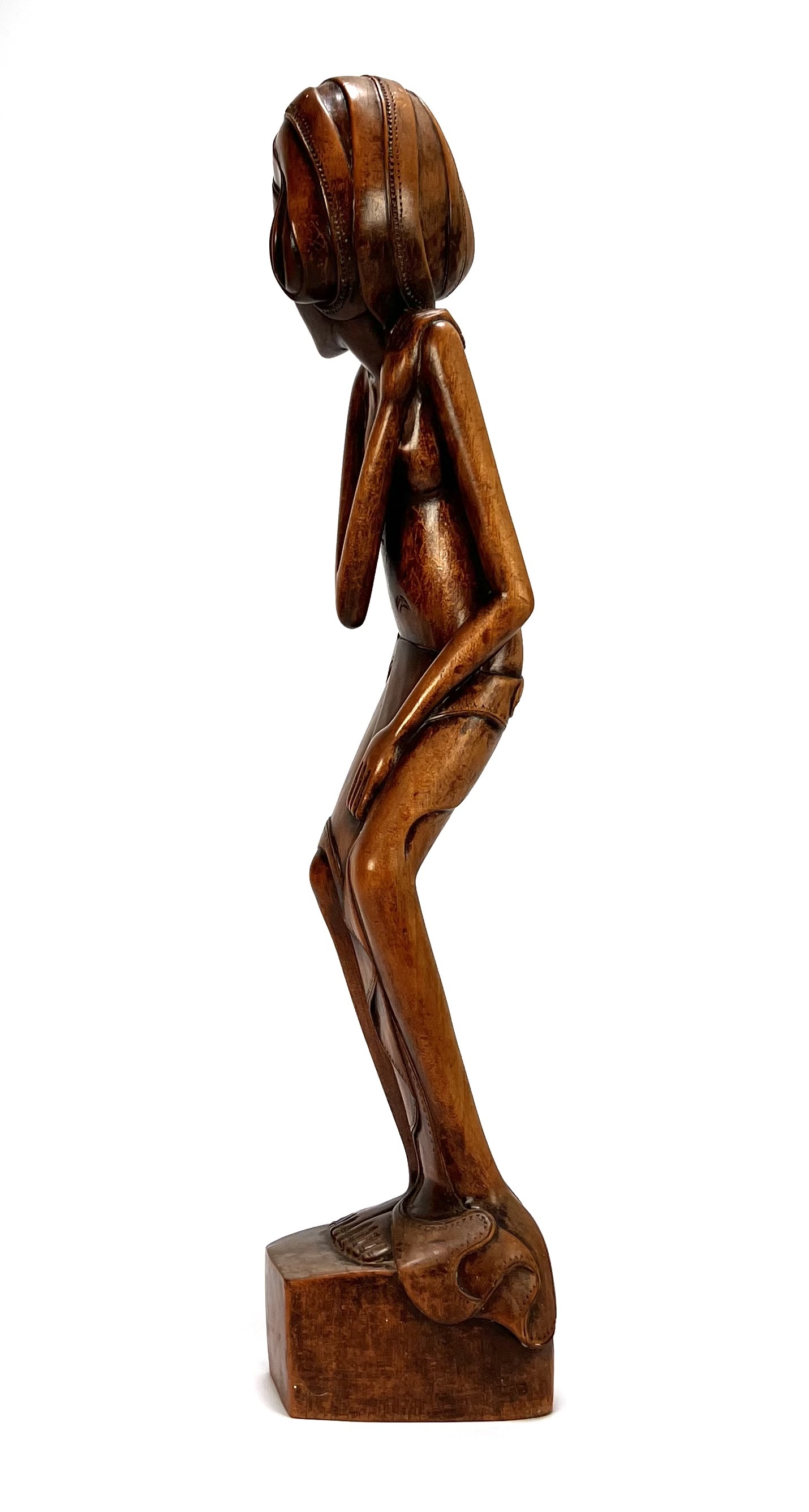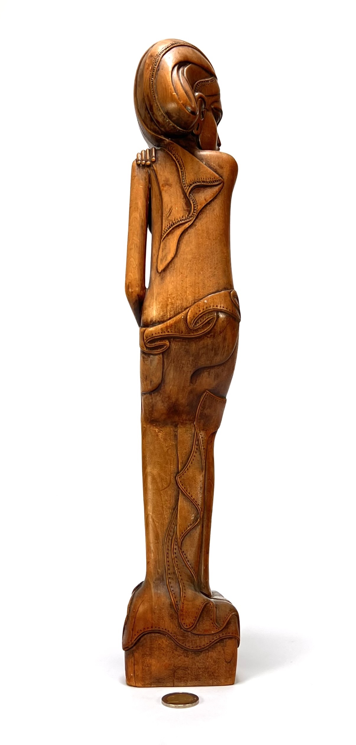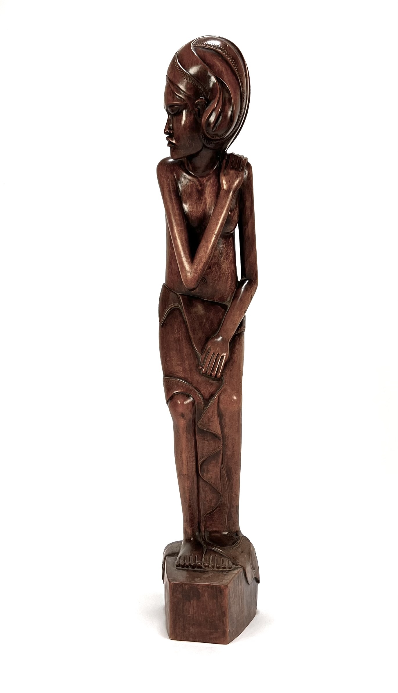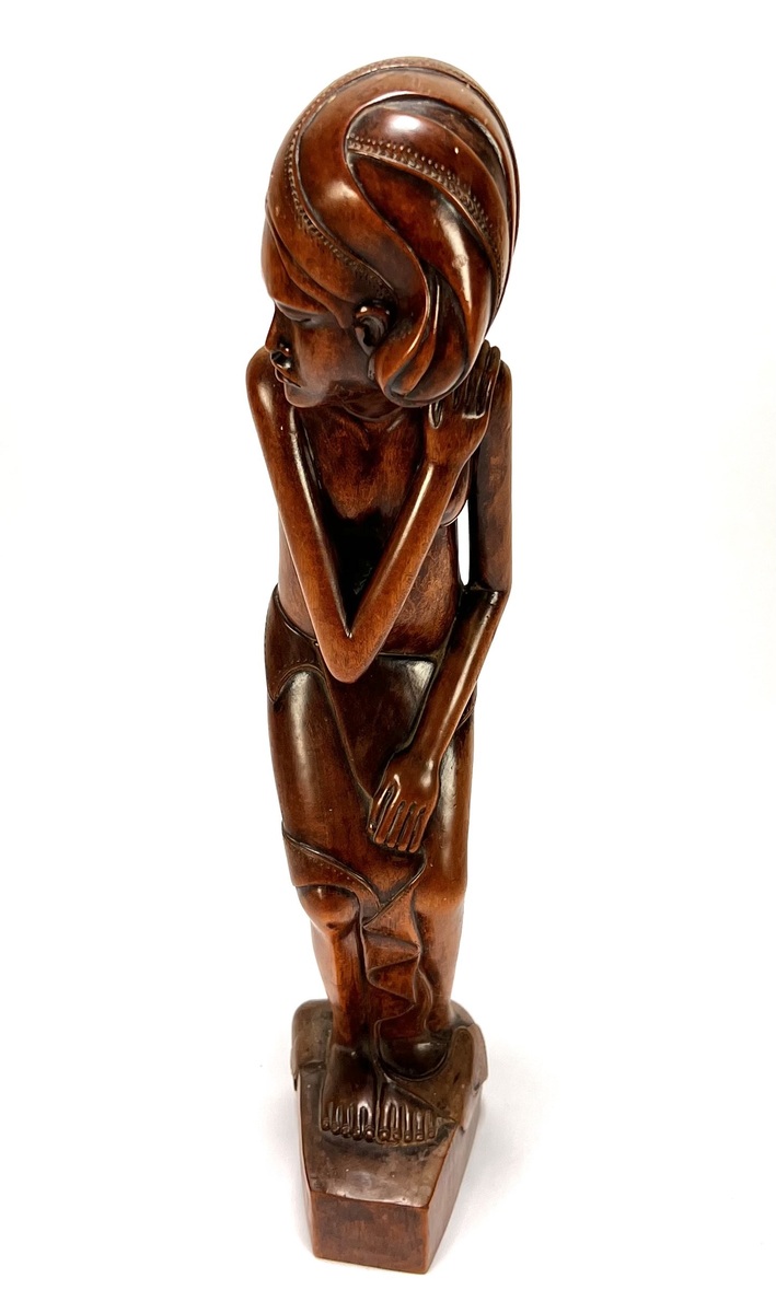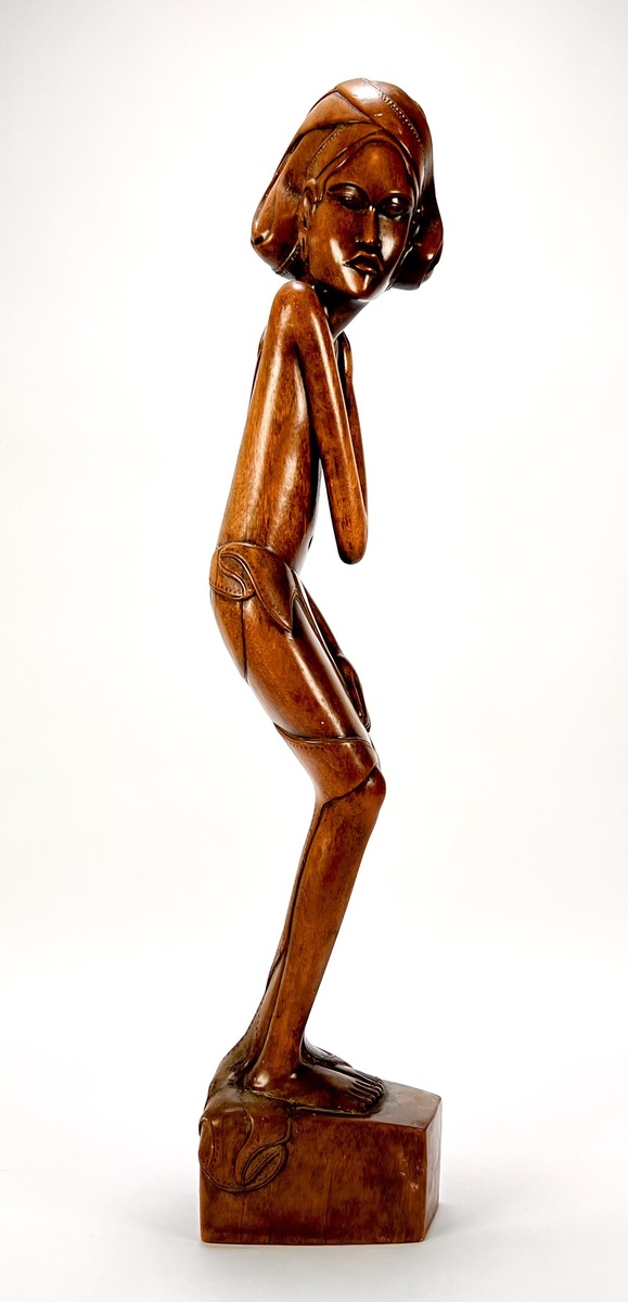 Makonde beeld uit Tanzania, late 20e eeuw, vervaardigd uit massief donker hardhout. Het beeld toont een gestileerd vrouwelijke figuur in een licht gebogen houding met de handen rustend op het lichaam. Zeker zijn van deelname? Plaats vanaf 3 april een schriftelijk bod online! |