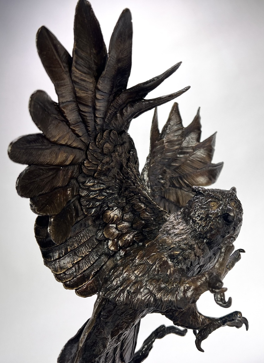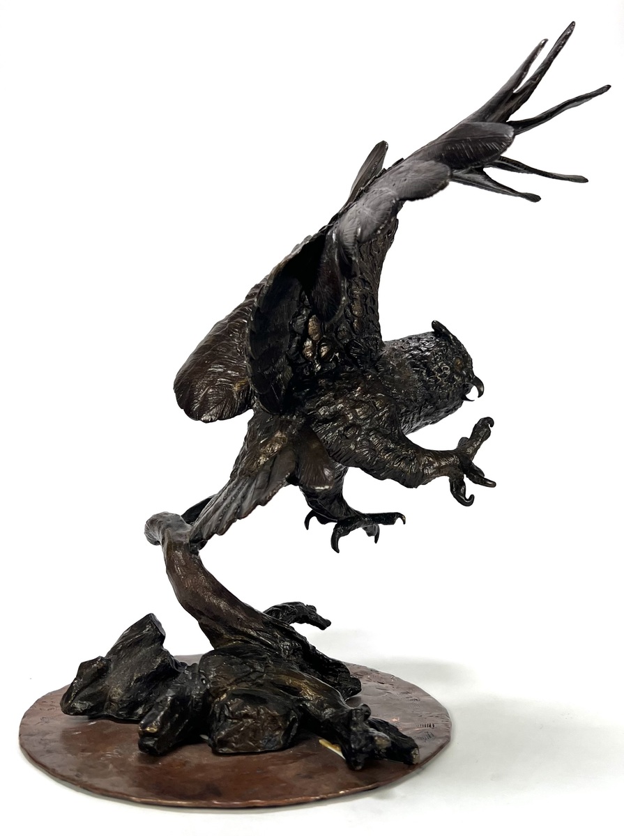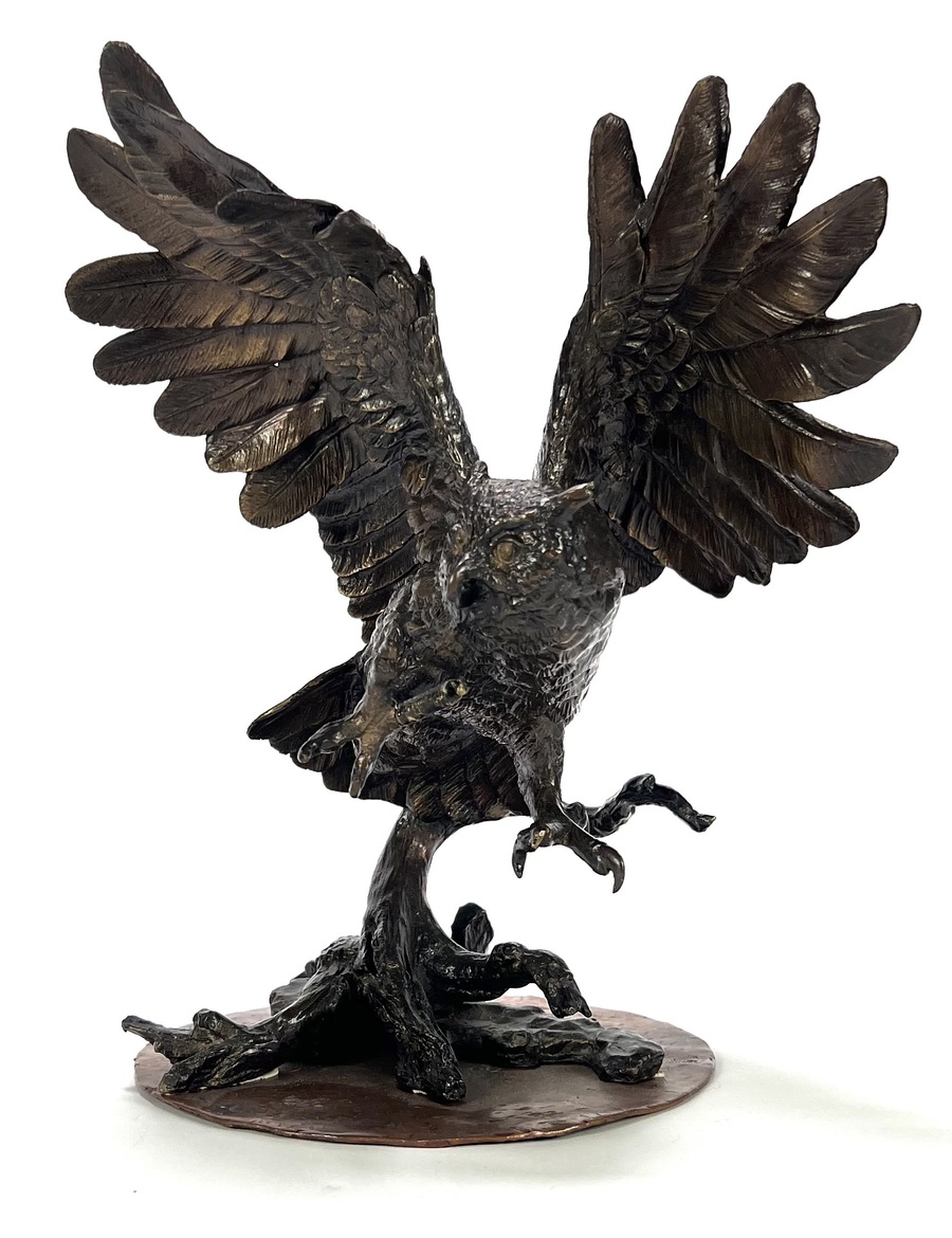 Bronzen beeld - jagende uil op boomstronk, late 20e eeuw