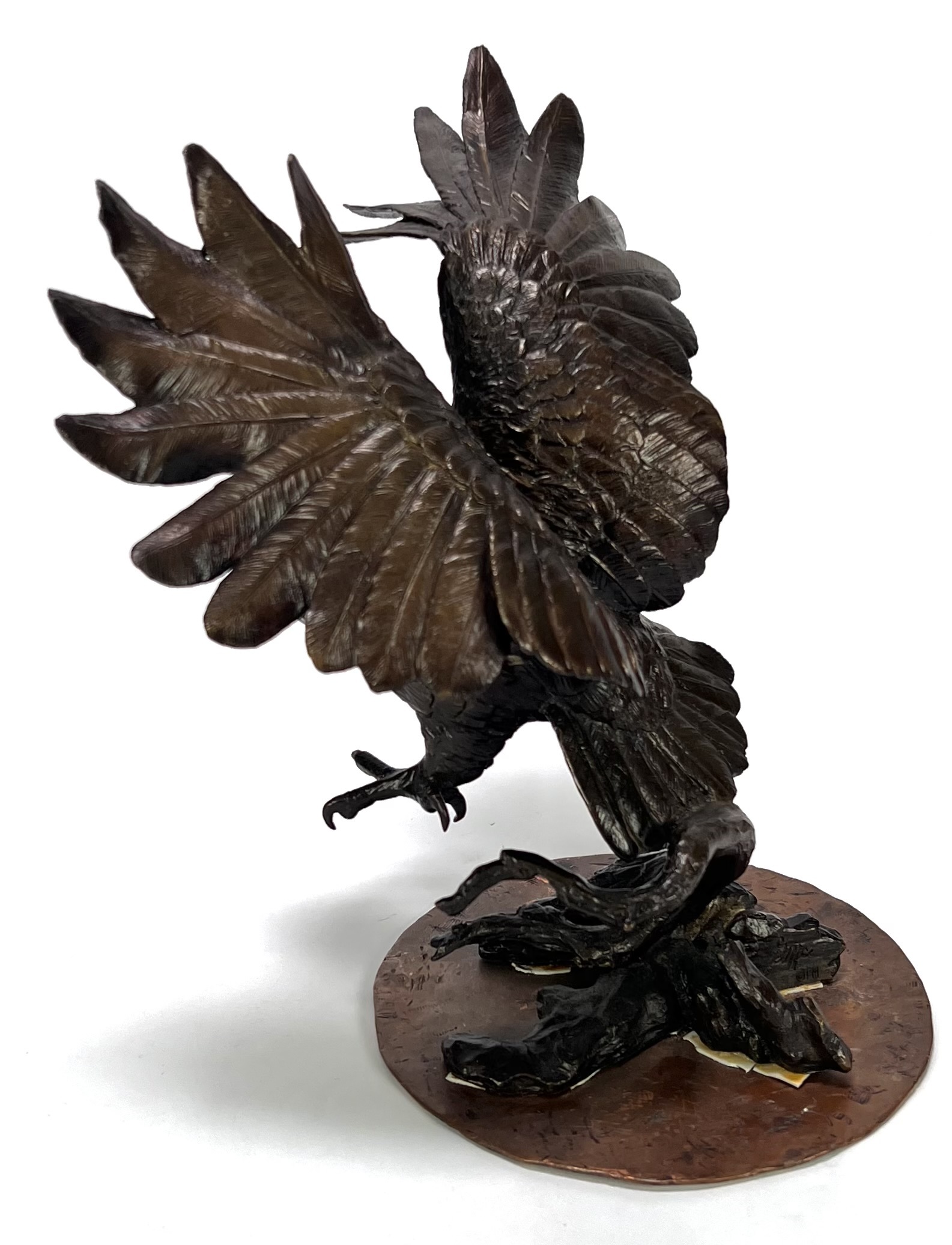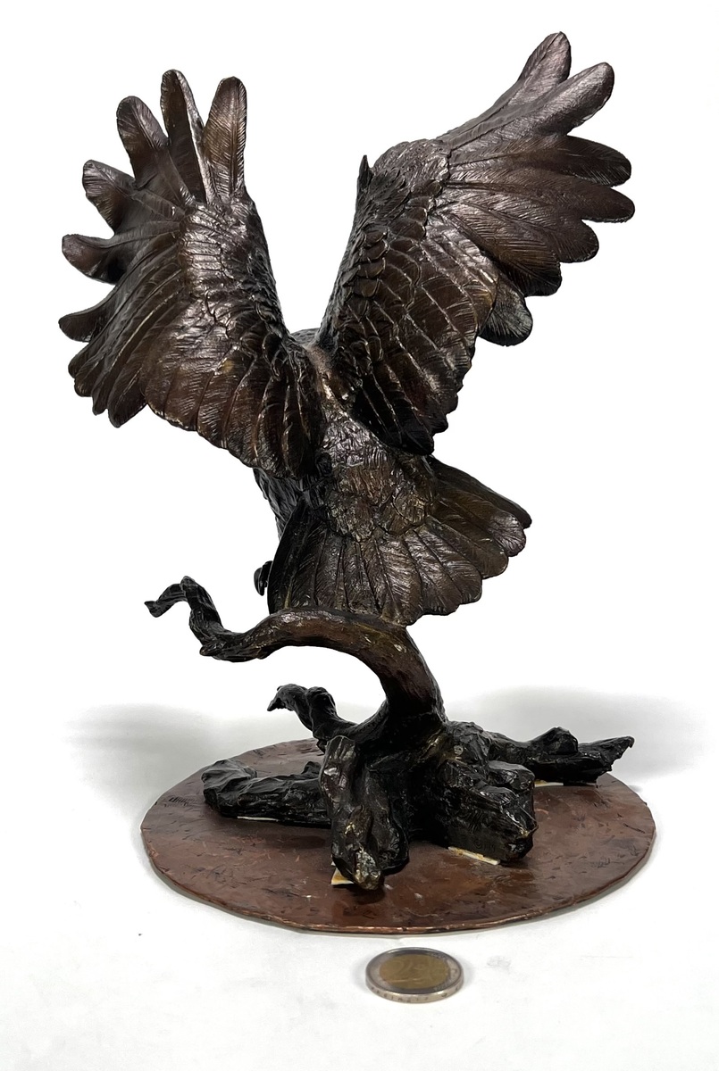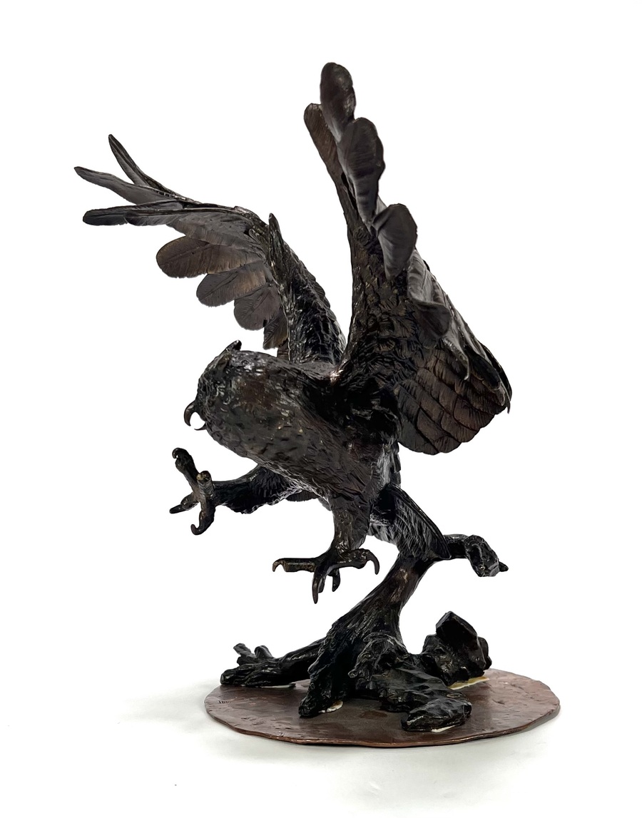 Bronzen beeld - jagende uil op boomstronk, late 20e eeuw