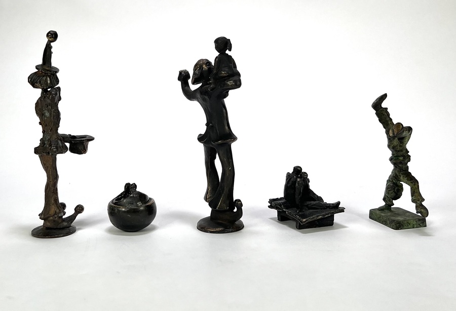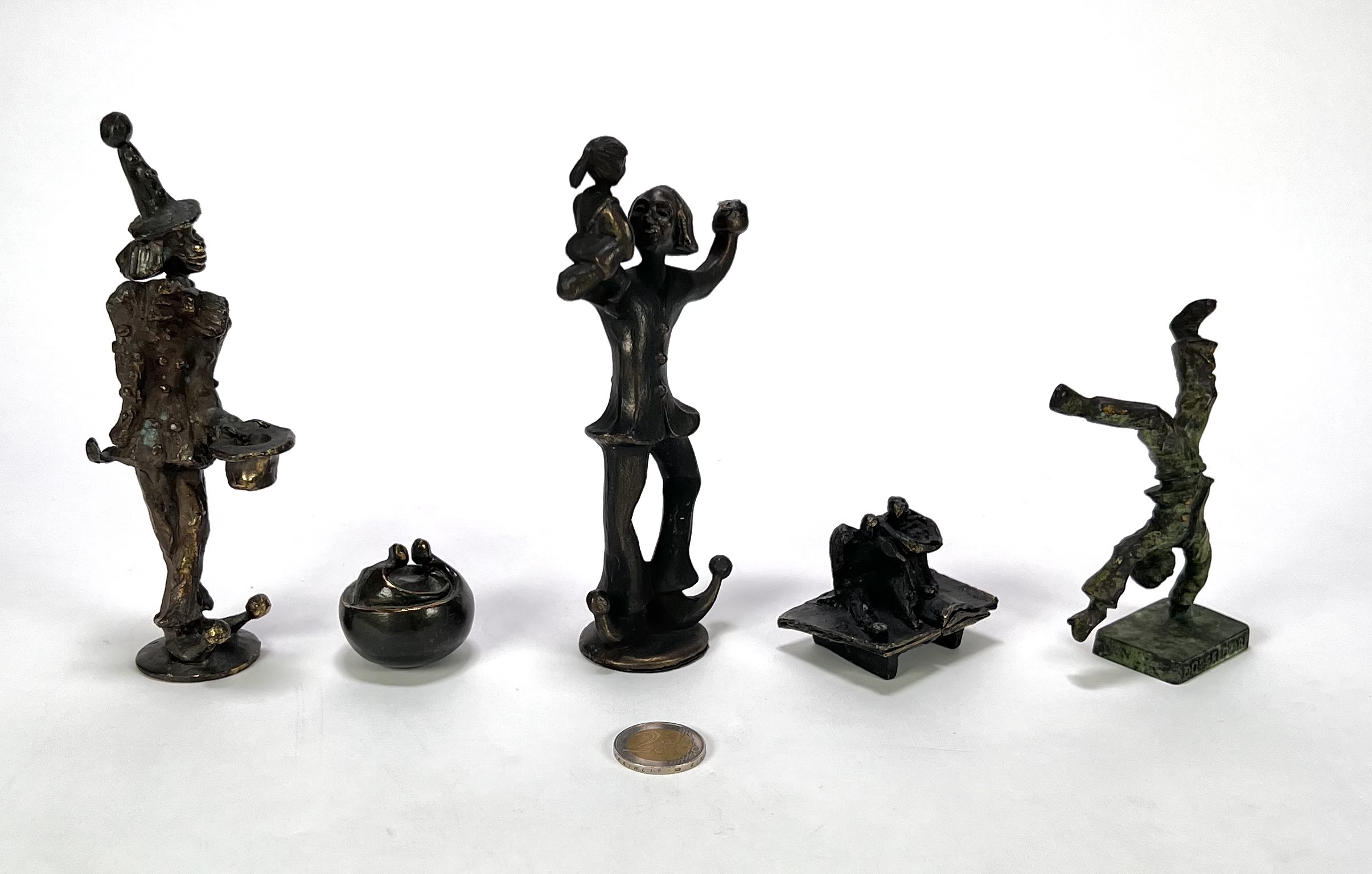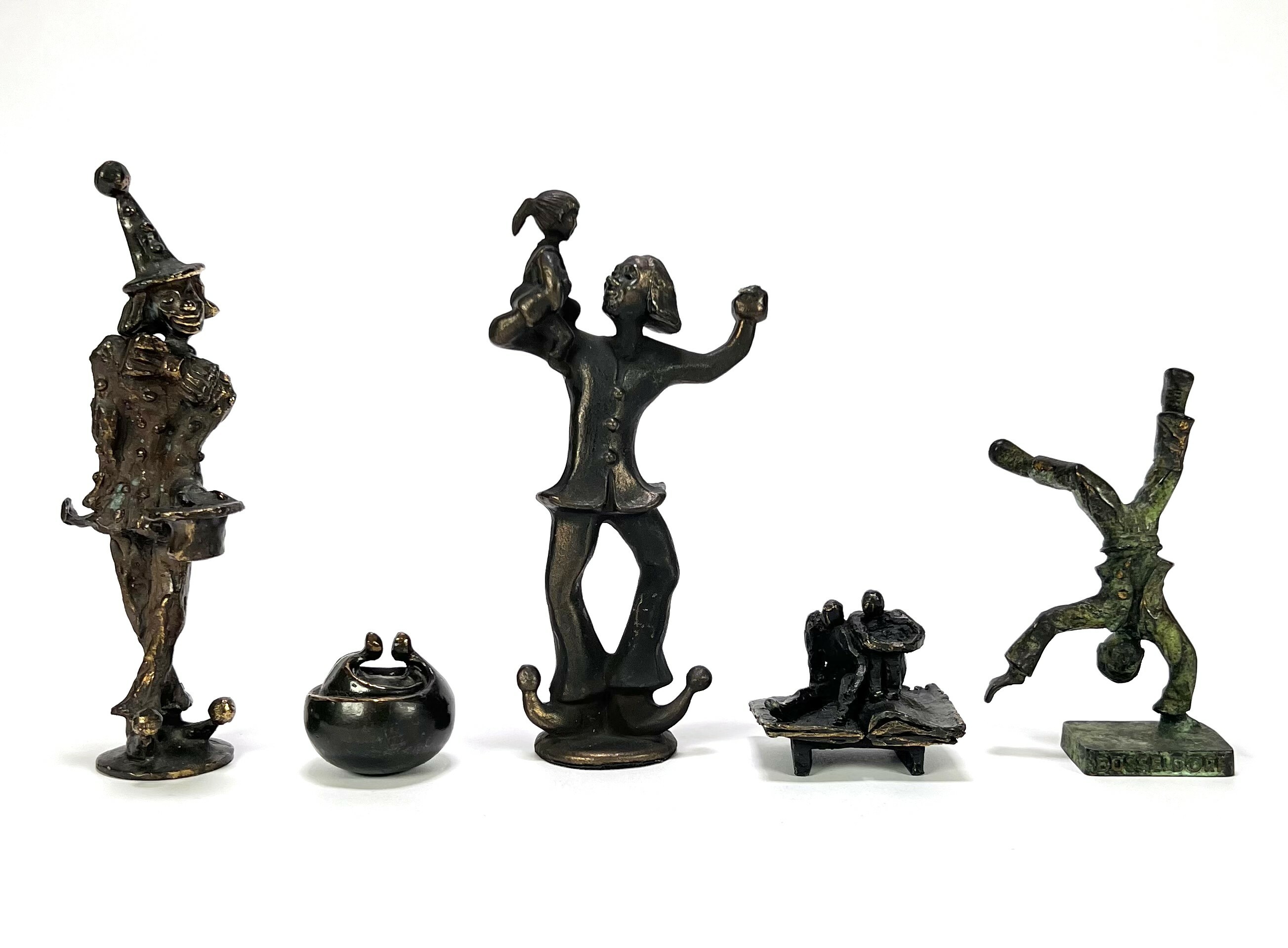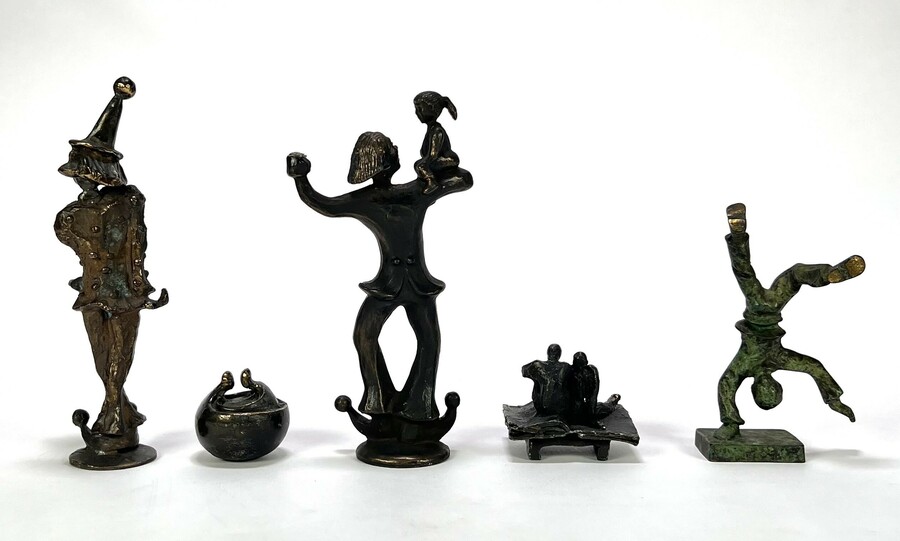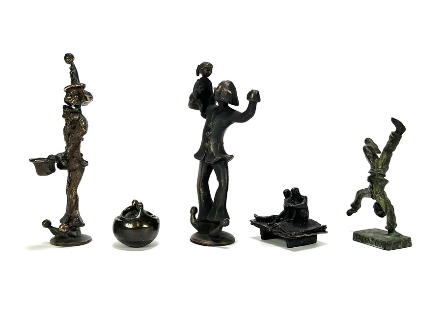 Vijf beelden uit de 21e eeuw, vervaardigd uit donker gepatineerd brons met gietwerk door Corry van Ammerlaan en anderen. De kavel omvat een pierrotachtige figuur, een acrobaat in handstand, een klein rond doosje en twee figuurlijke miniaturen op losse voet. Registreer nu en bied eenvoudig online mee op deze beeldjes! |