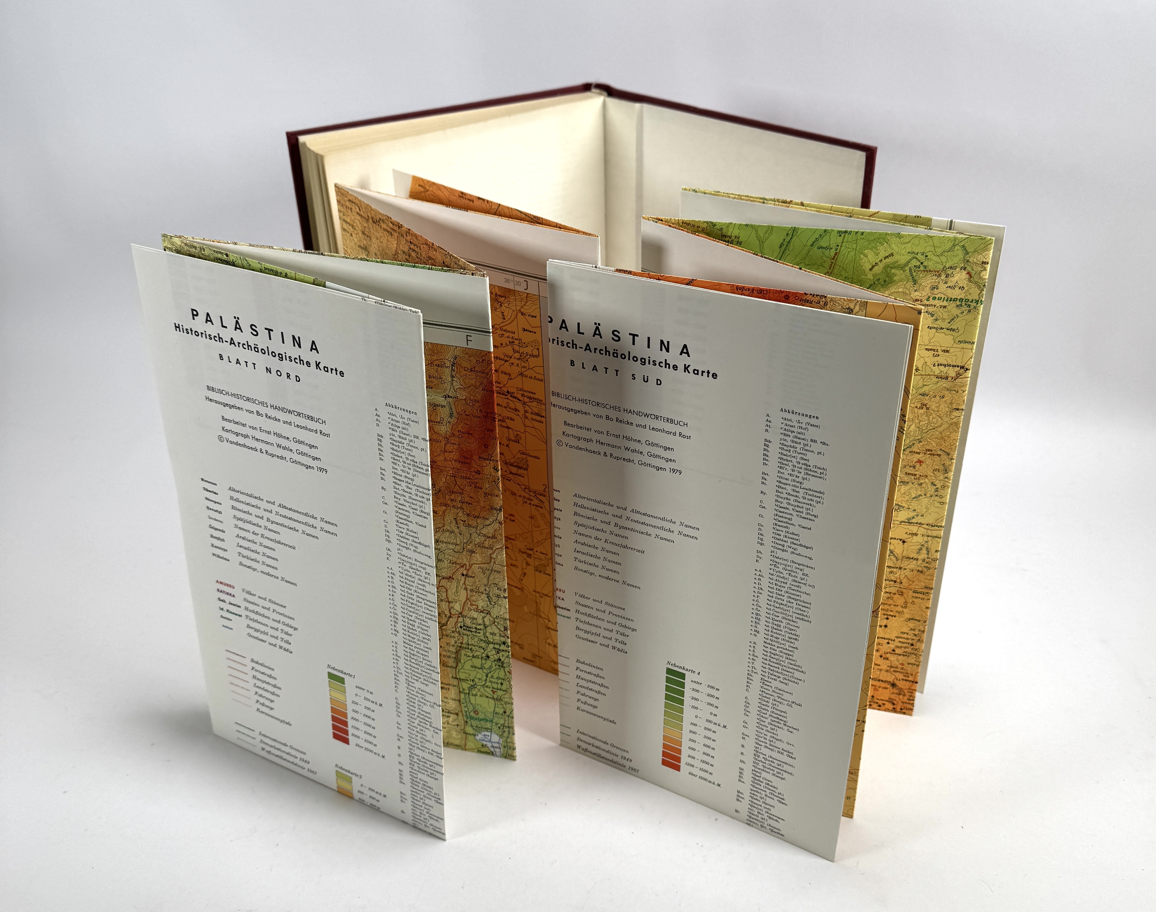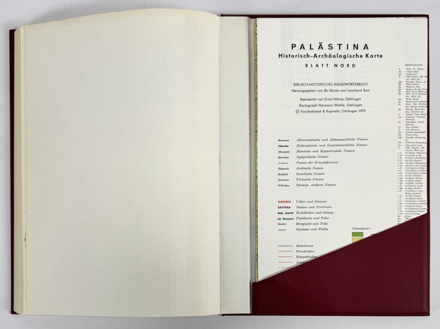 Duitstalige boeken van Bo Reicke (1914–1987) en Leonhard Rost (1896–1979) vervaardigd uit linnen en papier met goudopdruk op de ruggen. Het vierdelige "Biblisch-Historisches Handwörterbuch" omvat wetenschappelijke teksten over landkunde, geschiedenis en religie. Kenmerkend zijn de talrijke zwart-witplaten, kleurenafbeeldingen en de gedetailleerde zeskleurige vouwkaarten in de supplementaire band. Verschenen tussen 1962 en 1979 bij Vandenhoeck & Ruprecht te Göttingen Geïnteresseerd? Bezoek onze kijkdagen op 10, 11 en 12 april van 11:00 tot 17:00 uur! |