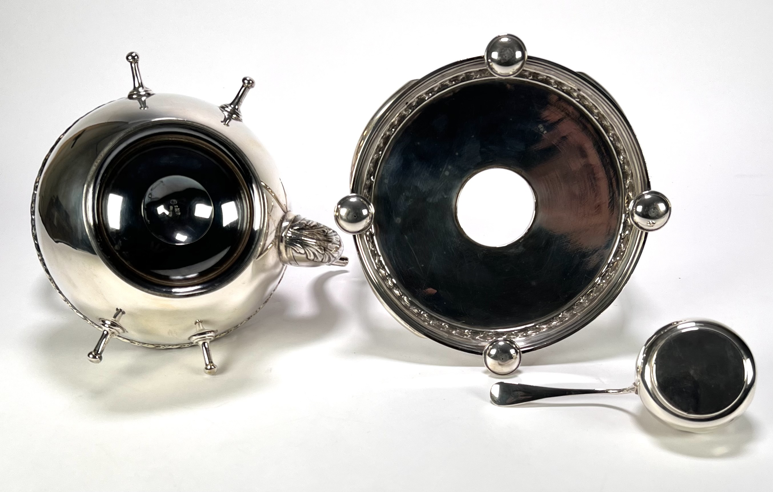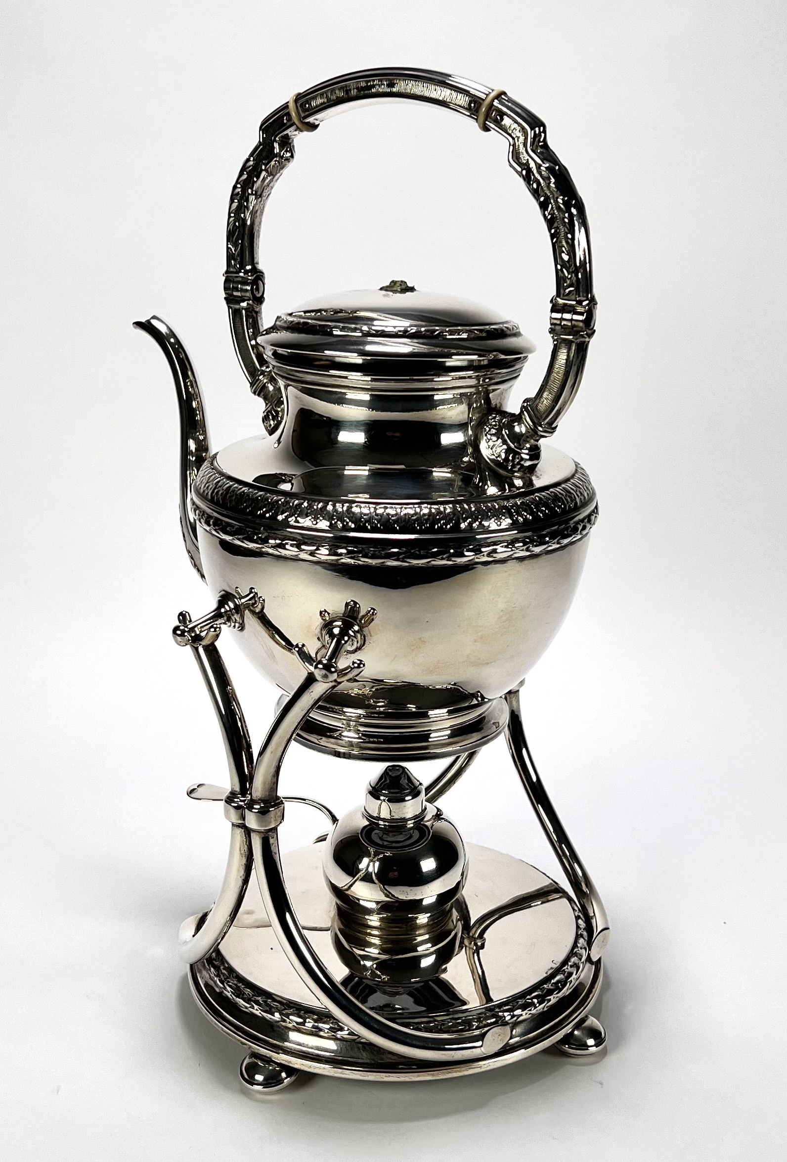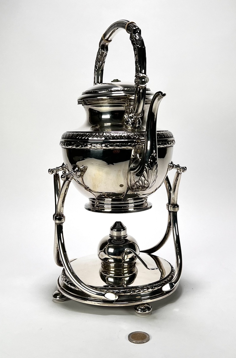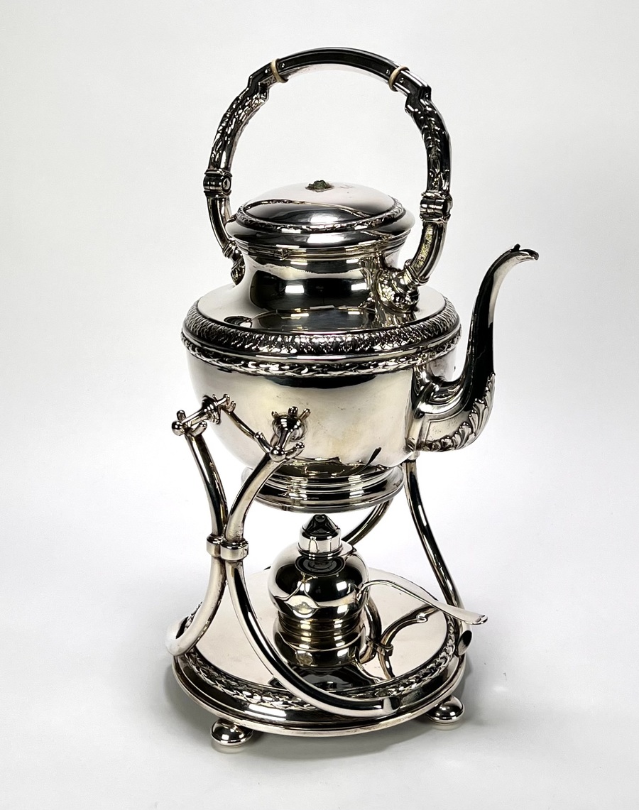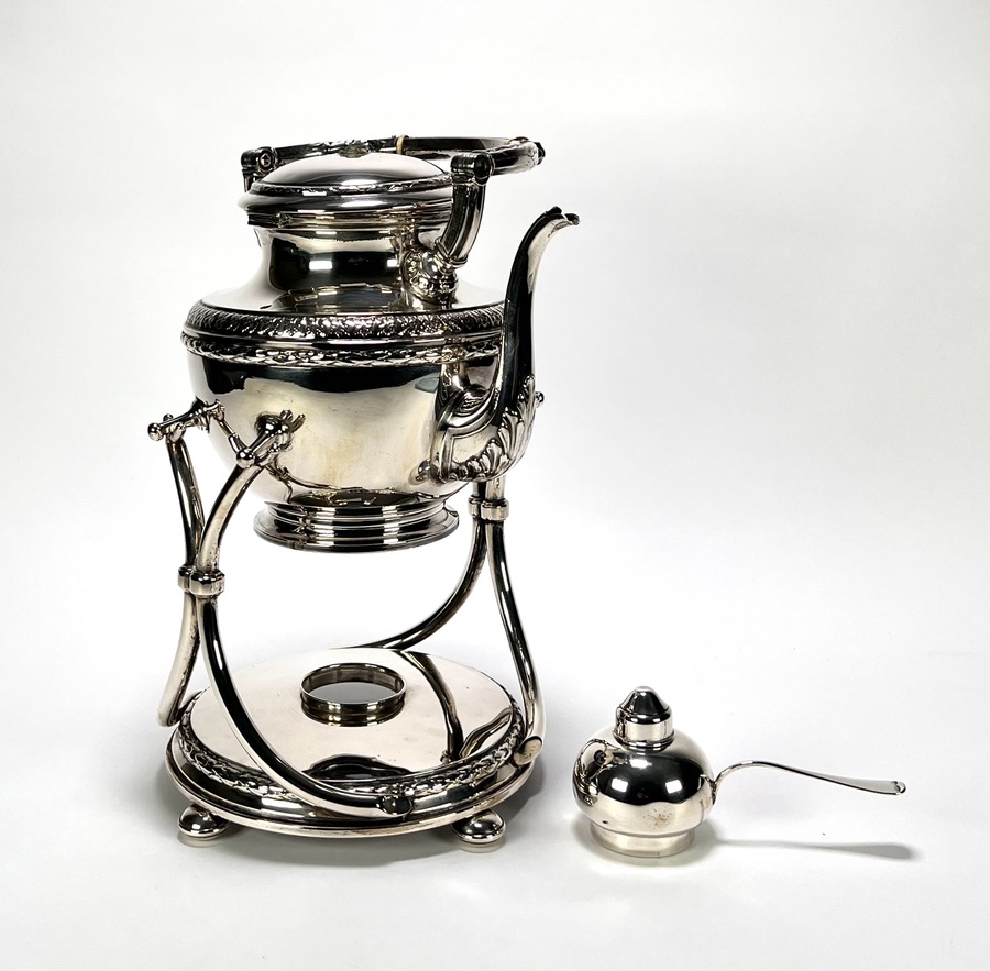 Zilveren bouilloire, waterketel met komfoor en brander, Mexico, midden 20e eeuw. De bolle ketel hangt in een opengewerkt standaard op bolvoeten en is voorzien van een hoog opgetrokken tuit, scharnierend hengsel en losse brander. Rand en aanzetten tonen gegoten bladornament. Gemerkt met Mexicaanse adelaar 3, initialen MR en gehaltestempel 916/1000. Geïnteresseerd? Bezoek onze kijkdagen op 10, 11 en 12 april van 11:00 tot 17:00 uur! |