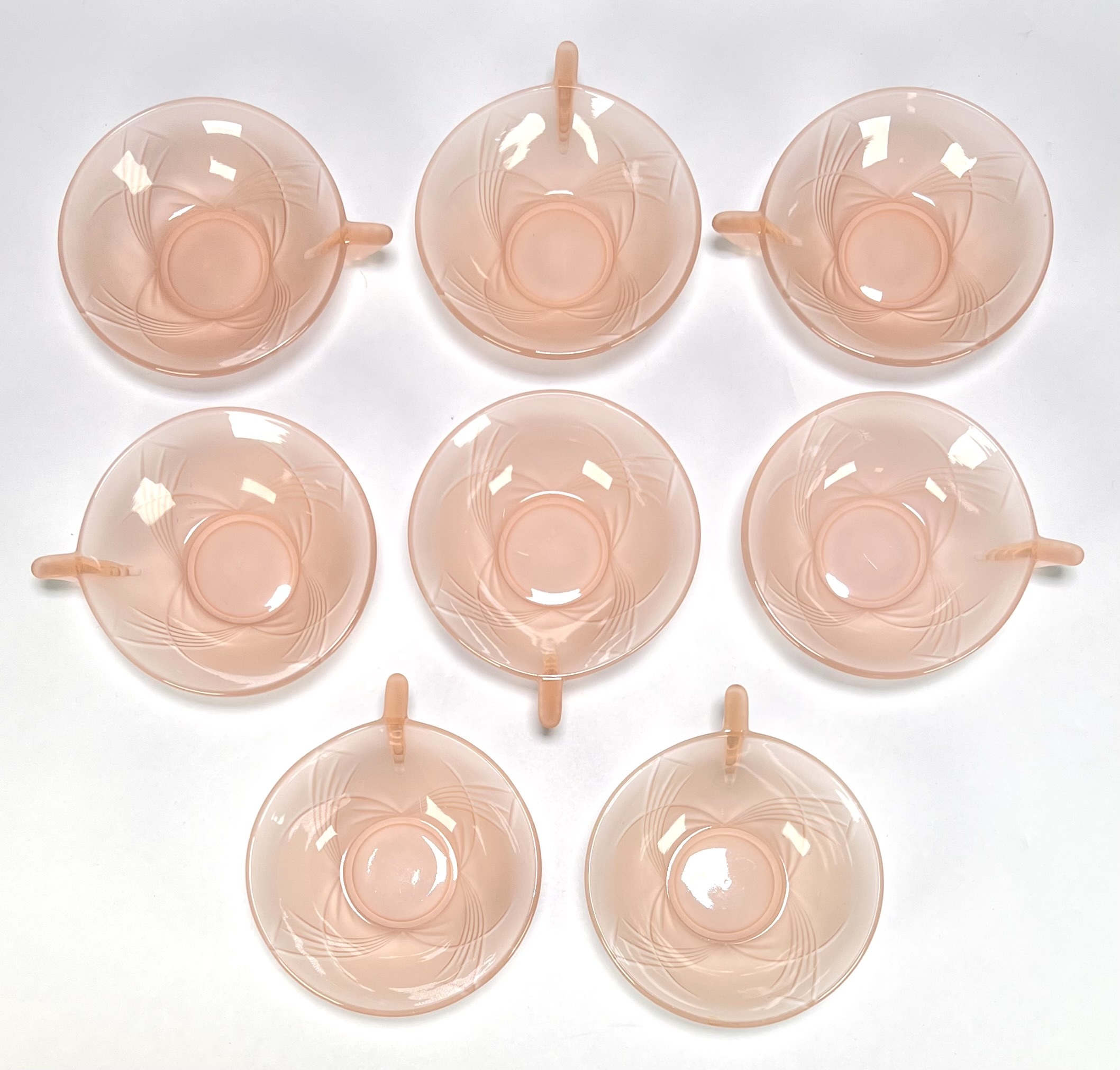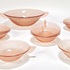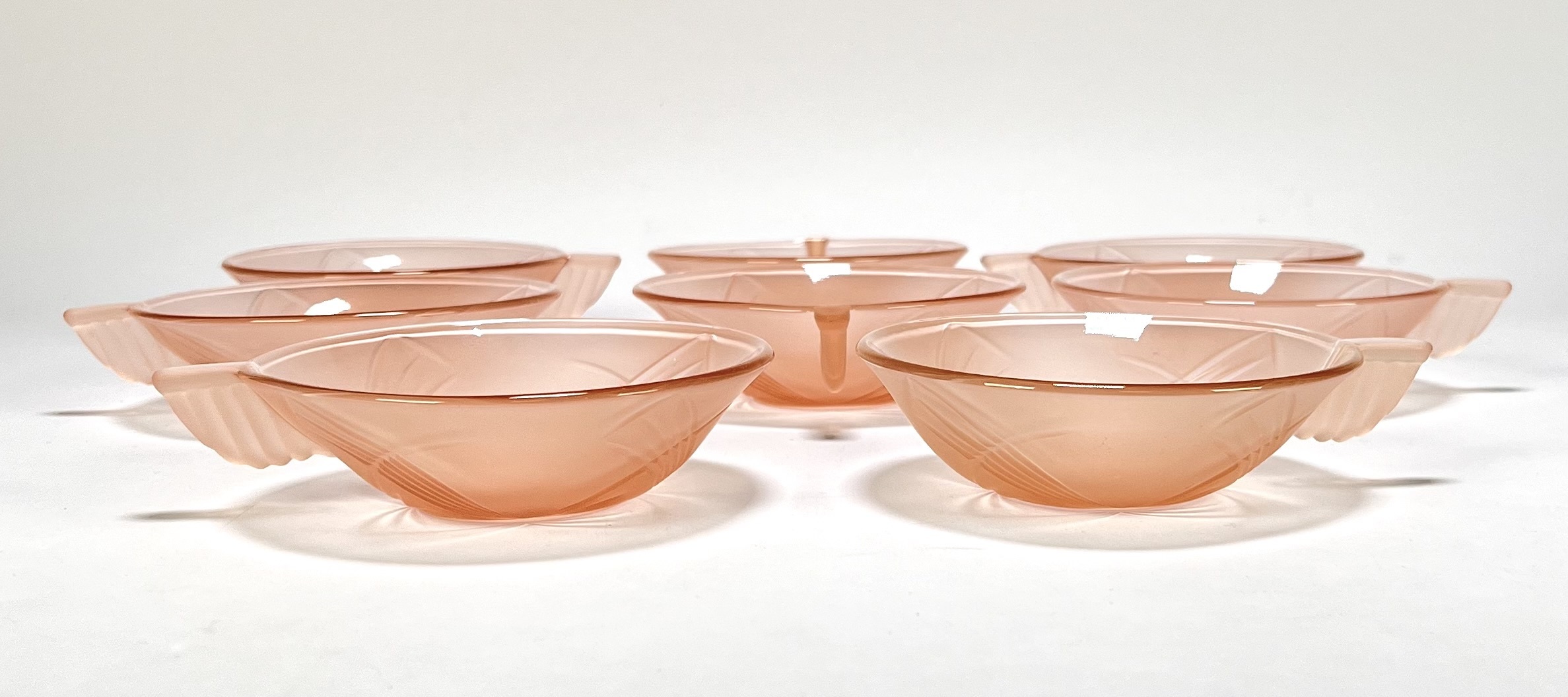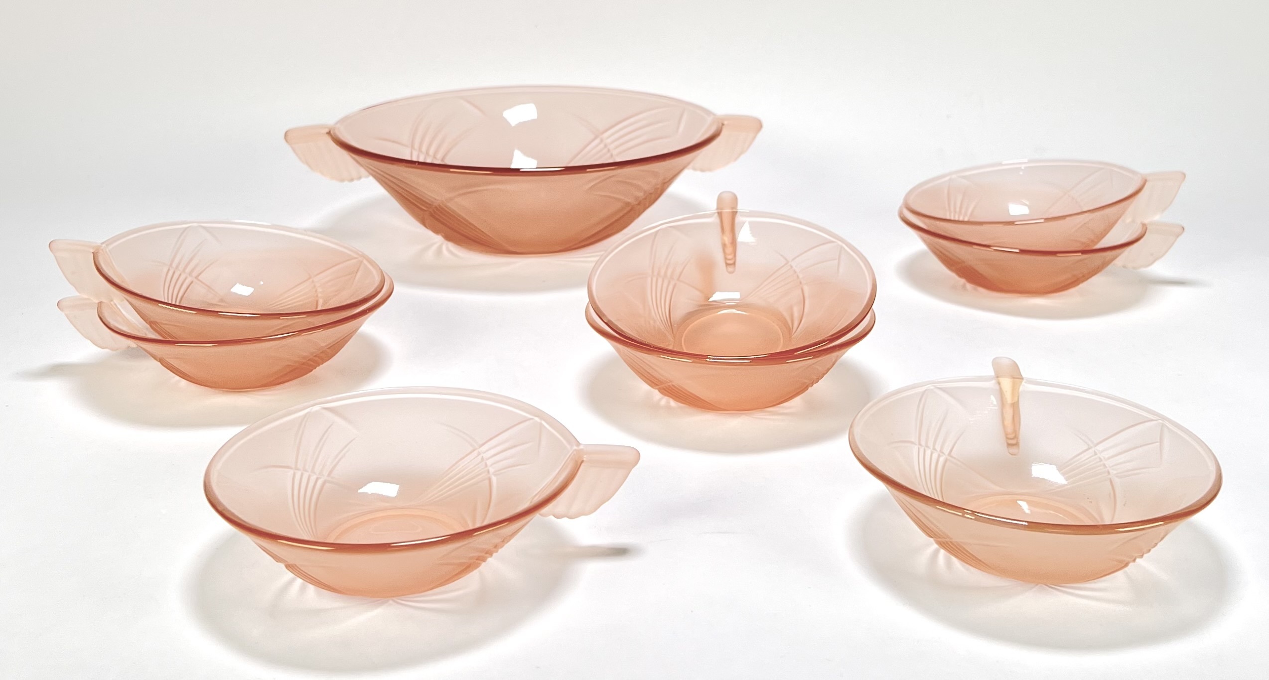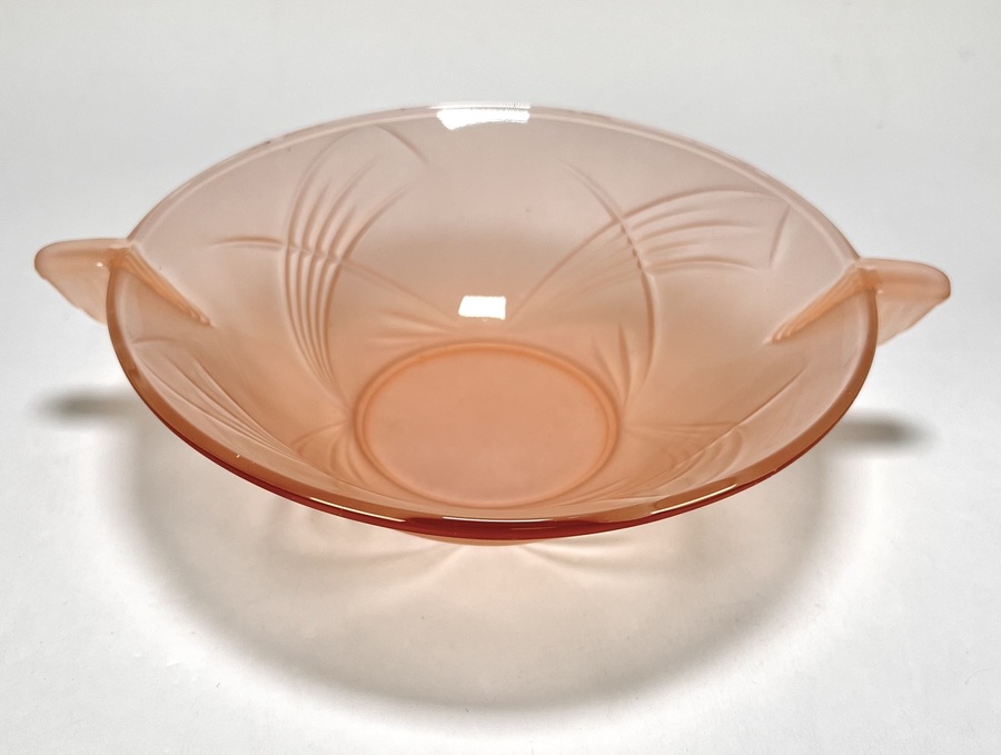 Schaal en kommen van oudroze persglas uit de Art Deco periode, circa 1935, vervaardigd uit geperst glas met reliëfdecoratie. Het servies omvat een grote serveerschaal en acht bijbehorende kommetjes, gedecoreerd met gestileerde waaiermotieven en voorzien van handvatten. Herkomst Centraal-Europa. Wil je direct deelnemen? Plaats vanaf 3 april alvast een schriftelijk bod via onze website! |