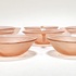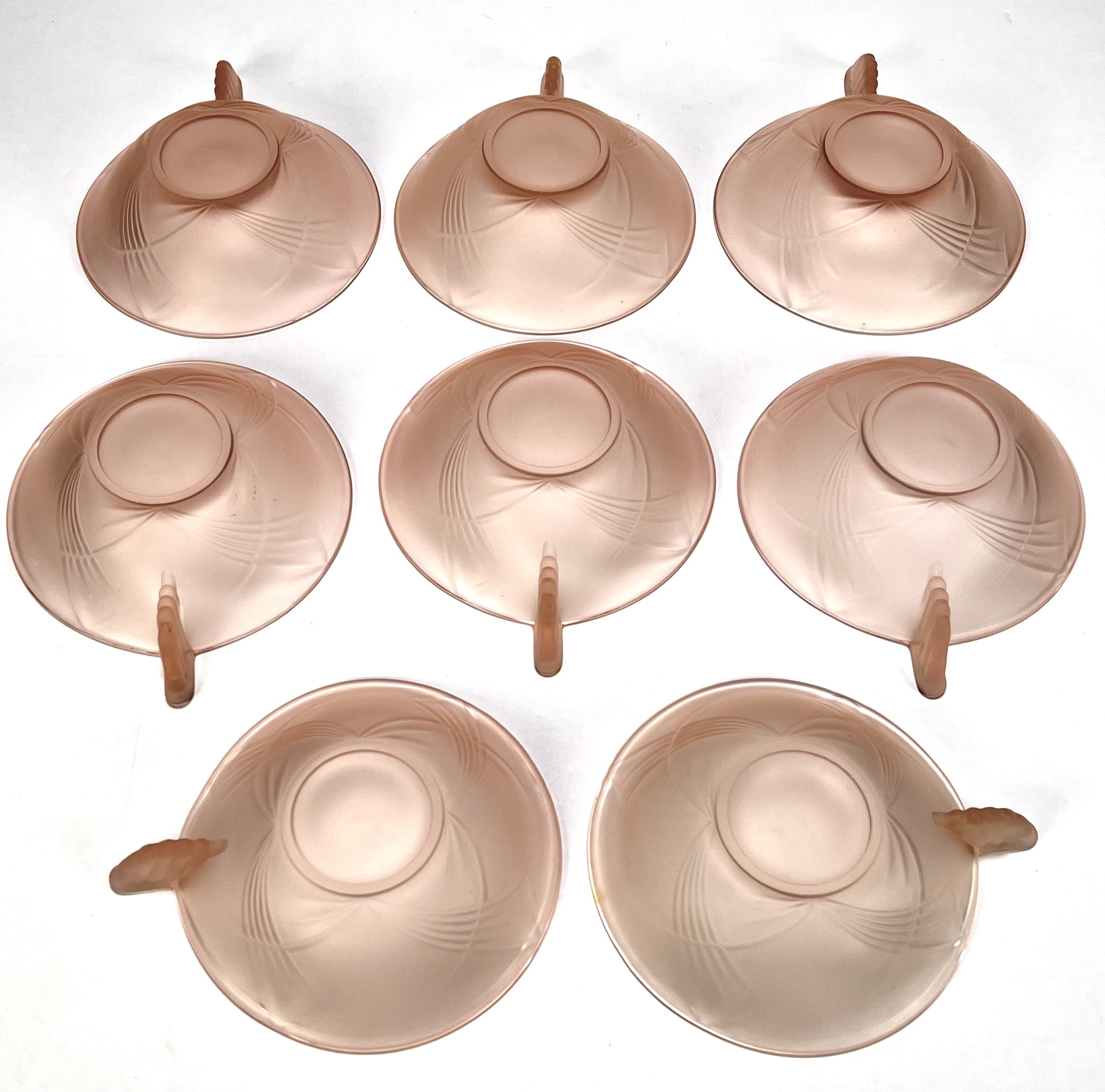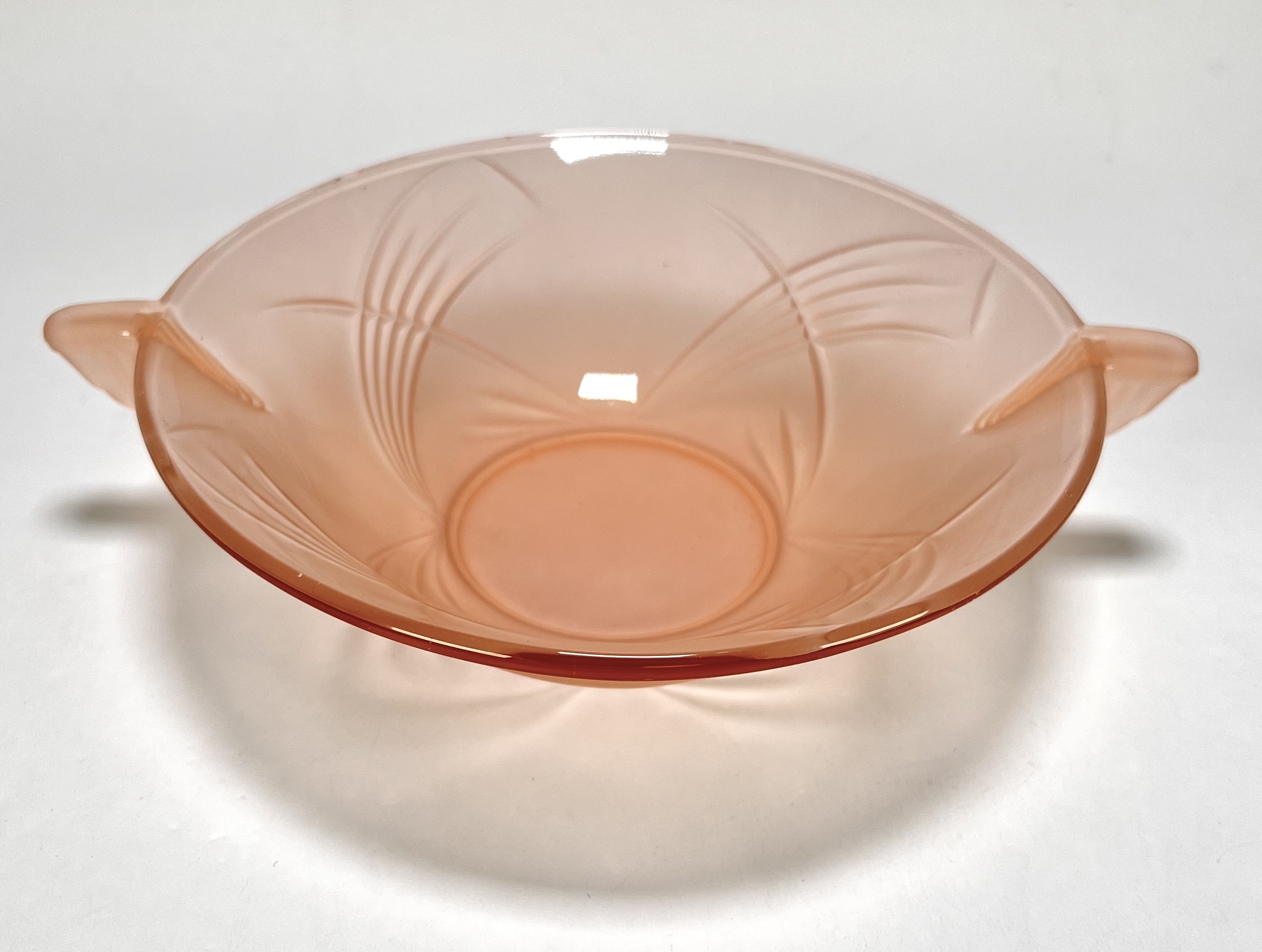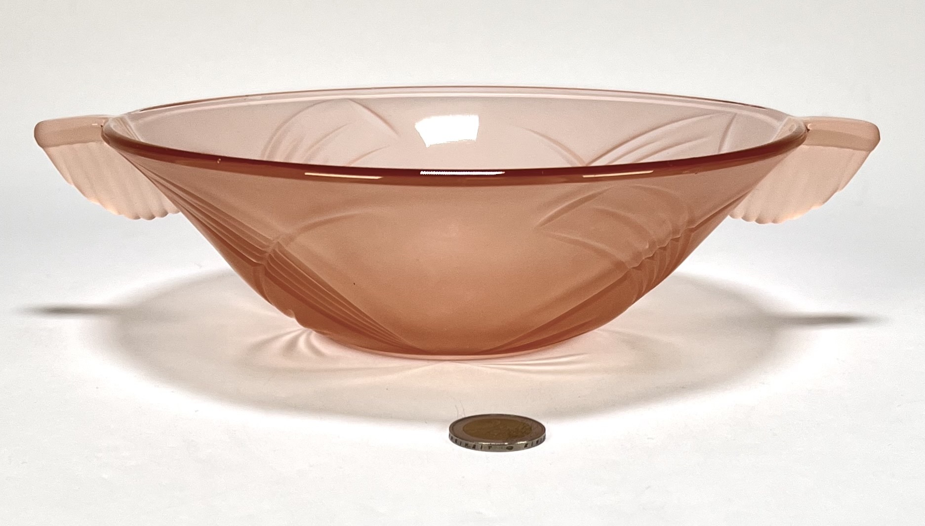 Schaal en kommen van oudroze persglas uit de Art Deco periode, circa 1935, vervaardigd uit geperst glas met reliëfdecoratie. Het servies omvat een grote serveerschaal en acht bijbehorende kommetjes, gedecoreerd met gestileerde waaiermotieven en voorzien van handvatten. Herkomst Centraal-Europa. Wil je direct deelnemen? Plaats vanaf 3 april alvast een schriftelijk bod via onze website! |