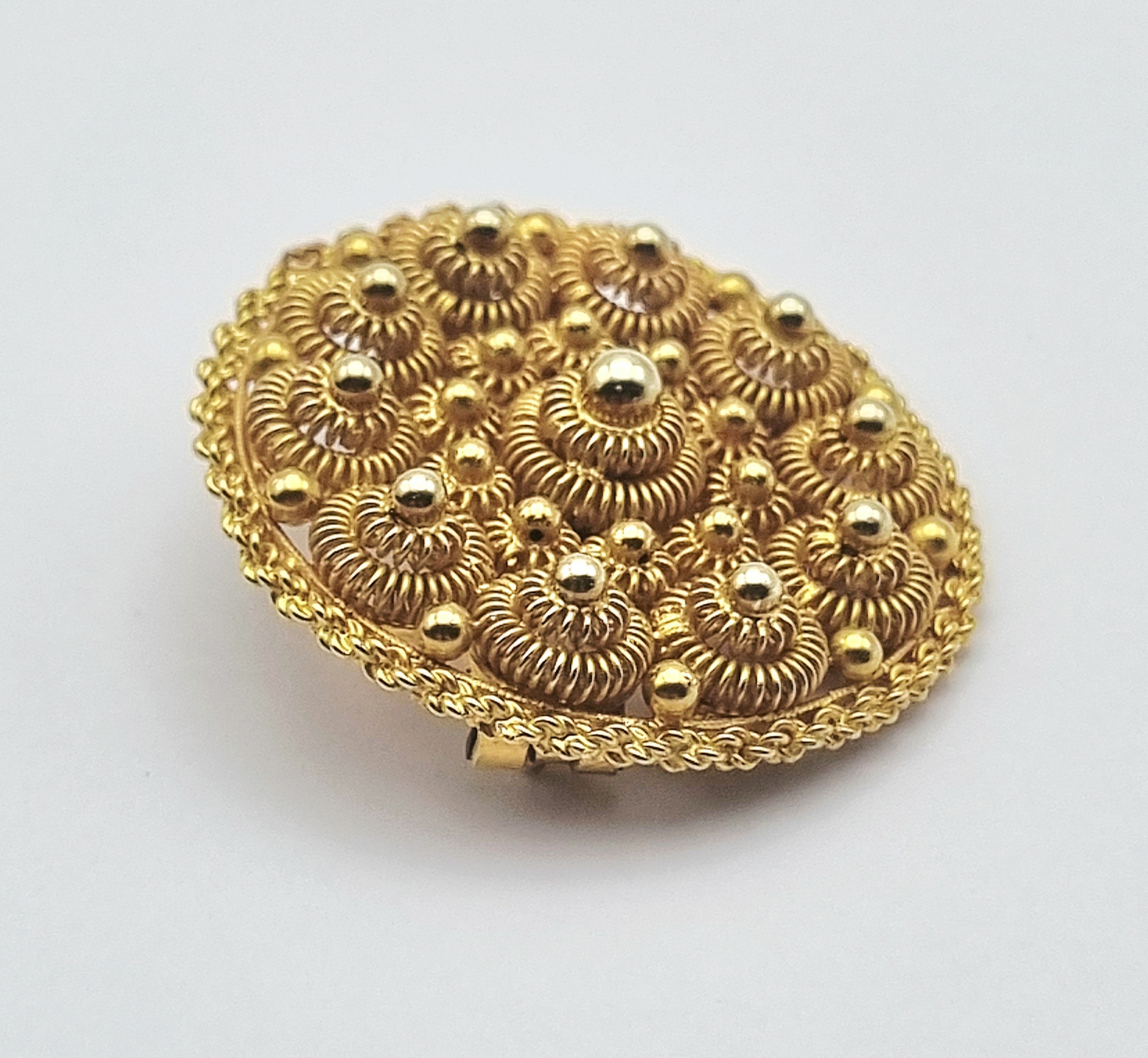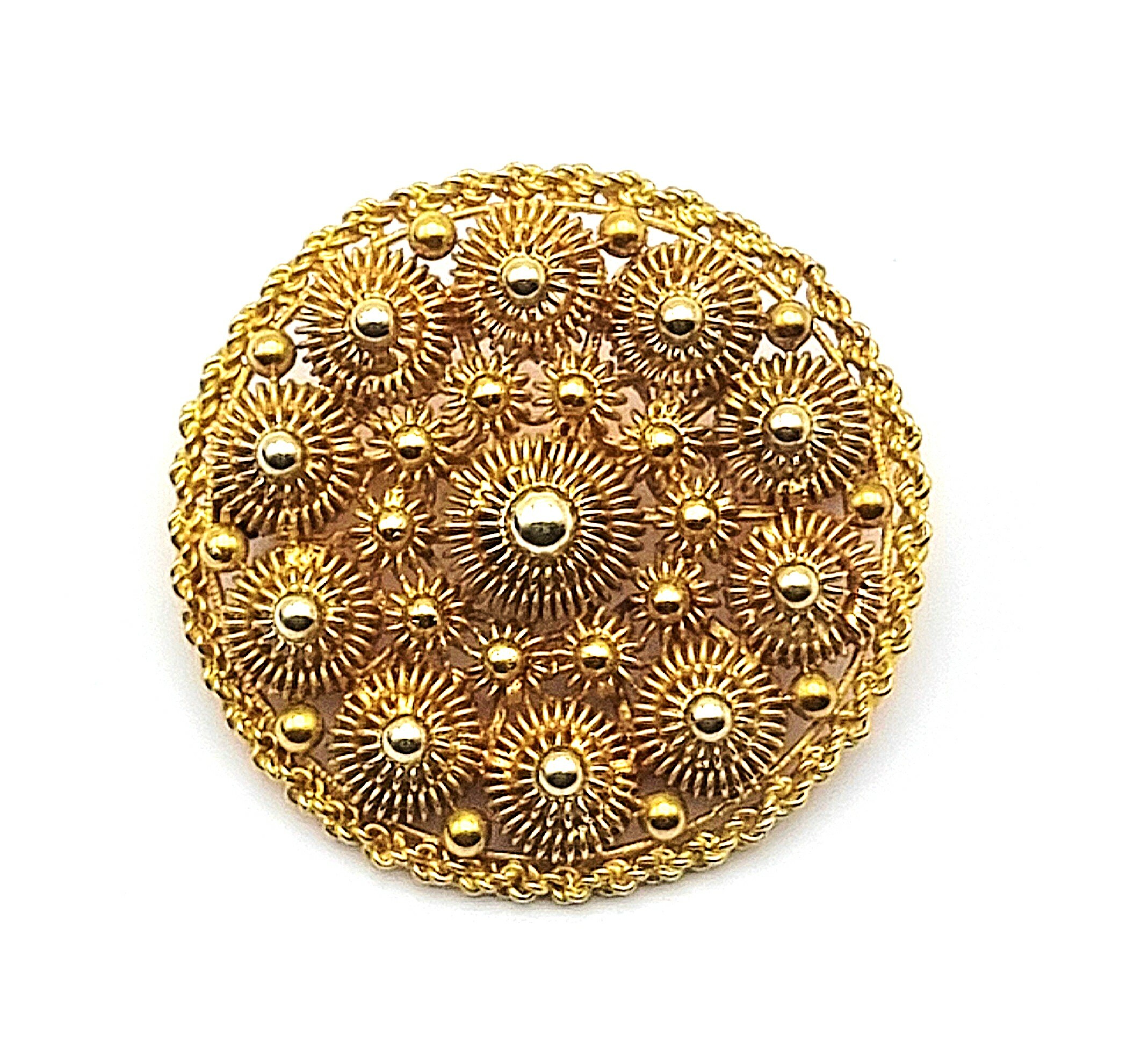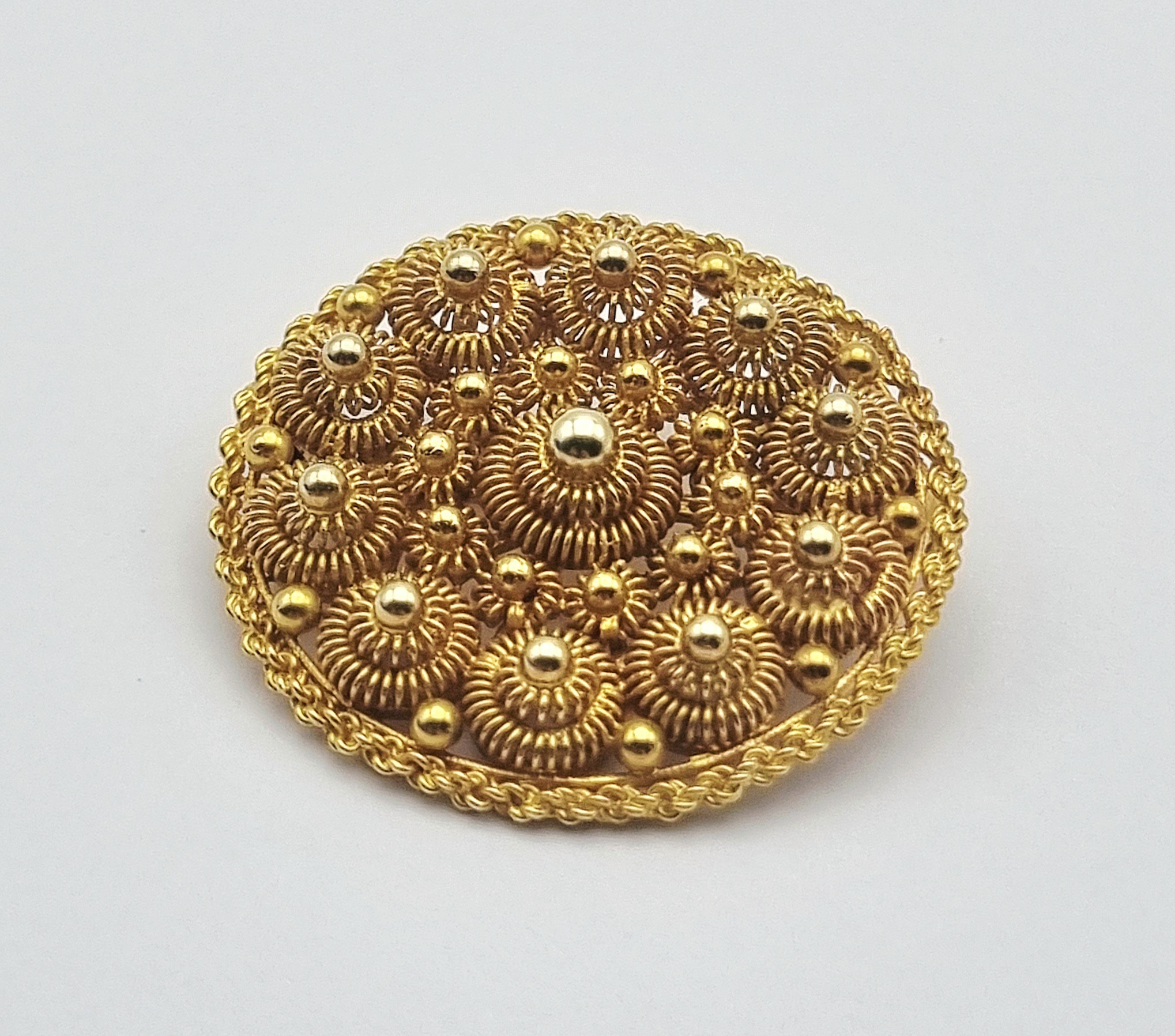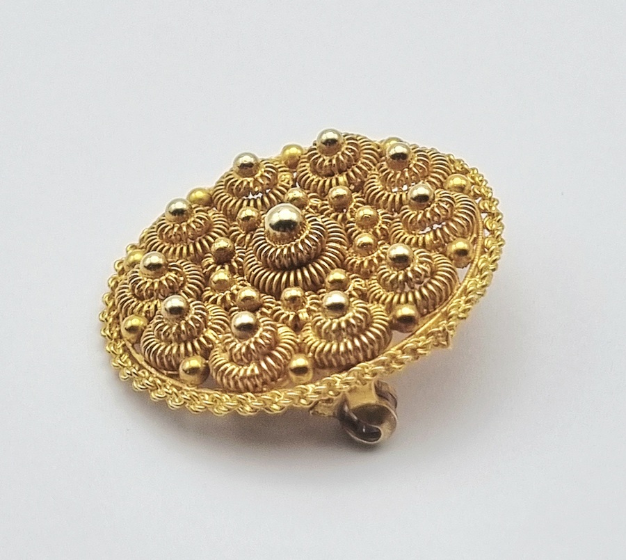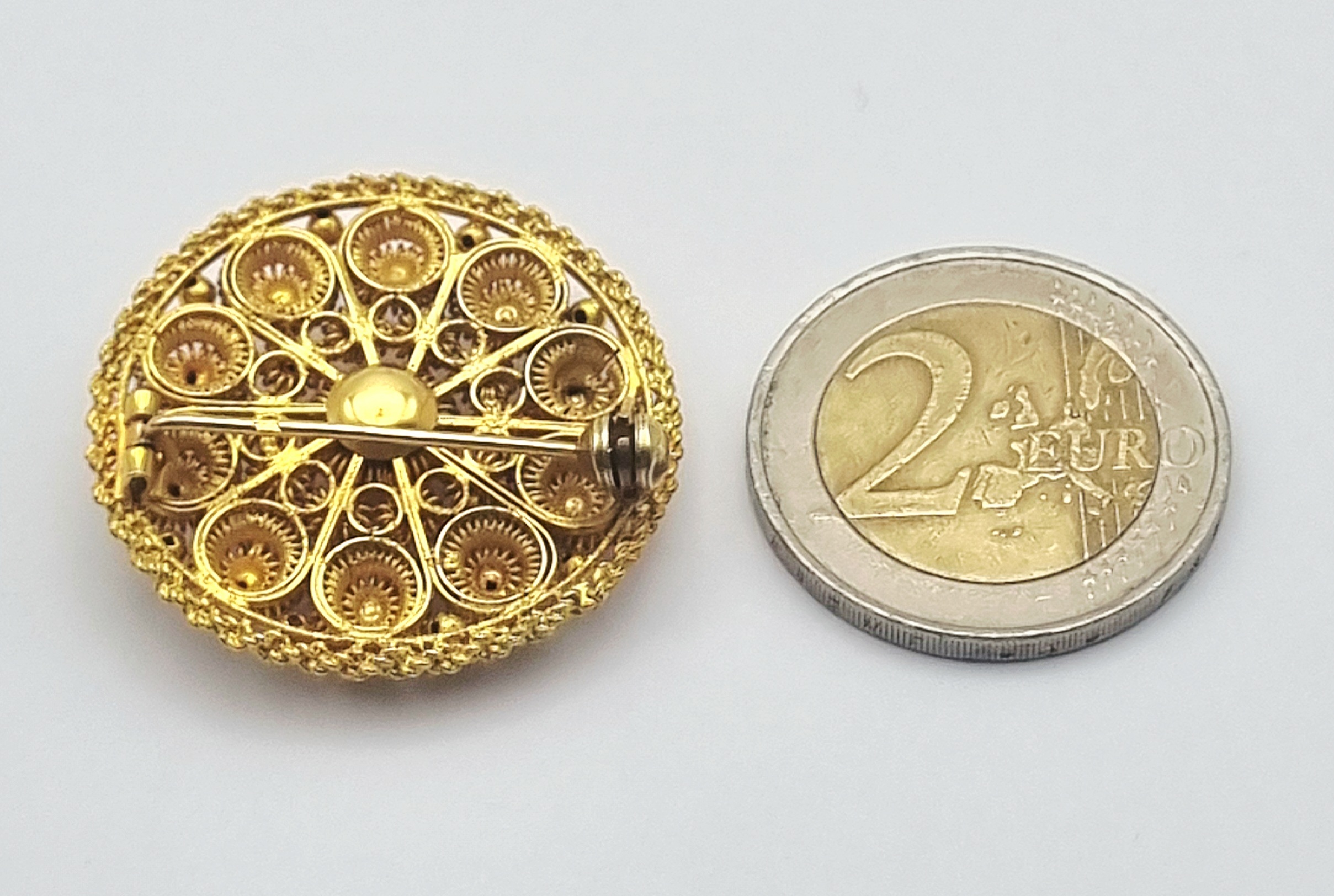 Gouden 14-karaats broche uitgevoerd als een Zeeuwse knoop, vervaardigd in de eerste helft van de twintigste eeuw. De broche toont gedetailleerd cannetille-werk en granulatie in een cirkelvormig ontwerp met een centraal ornament. De achterzijde is gemerkt met het Nederlandse eikenblad voor 14-karaats goud, Geïnteresseerd? Bezoek onze kijkdagen op 10, 11 en 12 april van 11:00 tot 17:00 uur! |