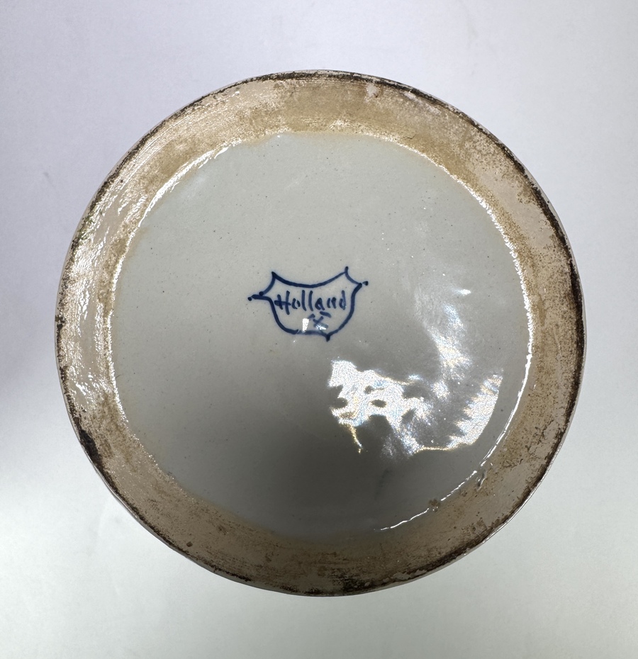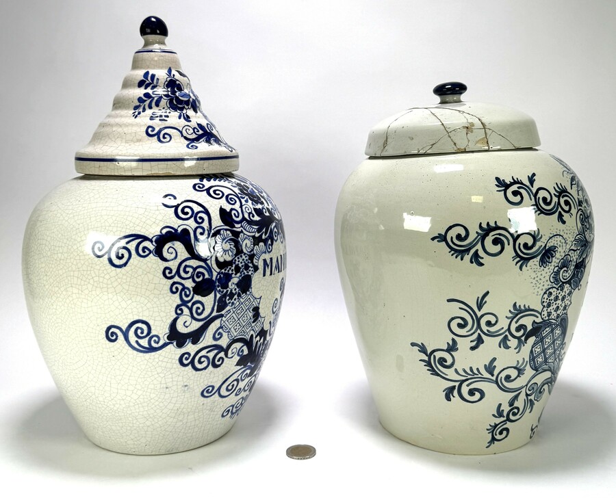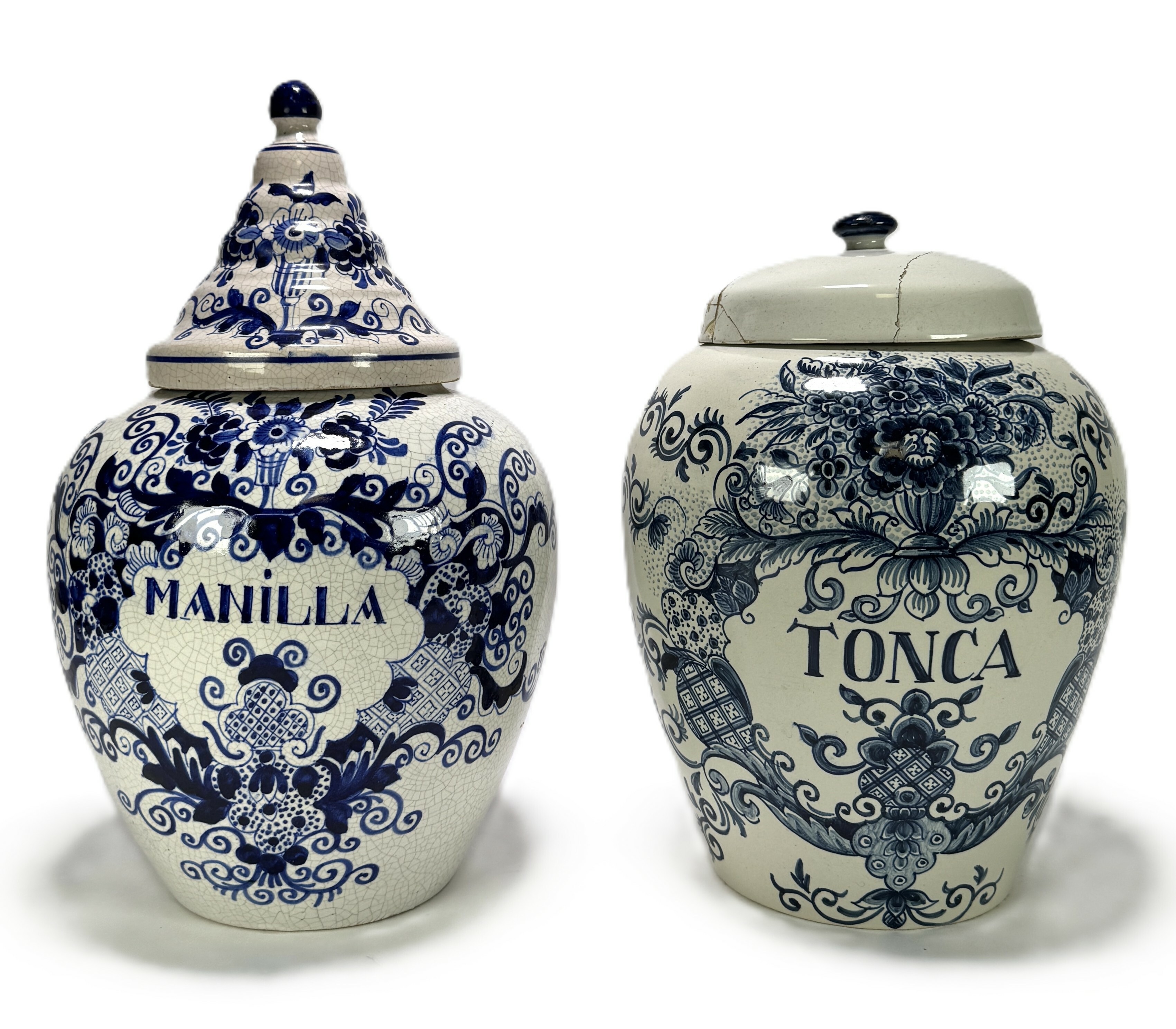 Twee tabakspotten; een gemerkt met De Drie Klokken (onecht) en een gemerkt Koninklijke Tichelaar Makkum, vervaardigd uit aardewerk met handbeschilderd blauw-wit decor. De tabakspotten hebben een balustervorm en opschriften 'Manilla' en 'Tonca' binnen barokke cartouches. Fabrieksmerken aan de onderzijden, datering eerste helft 20e eeuw en een Nederlandse herkomst. Wil je direct deelnemen? Plaats vanaf 3 april alvast een schriftelijk bod via onze website! |