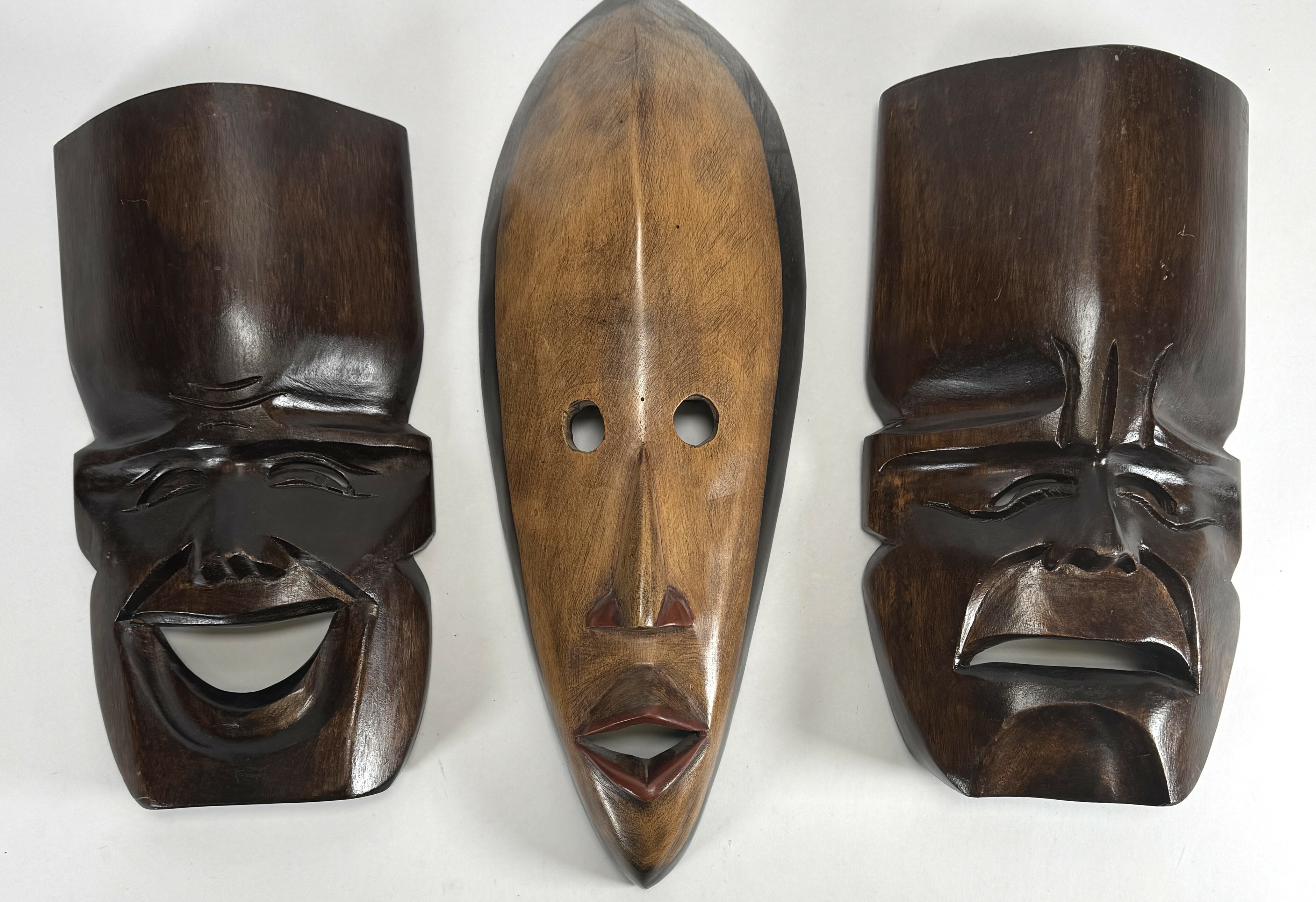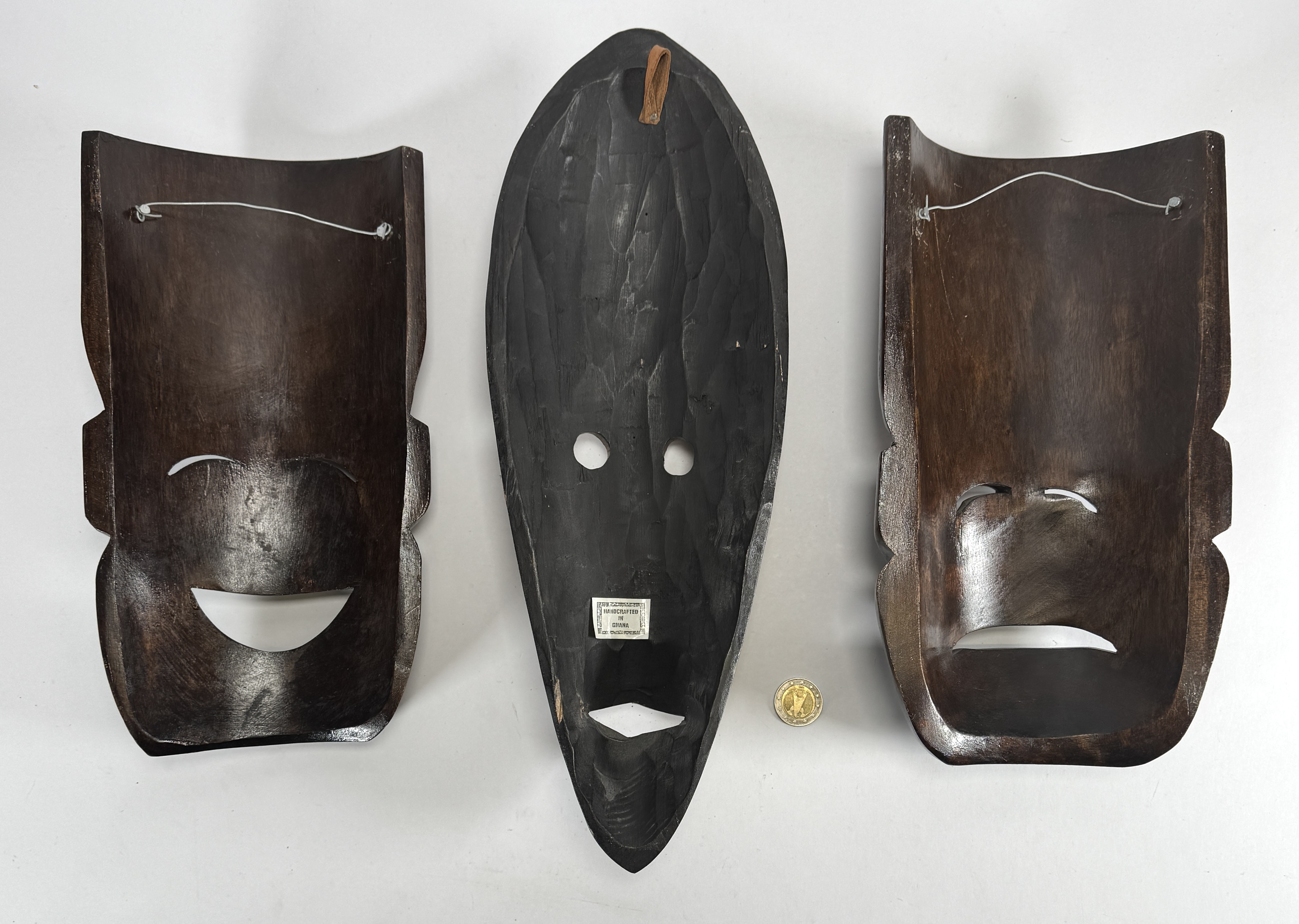 Houten wandmaskers uit Ghana, laat 20e eeuw, uitgevoerd in gepatineerd hout. Twee theatermaskers met expressieve komische en tragische gelaatstrekken en een ovaal masker met amandelvormige ogen en geprononceerde mond. Wil je direct deelnemen? Plaats vanaf 3 april alvast een schriftelijk bod via onze website! |