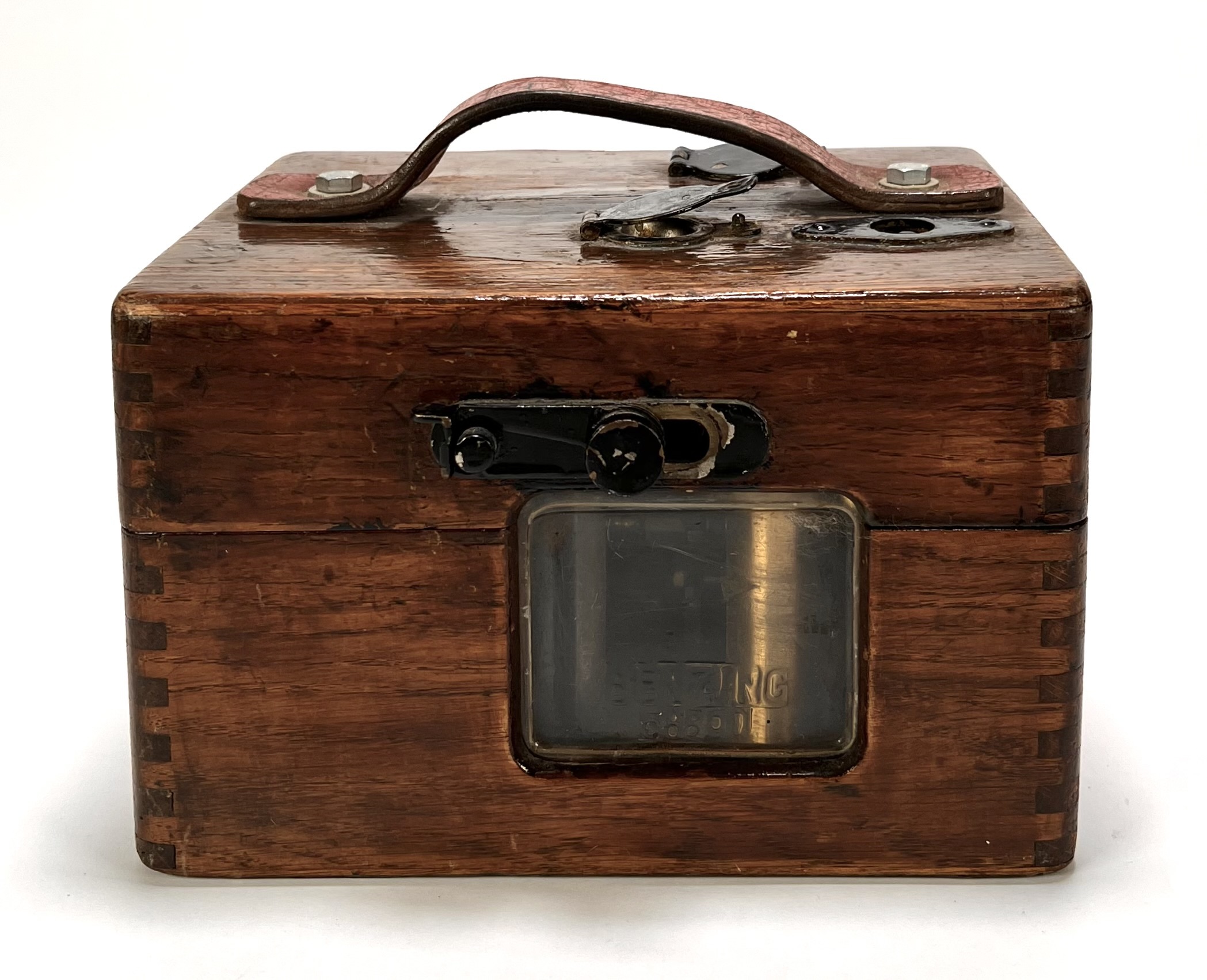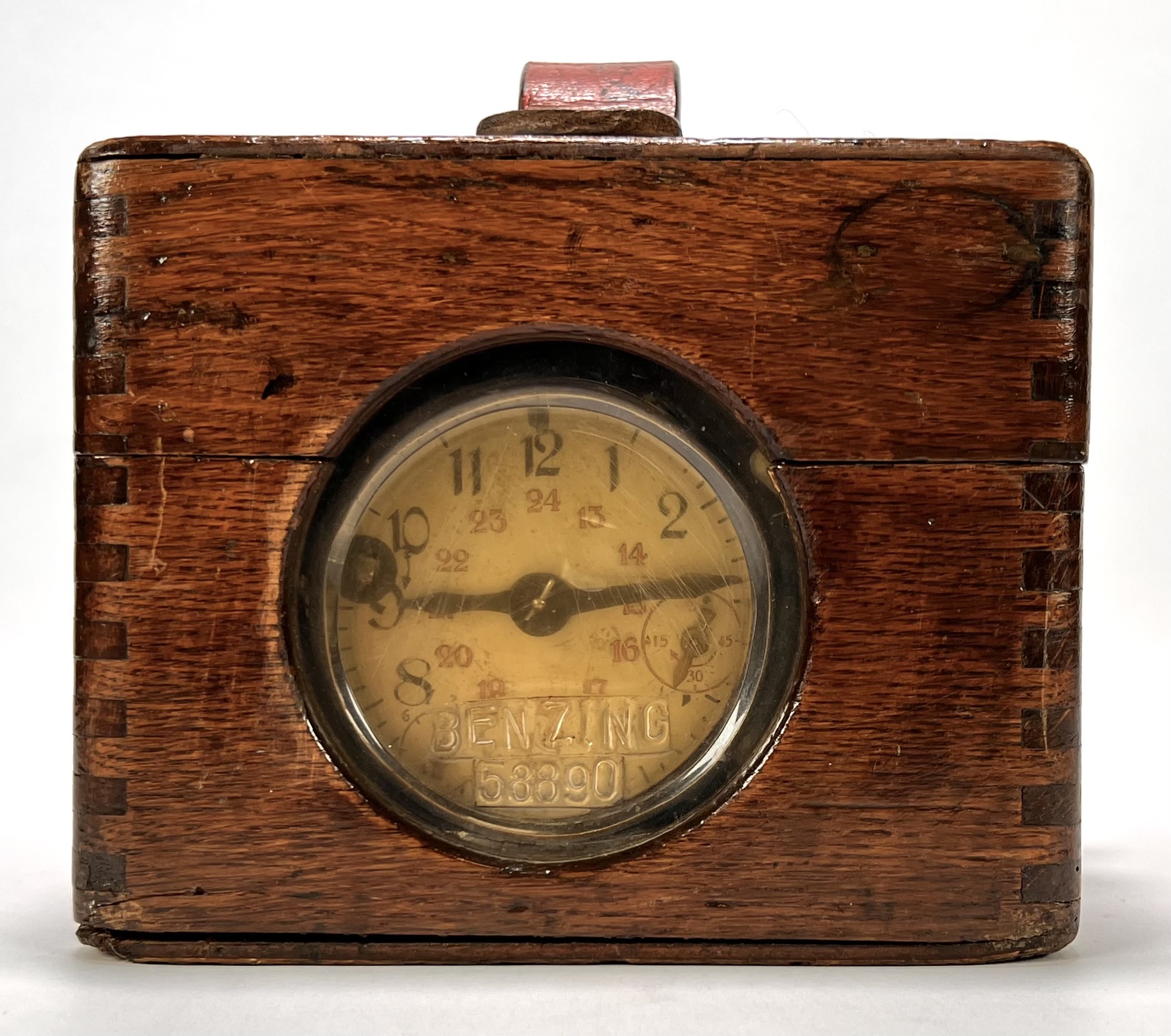 Duivenklok van Benzing vervaardigd uit eikenhout met een mechanisch uurwerk en roodbruin lederen handgreep. Gemerkt met fabrikant naam en serienummer 58890. De duivenklok heeft een Duitse herkomst en dateert uit de eerste helft van de 20e eeuw. Eerst de duivenklok zien voordat je biedt? Bezoek onze kijkdagen op 10, 11 en 12 april! |