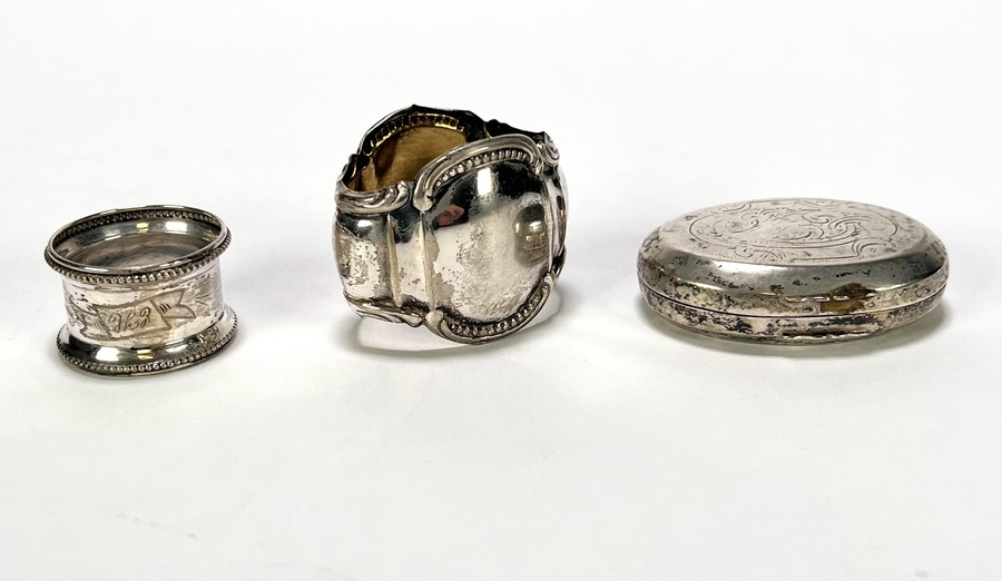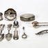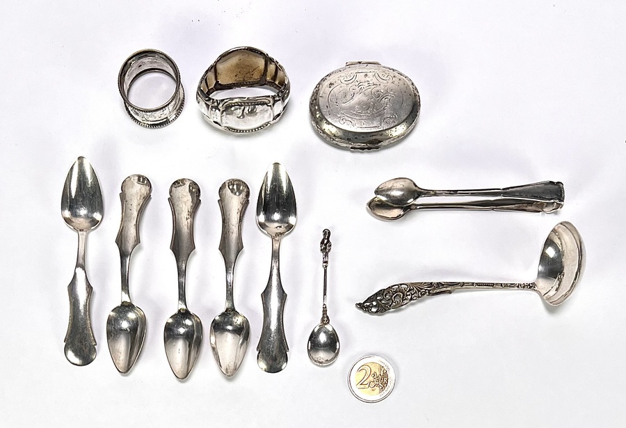 Convoluut zilver bestaande uit een gegraveerd doosje, twee servetringen, klontjestang, roomlepel, vijf theelepels en een mosterdlepeltje. Het tafelzilver is vervaardigd uit 835/1000 zilver. De verzameling dateert uit de negentiende en twintigste eeuw en gemerkt met diverse zilverkeuren. Geïnteresseerd? Bezoek onze kijkdagen op 10, 11 en 12 april van 11:00 tot 17:00 uur! |