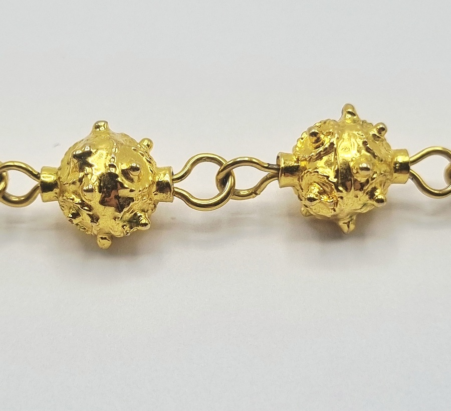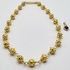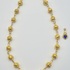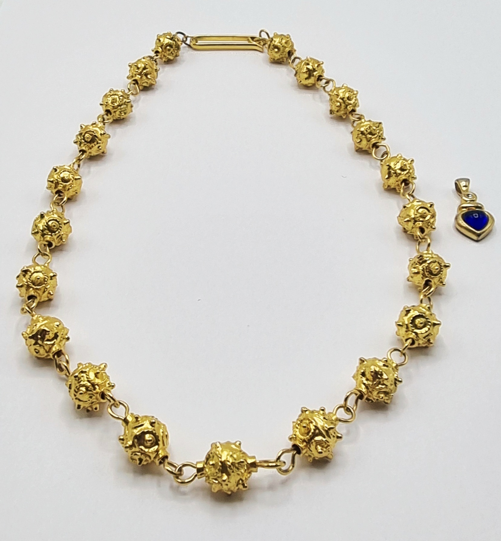 Goudkleurige halsketting met bijbehorende hanger, uitgevoerd met eenentwintig bolvormige schakels voorzien van een granulatie decoratie in traditionele stijl. De hartvormige hanger heeft een blauwe steen in een gladde zetting. Datering eind twintigste eeuw. Deze ketting zelf beoordelen? Je bent welkom op onze kijkdagen op 10, 11 en 12 april! |
