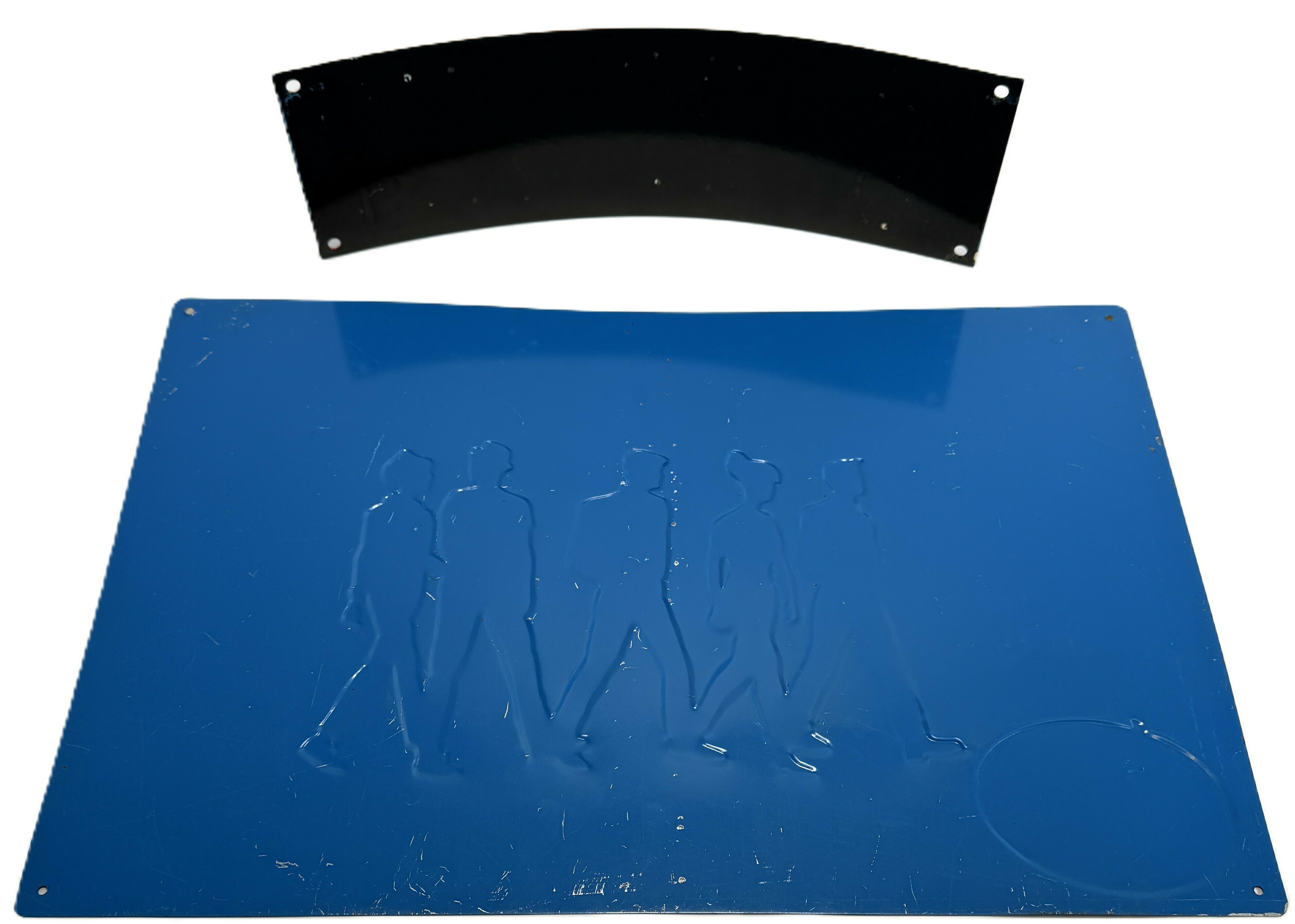 Twee reclameborden van Pepe Jeanswear. Het rechthoekig reclamebord toont een groep wandelaars in spijkerbroek in Pop Art stijl, gedrukt op blik. Het boogvormige reclamebord met vermelding "Pepe Belts" is geëmailleerd. De borden dateren uit de jaren negentig en hebben een Europese herkomst. Geïnteresseerd? Bezoek onze kijkdagen op 10, 11 en 12 april van 11:00 tot 17:00 uur! |