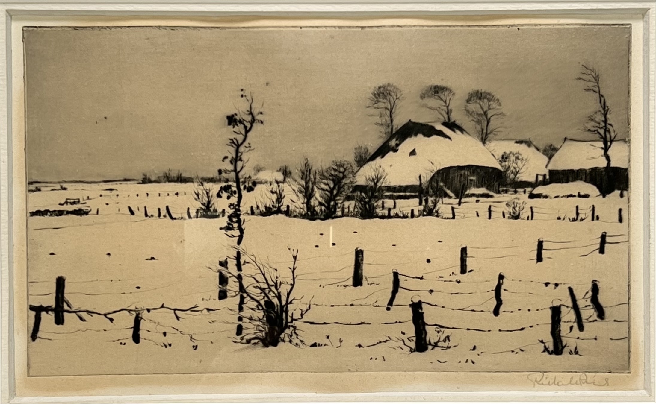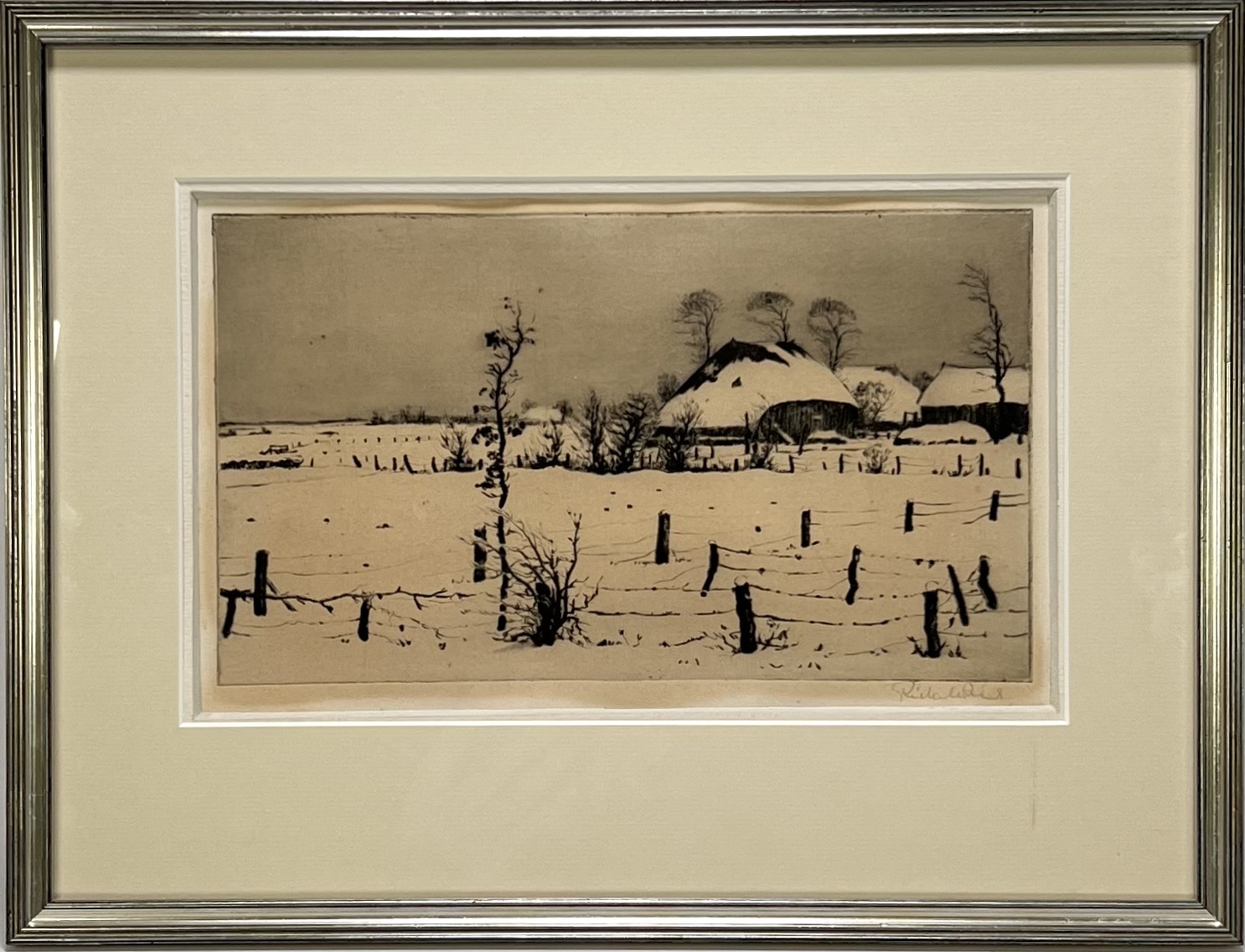 Ets door Riekele Prins (1905–1954) toont een besneeuwd landschap met boerderijen in naturalistische stijl, uitgevoerd in etstechniek op papier. De ets wordt gekenmerkt door een hekwerk op de voorgrond en gedetailleerde rietgedekte daken onder een dik sneeuwdek. Gesigneerd rechtsonder, datering midden 20e eeuw en een Groningse herkomst. De ets zelf beoordelen? Je bent welkom op onze kijkdagen op 10, 11 en 12 april! |