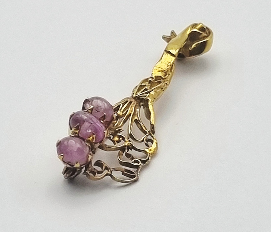 Broche uit de Art Nouveau periode, vervaardigd uit getoetst 21-karaats geelgoud met ajour uitgevoerd goudwerk en drie cabochon geslepen sterrobijnen in klauwzettingen. De broche toont een opengewerkte rank met bladornament en een compacte tros van sterrobijnen De broche dateert uit circa 1900–1910. Geïnteresseerd? Bezoek onze kijkdagen op 10, 11 en 12 april van 11:00 tot 17:00 uur! |