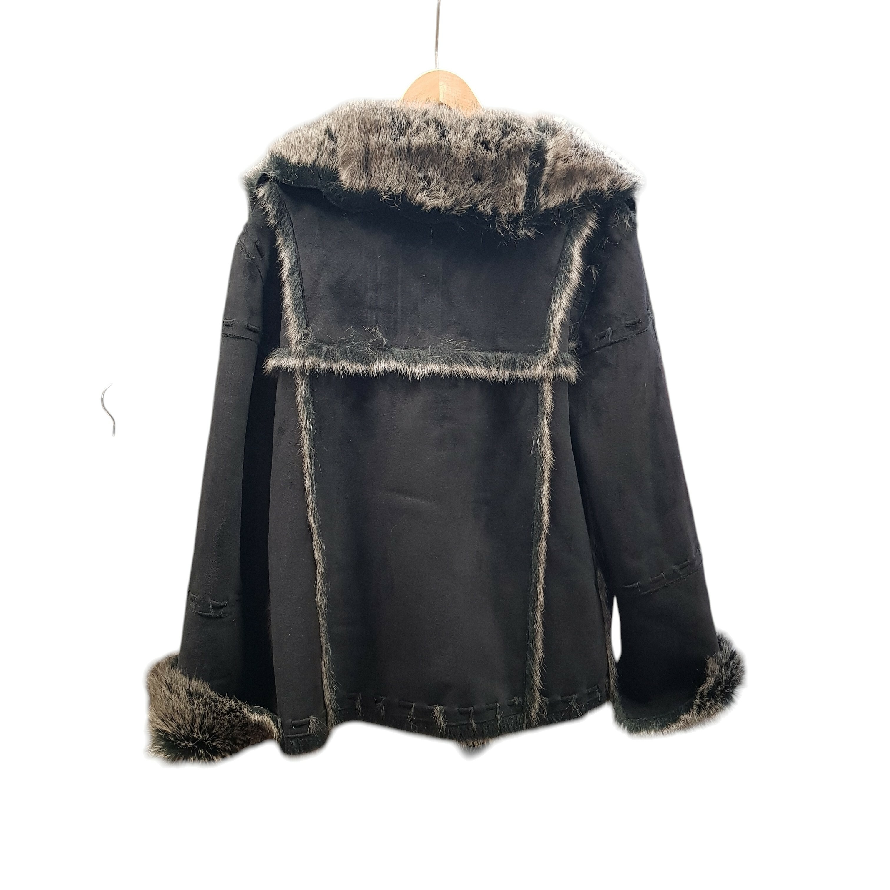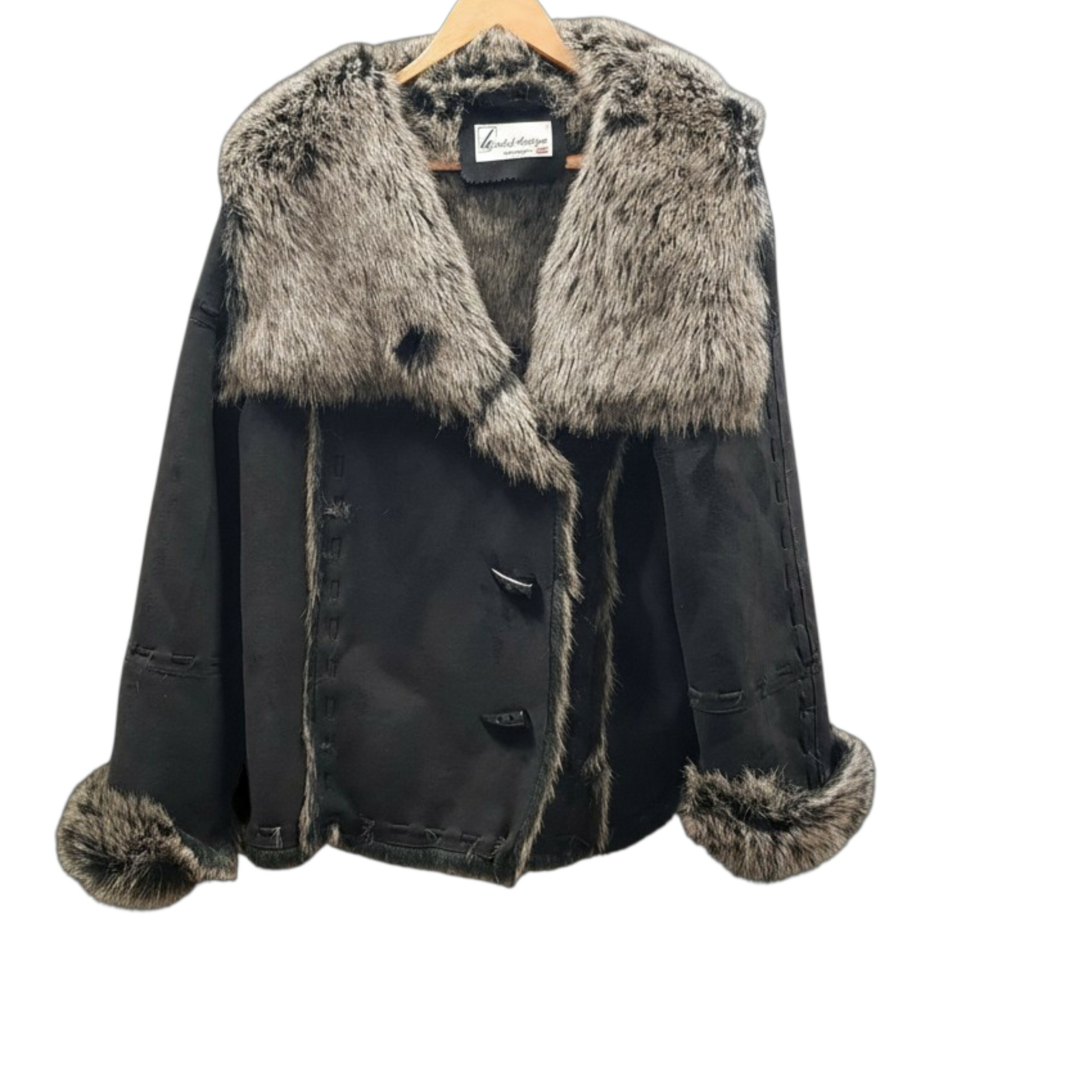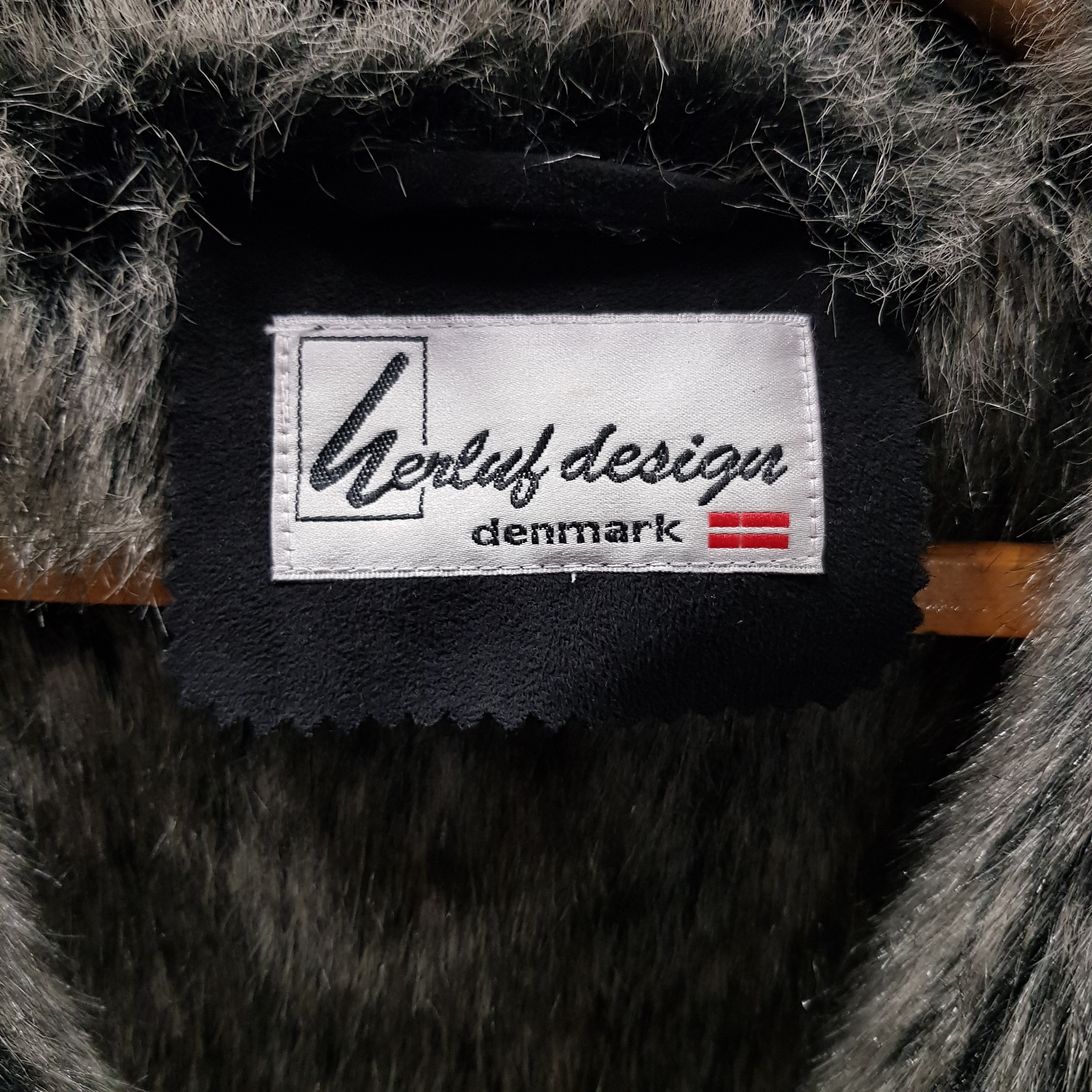 Jas van Herluf Design Denmark, met een zwart suèdelook textiel met afwerkingen van imitatiebont. De jas toont een brede kraag en manchetten van faux fur, gecombineerd met een klassieke houtje-touwtje sluiting aan de voorzijde. De jas dateert uit de eind 20e eeuw en heeft een herkomst in Denemarken. Geïnteresseerd? Bezoek onze kijkdagen op 10, 11 en 12 april van 11:00 tot 17:00 uur! |