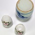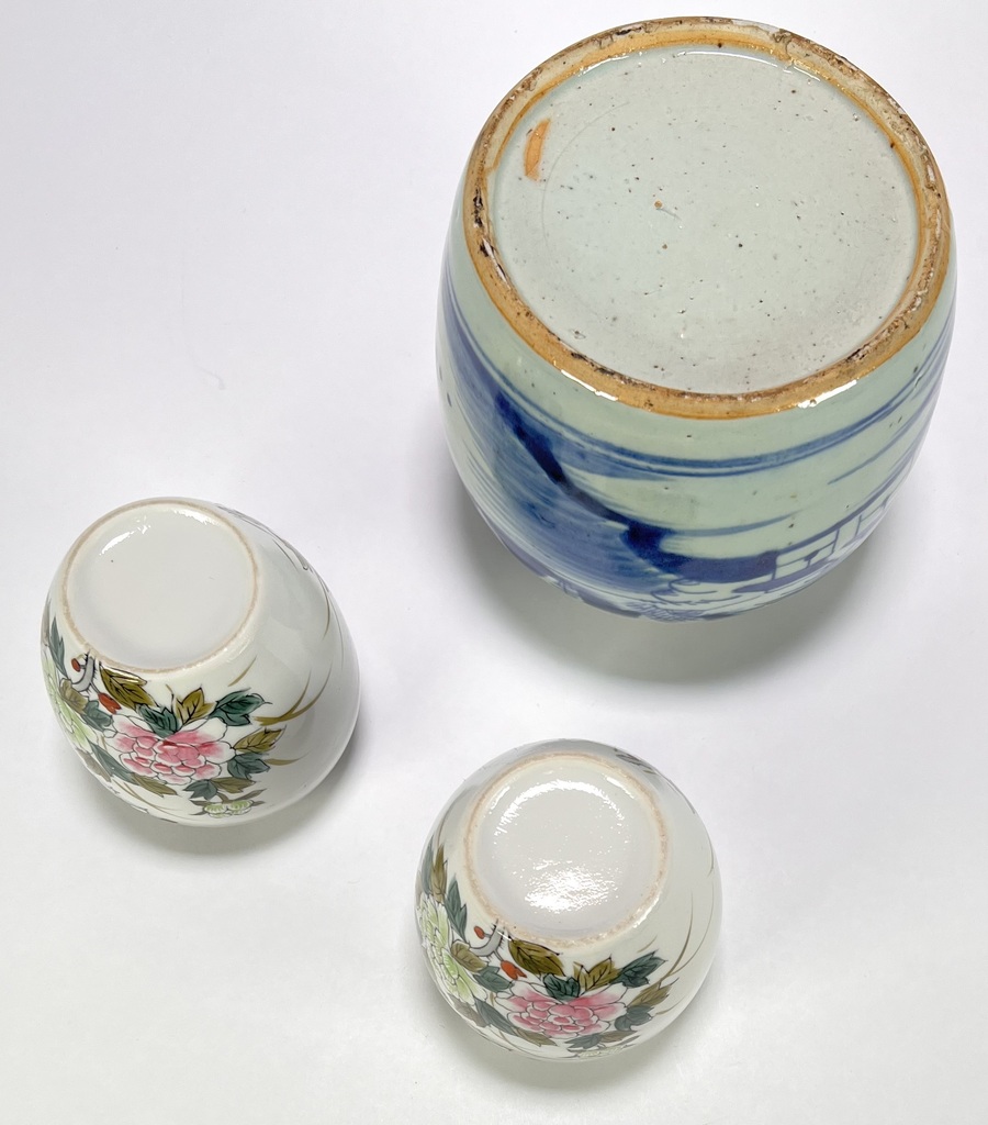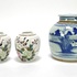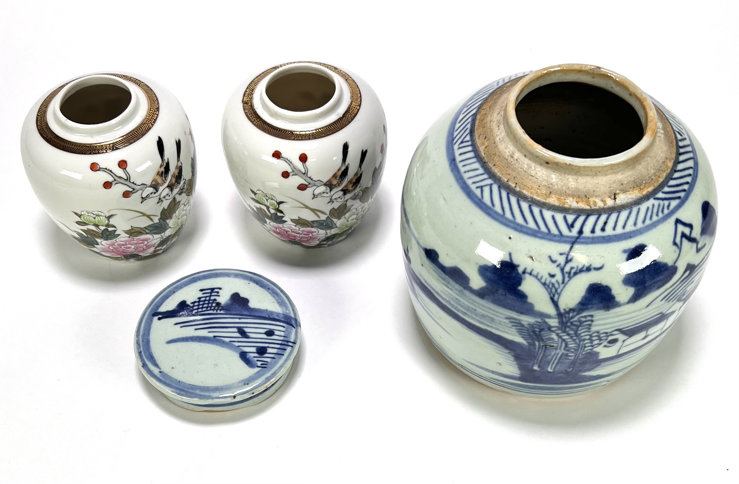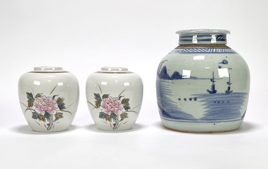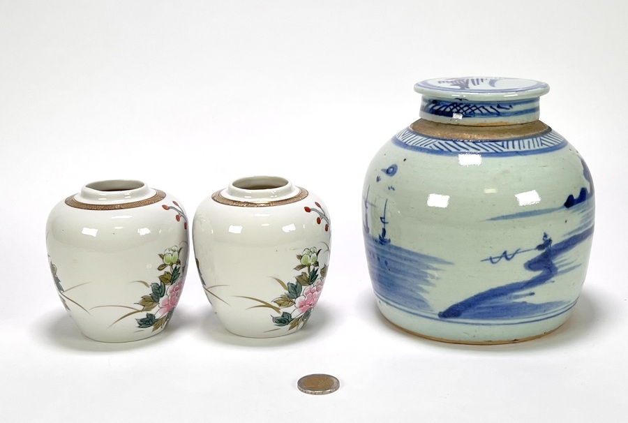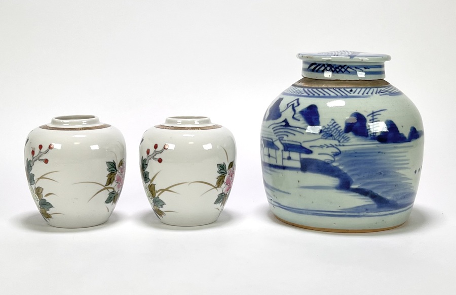 Porseleinen gemberpotten bestaande uit een grote Chinese gemberpot en een paar kleine Japanse Kutani gemberpotten. De grotere gemberpot toont een rivierlandschap in onderglazuur blauw, de kleinere gemberpotten zijn gedecoreerd met vogels en bloemen. Daterend late negentiende en de twintigste eeuw. Klaar om te bieden? Registreer je nu en doe mee aan de veiling! |