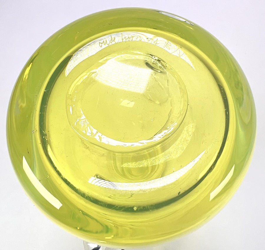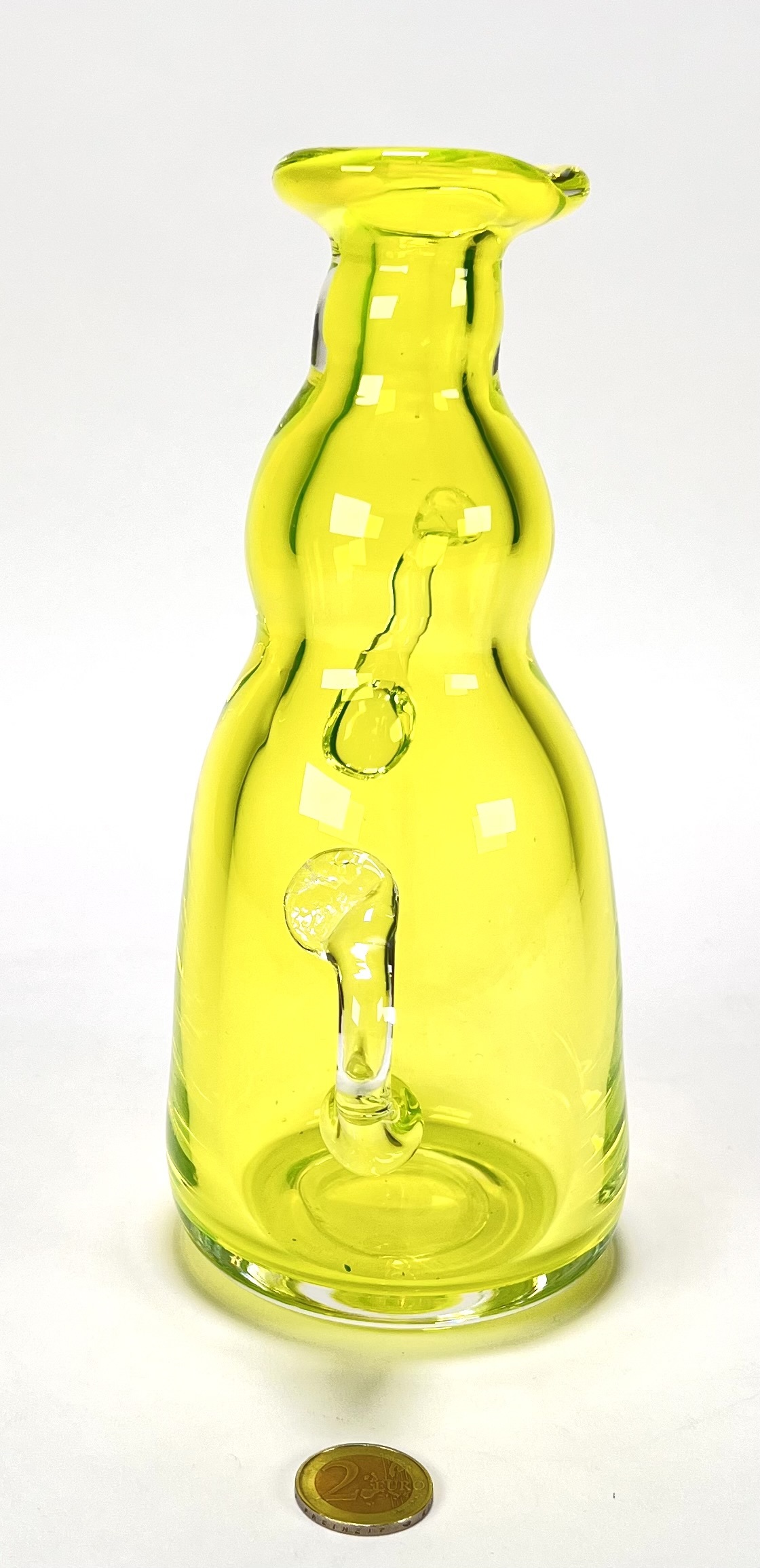 Een glaskunstobject, een kan met twee oren, ontwerp Bernard Heesen (1958) en Yvon Trossèl (1962) uit de moderne periode, vervaardigd uit mondgeblazen glas in een fluorescerend geelgroene tint. De kan toont een organisch gevormde corpus met twee asymmetrische oren van helder glas en een golvende rand. Gesigneerd aan de onderzijde Oude Horn '94 en B/Y (Bernard en Yvon), herkomst Nederland. Klaar om te bieden? Registreer je nu en doe mee aan de veiling!! |