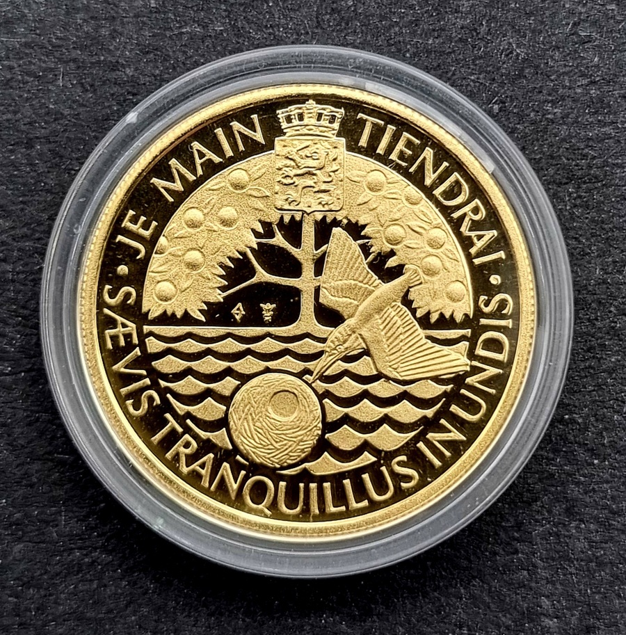 Herdenkingsmunt van Het Nederlandsche Muntenhuis, vervaardigd uit goud (916/1000) met proof-slag. De voorzijde toont haar portret voor Paleis Noordeinde en het geboortejaar 1938. Op de keerzijde staan een gekroonde Oranjeboom, wapenschild en ijsvogel boven golven met het devies “Je Maintiendrai – Saevis Tranquillus in Undis”. De herdenkingsmunt dateert uit eind 20e eeuw en heeft een Nederlandse herkomst. Zeker zijn van deelname? Plaats vanaf 3 april een schriftelijk bod online! |