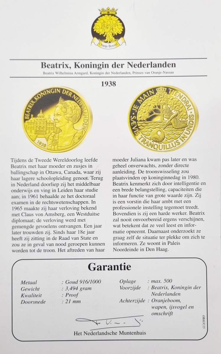 Gouden herdenkingsmunt - Beatrix, Koningin der Nederlanden, eind 20e eeuw