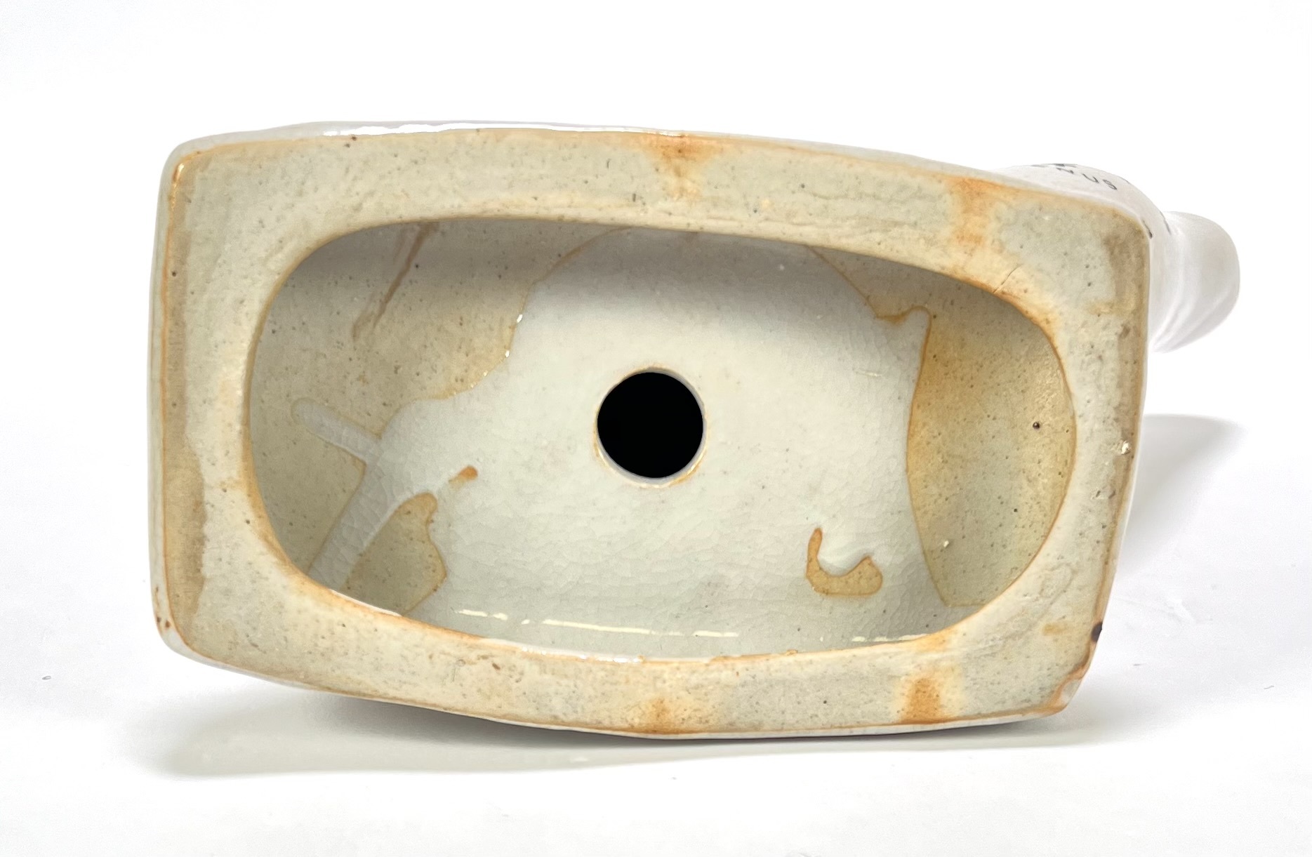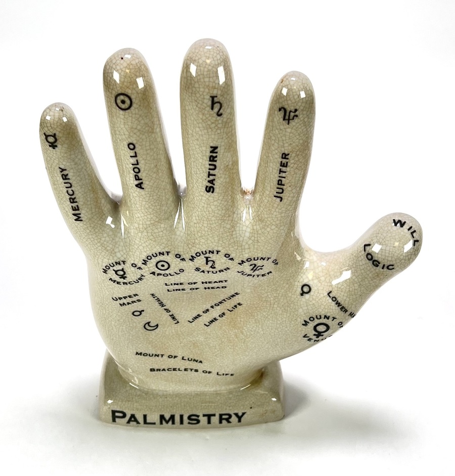 Beeld vervaardigd uit geglazuurd aardewerk met zwarte transferdruk op een crèmekleurige ondergrond. Het model in de vorm van een rechterhand toont diverse chiromantische lijnen en astrologische symbolen, waaronder de planeten op de vingertoppen. De vormgeving is ontleend aan historische handlijnkunde modellen. Datering eind 20e eeuw en een Britse herkomst. Jouw collectie verdient dit beeldje. Schrijf je in! |