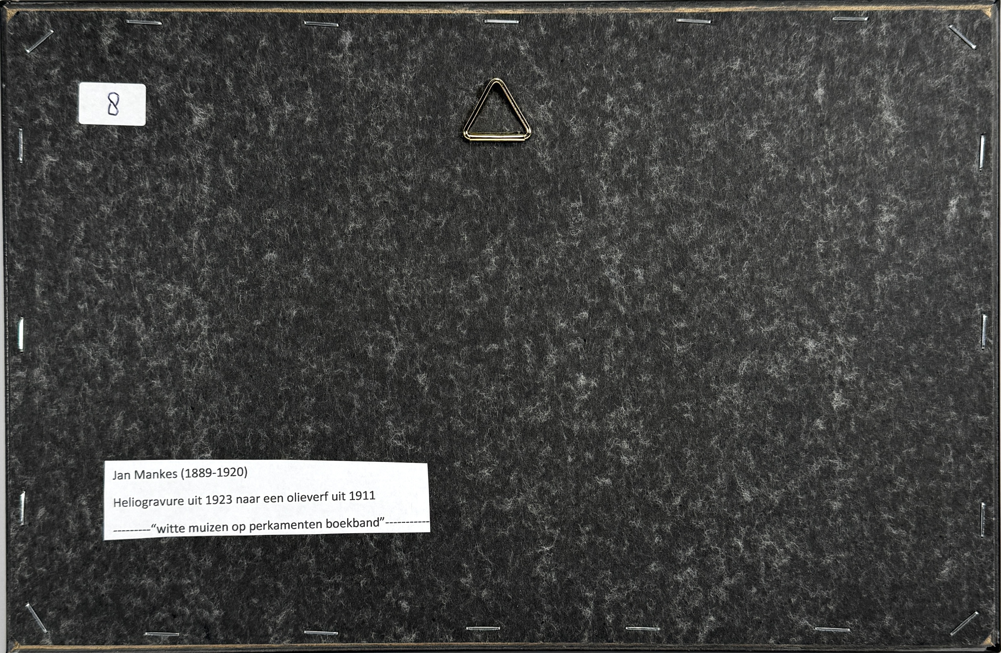| Kavelnummer en naam | 1098. Heliogravure, Jan Mankes - “Witte muizen op perkamenten boekband”, 1923 | |